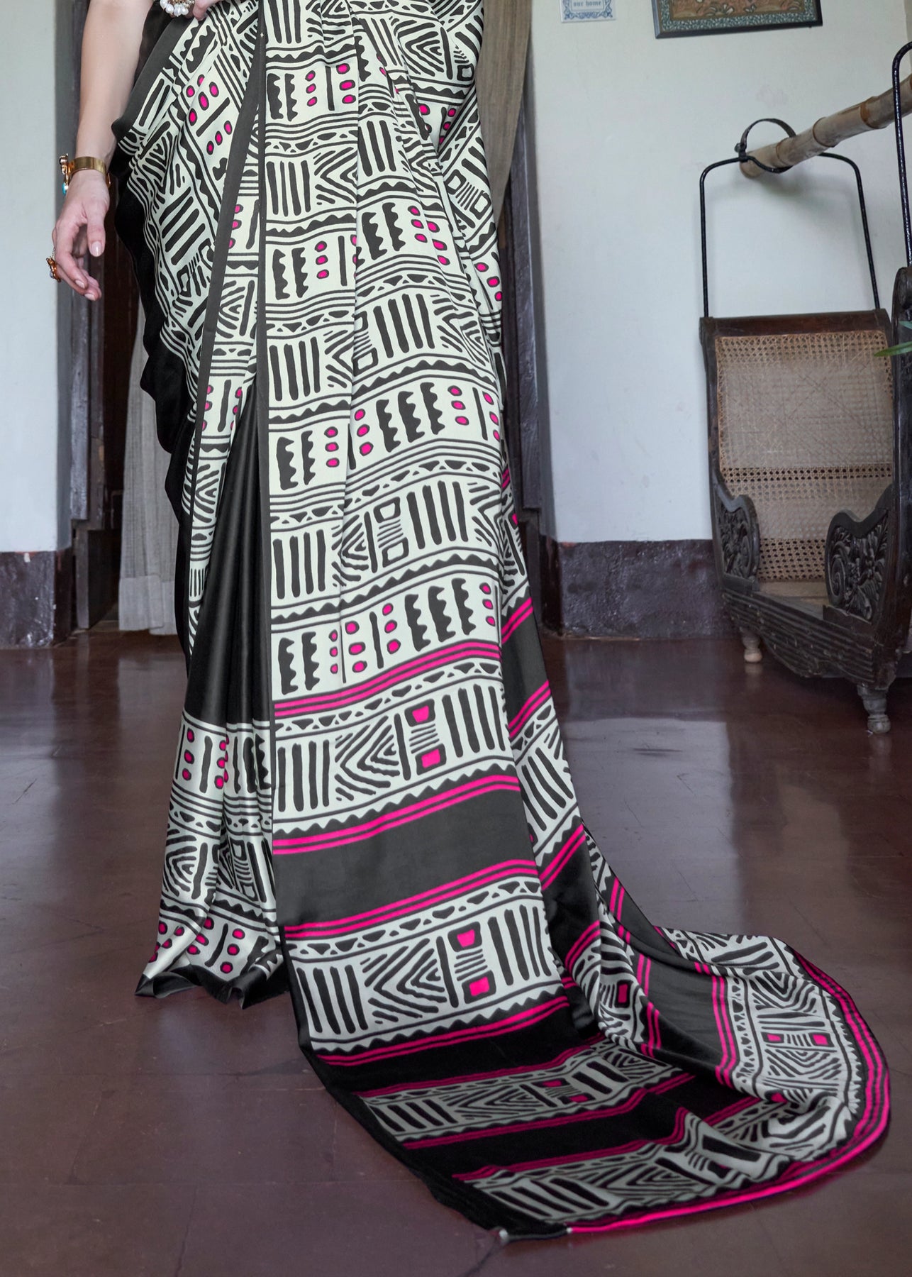 Olive Black Printed Crepe Satin Silk Saree