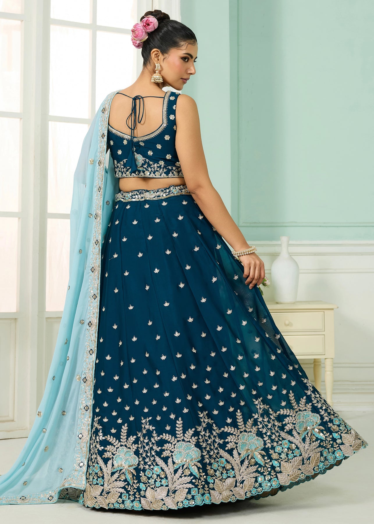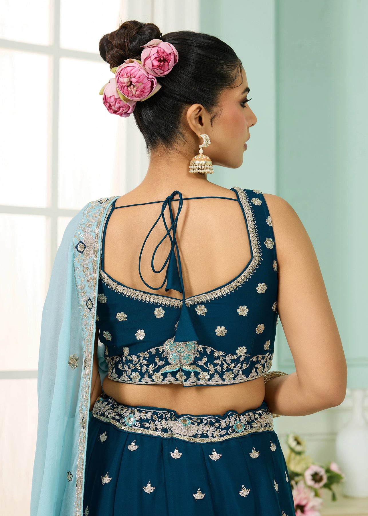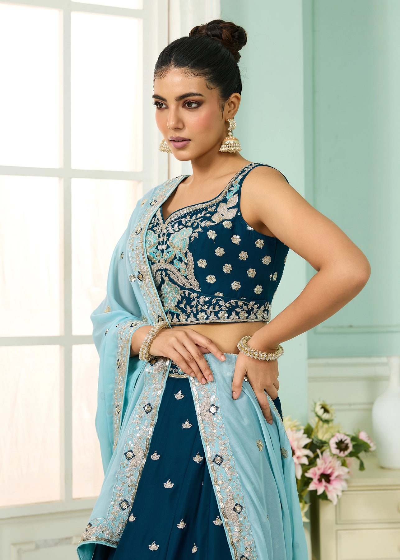 Teal Blue Georgette Embroidered Sequins Lehenga Set
