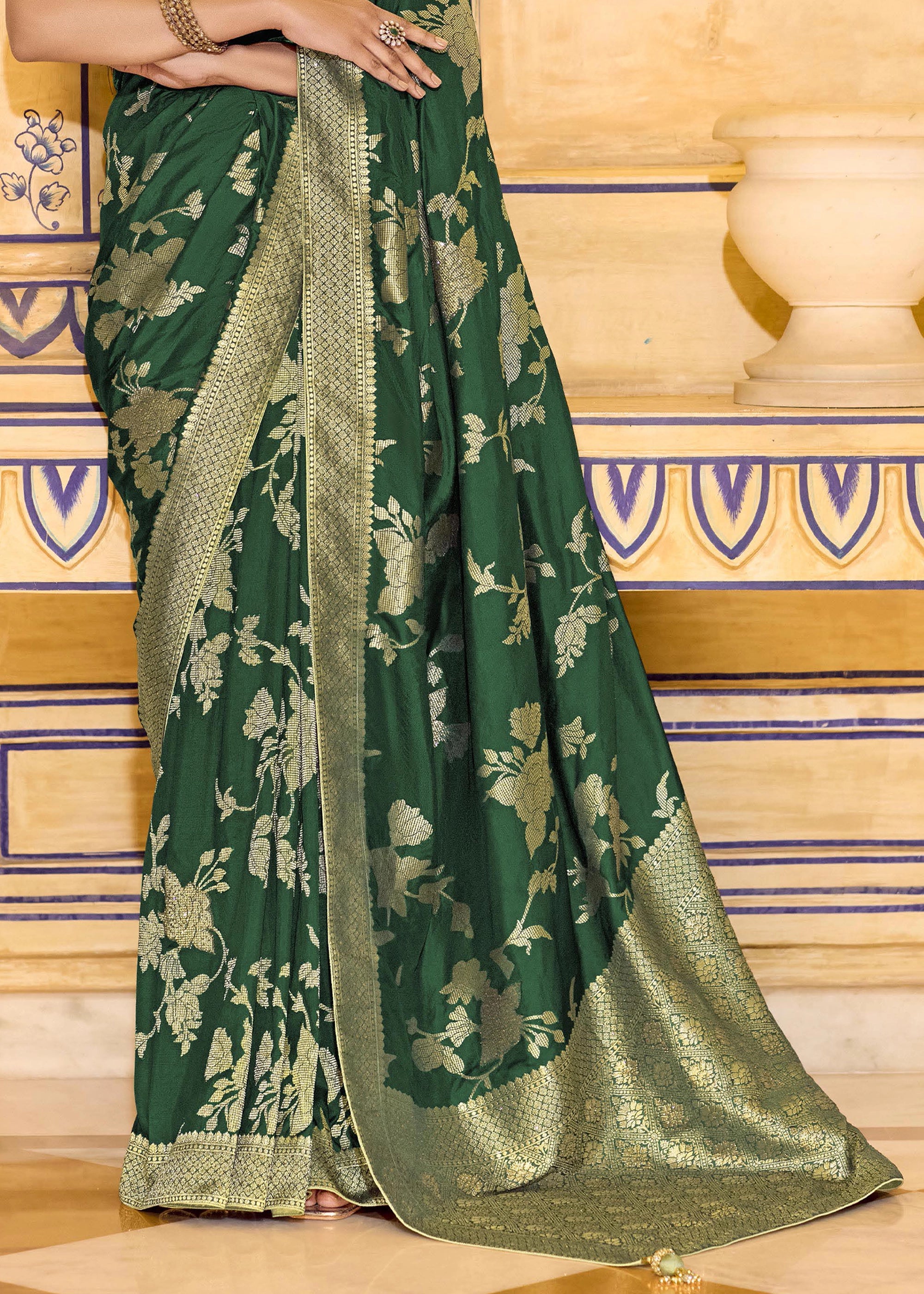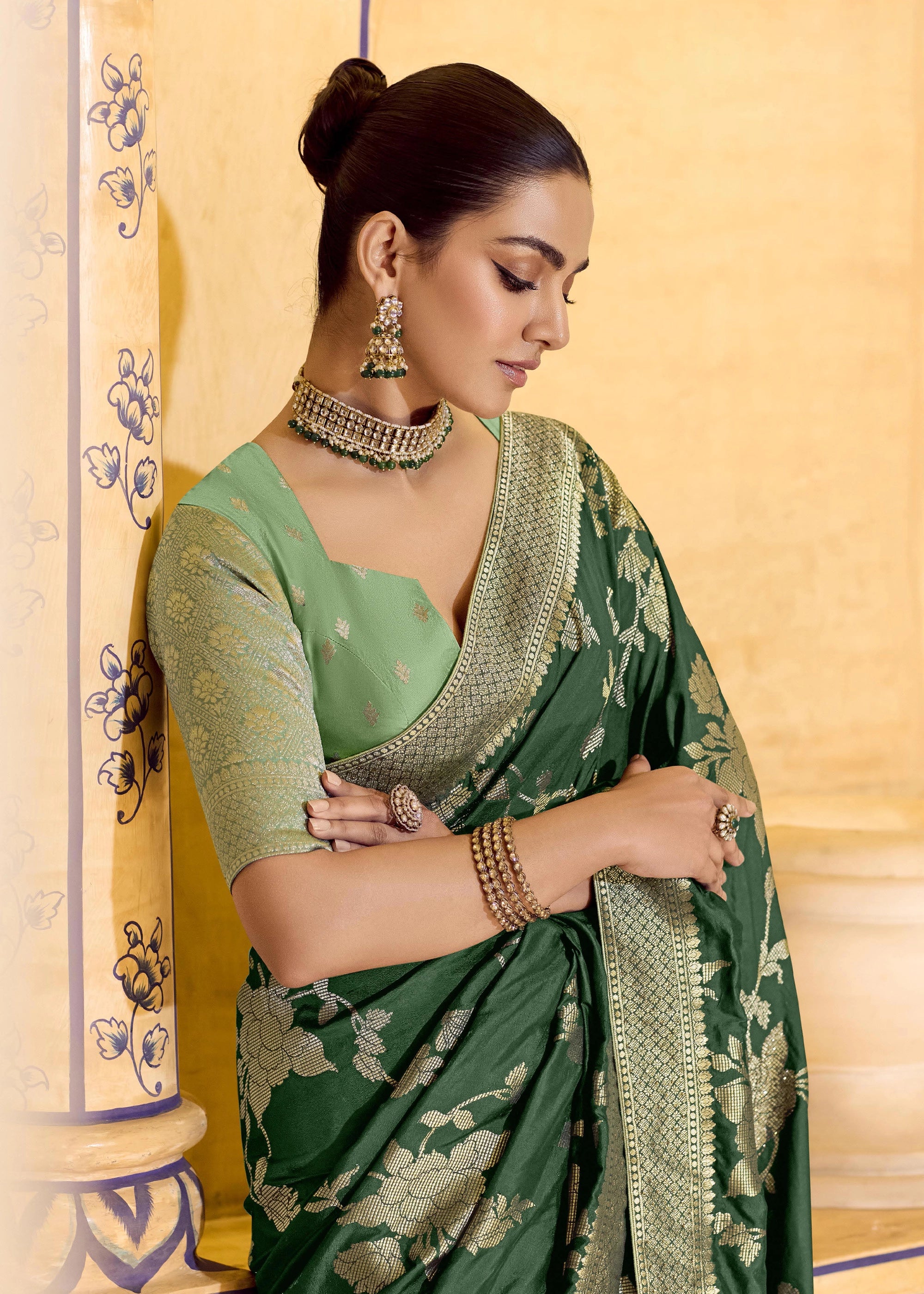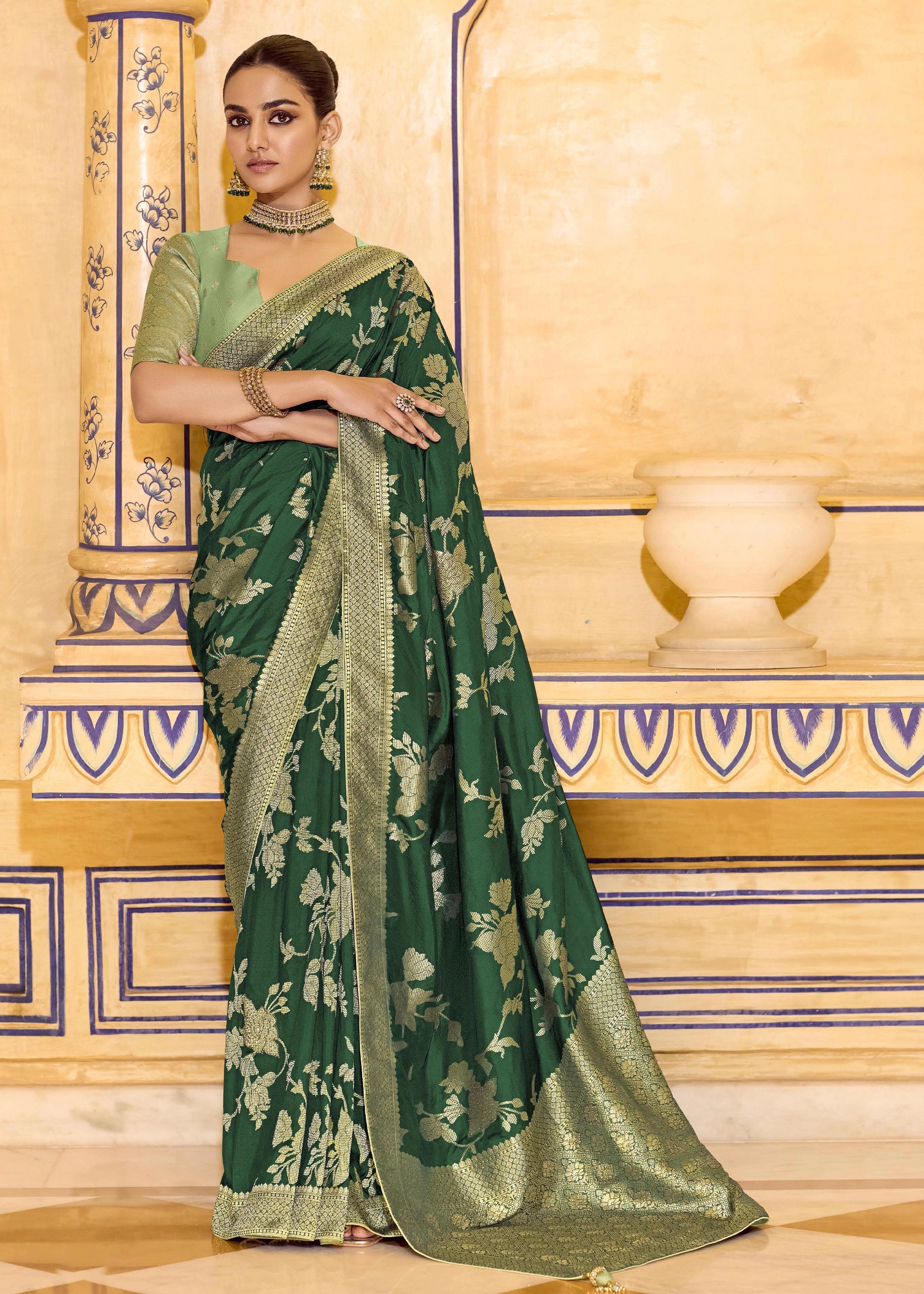 This silk saree shimmers with regal splendor. Its opulent silk threads create a rich texture and a captivating sheen.  Intricate zari work, often in gold or silver, intricately weaves traditional motifs like paisleys, florals, and geometric patterns across the fabric.