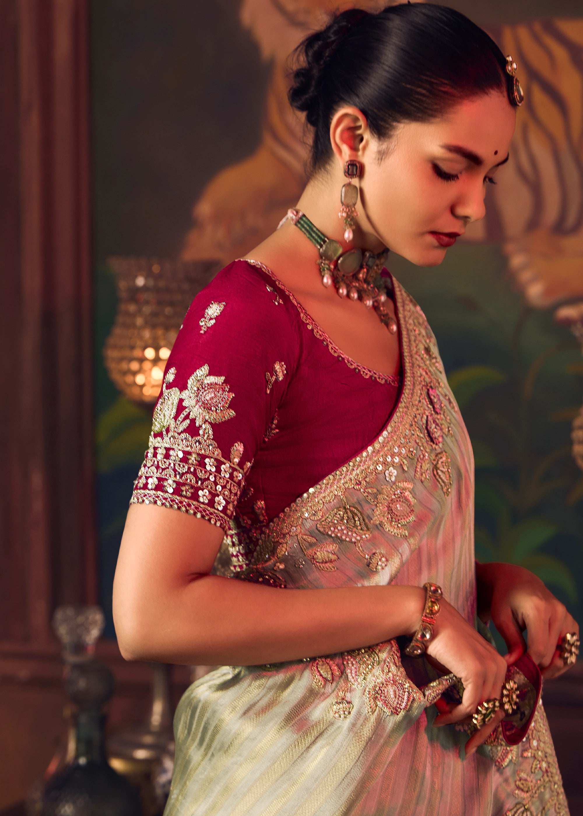A stunning model in a lustrous saree with intricate multi-colored thread work and zari embroidery, paired with a rich, contrasting blouse.The elegant design and opulent fabric make it perfect for grand wedding events and formal reception