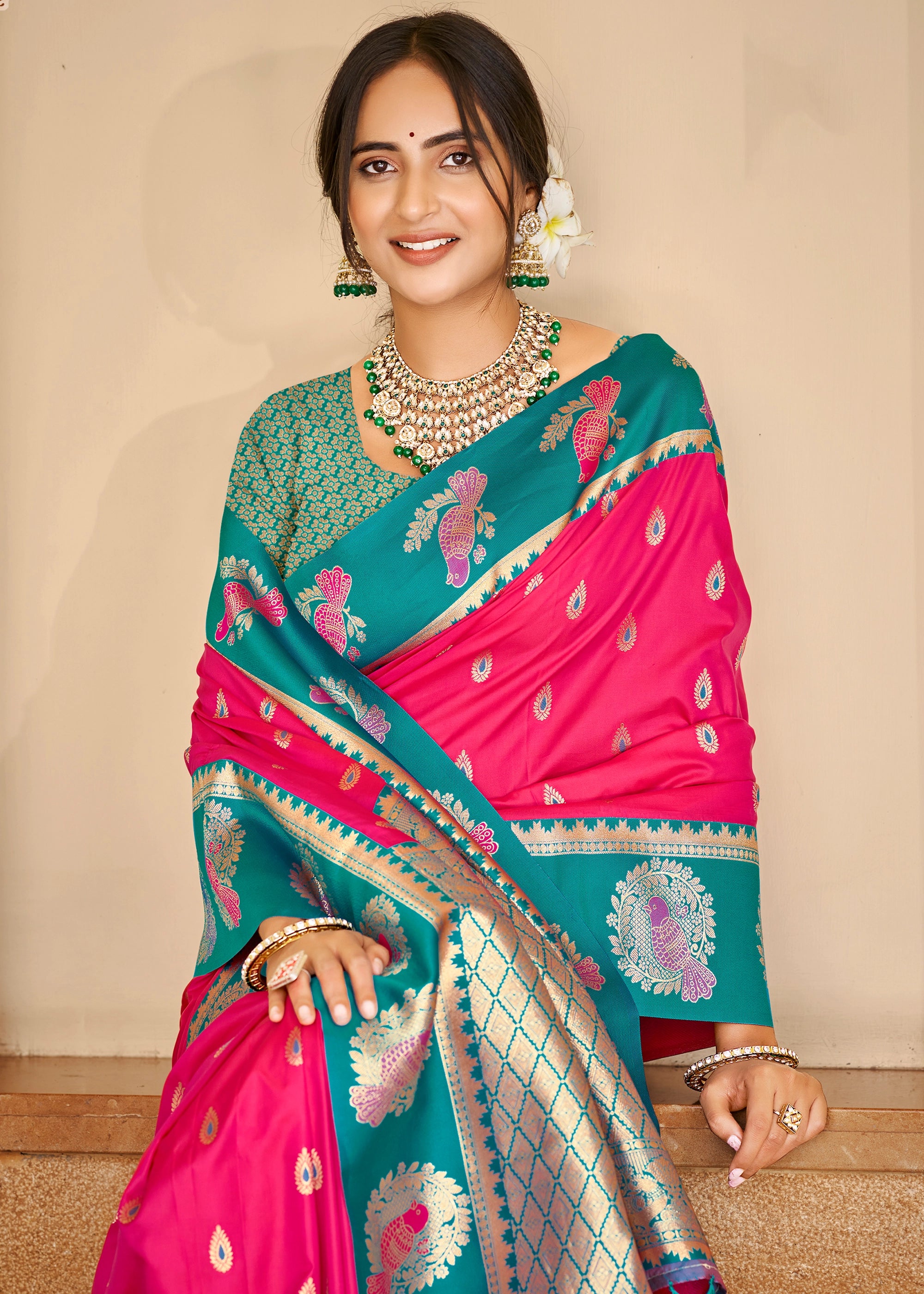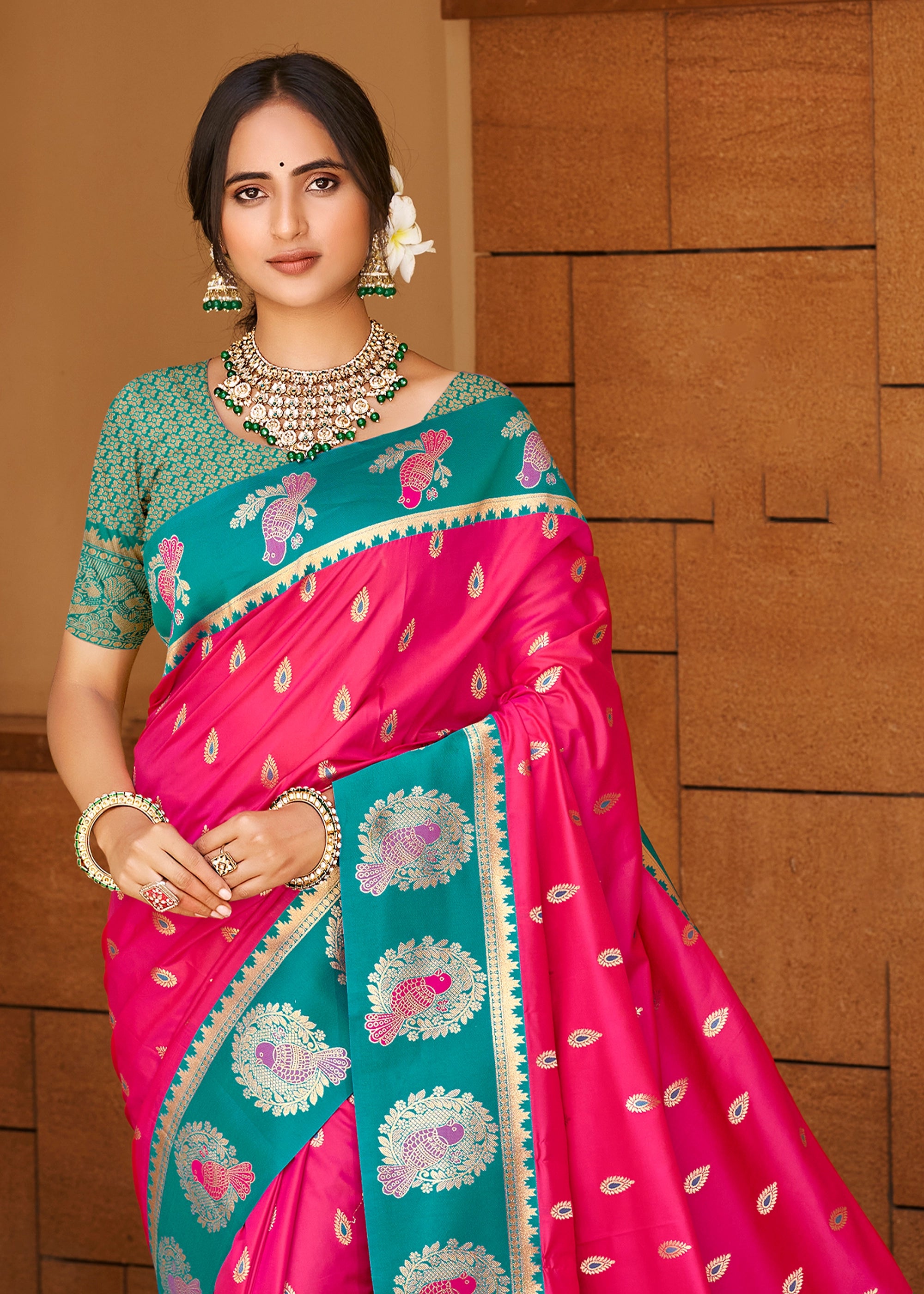 Drape yourself in this stunning saree, featuring vibrant borders and intricate weaving. Perfect for traditional events or weddings, this attire showcases elegant zari work for a touch of timeless charm.