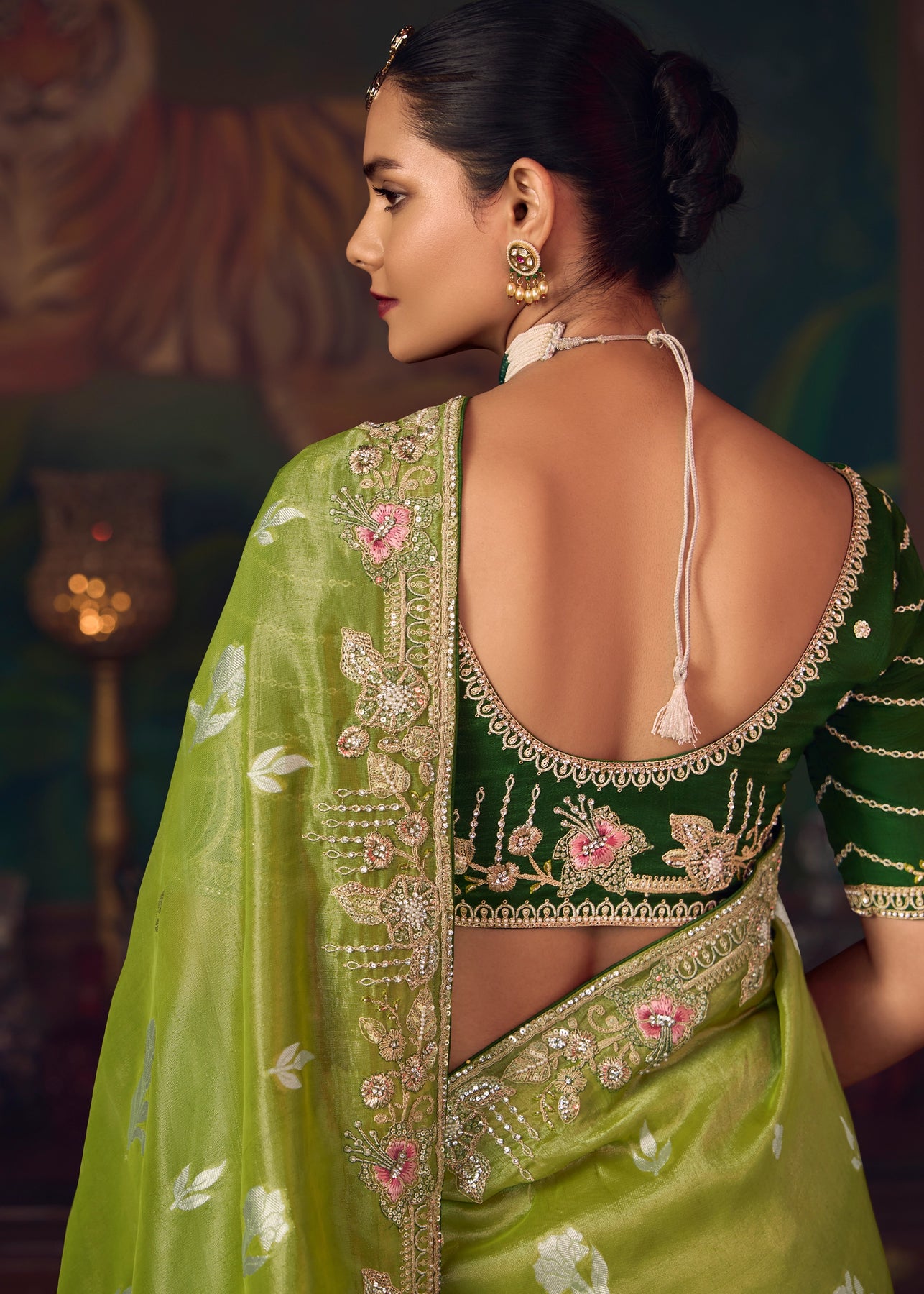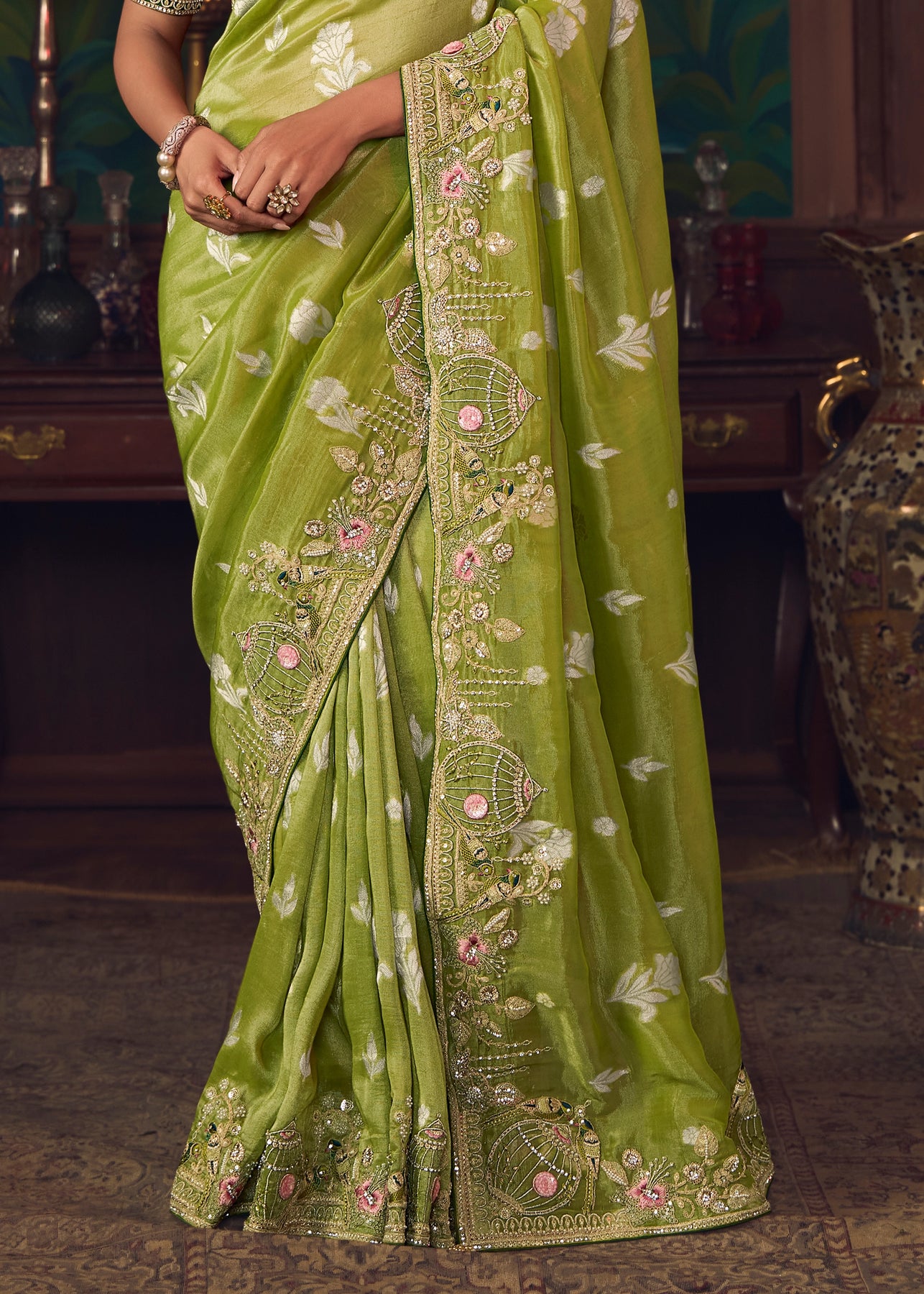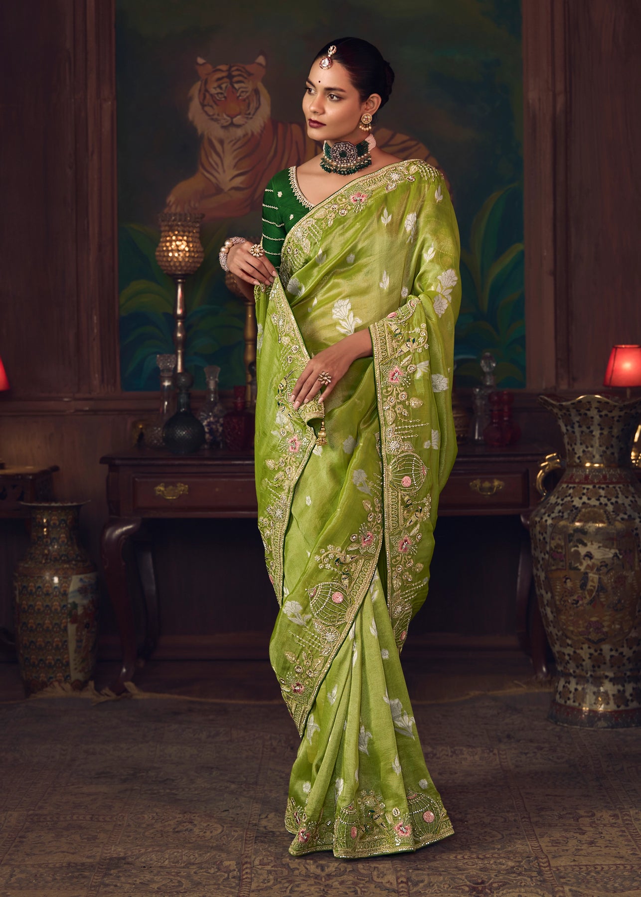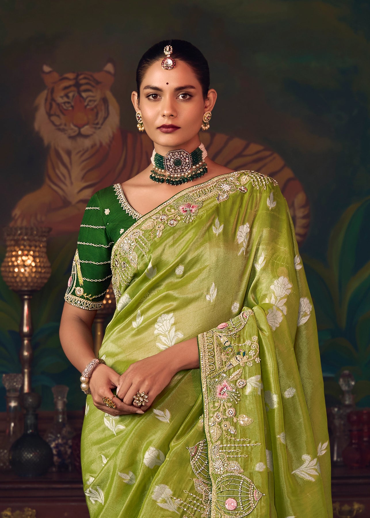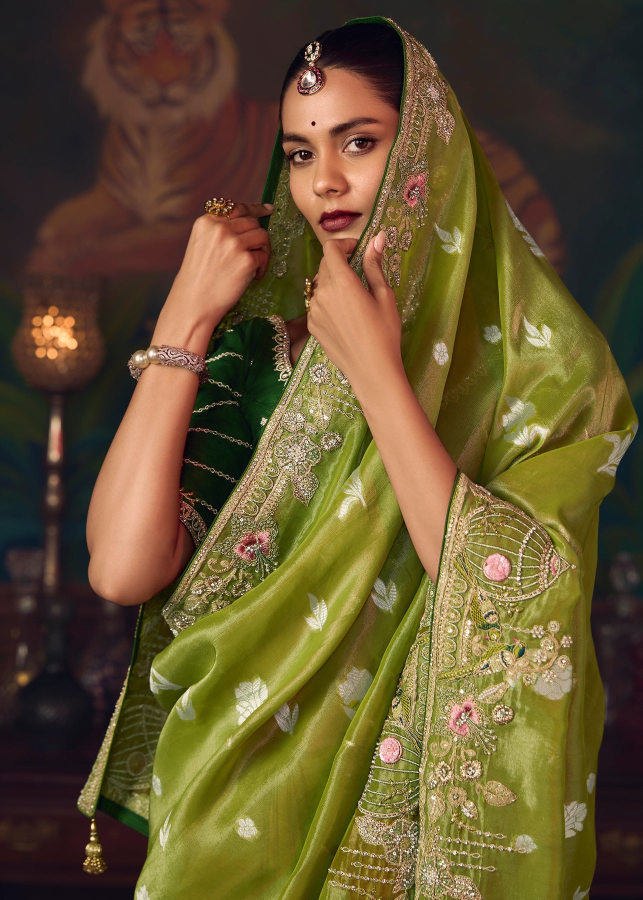 “Exclusive Offer” : Tropical Green Woven Embroidered Silk Saree