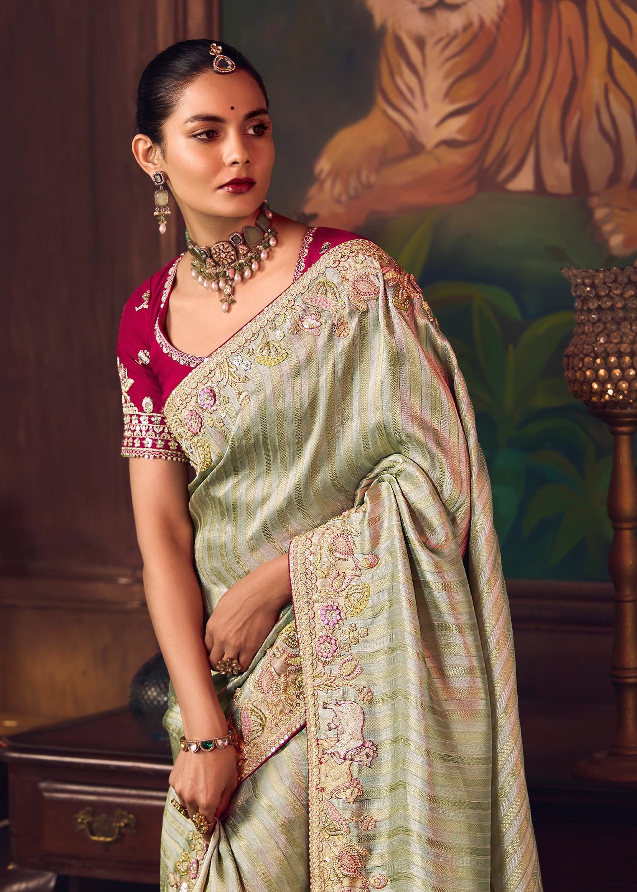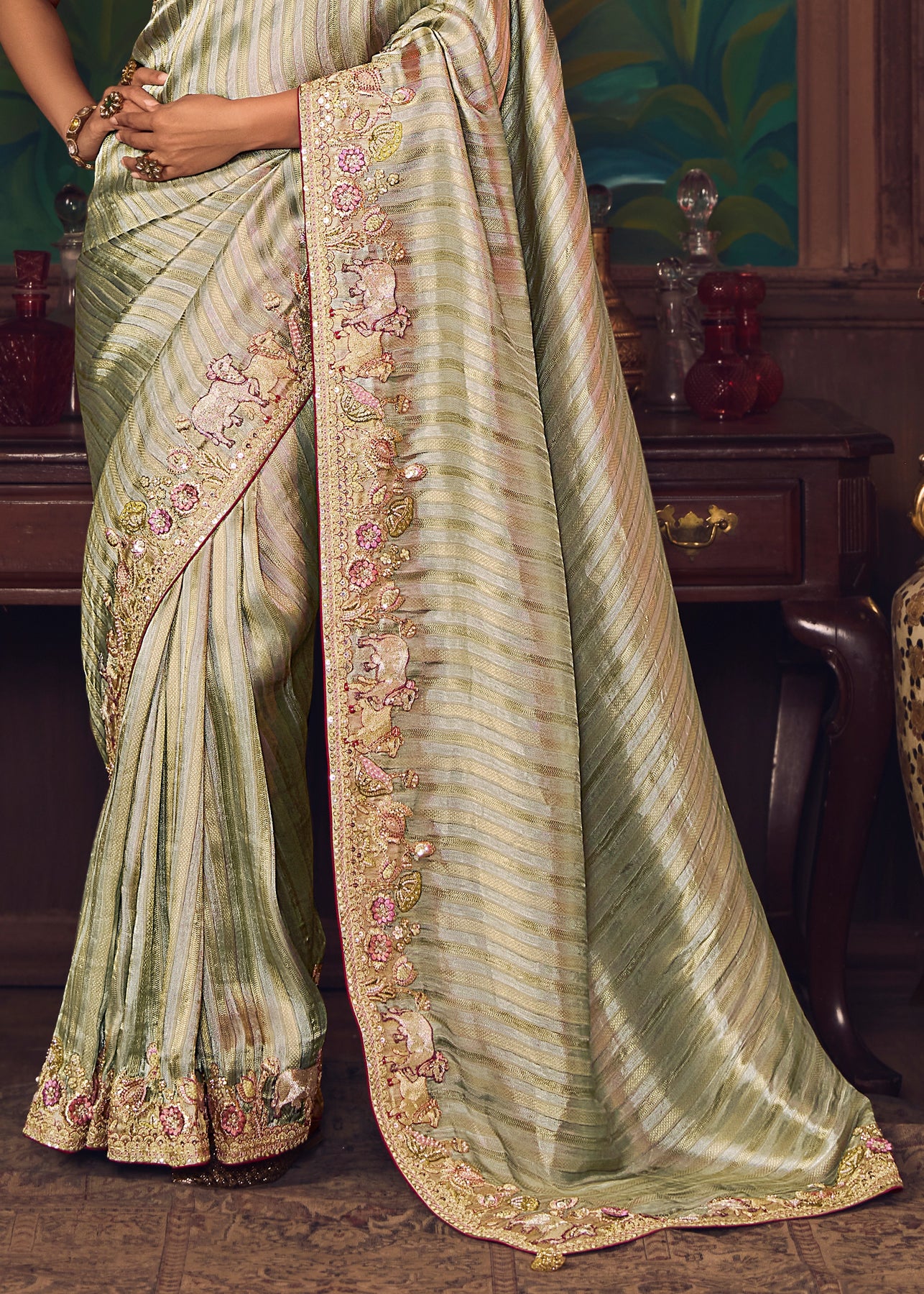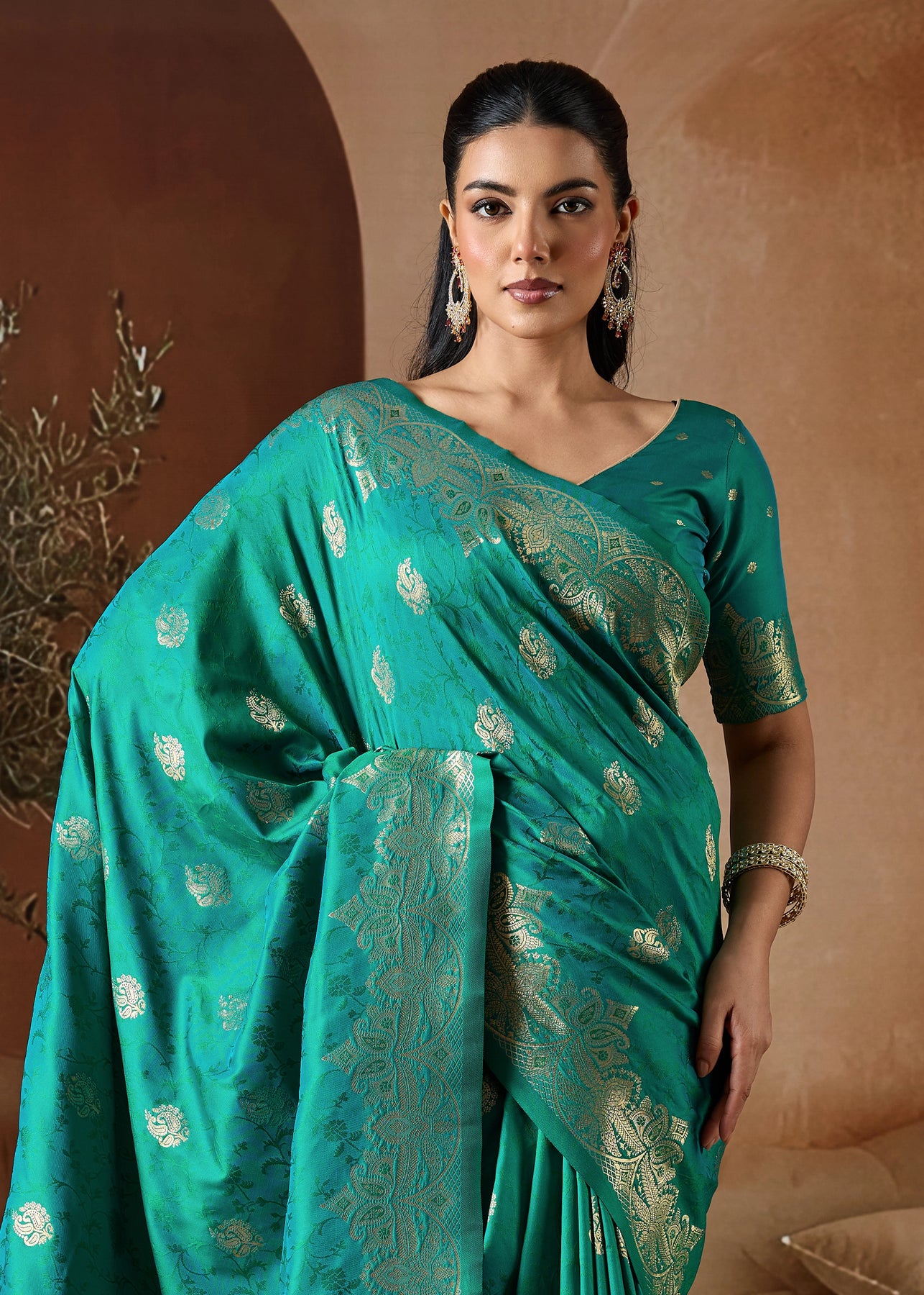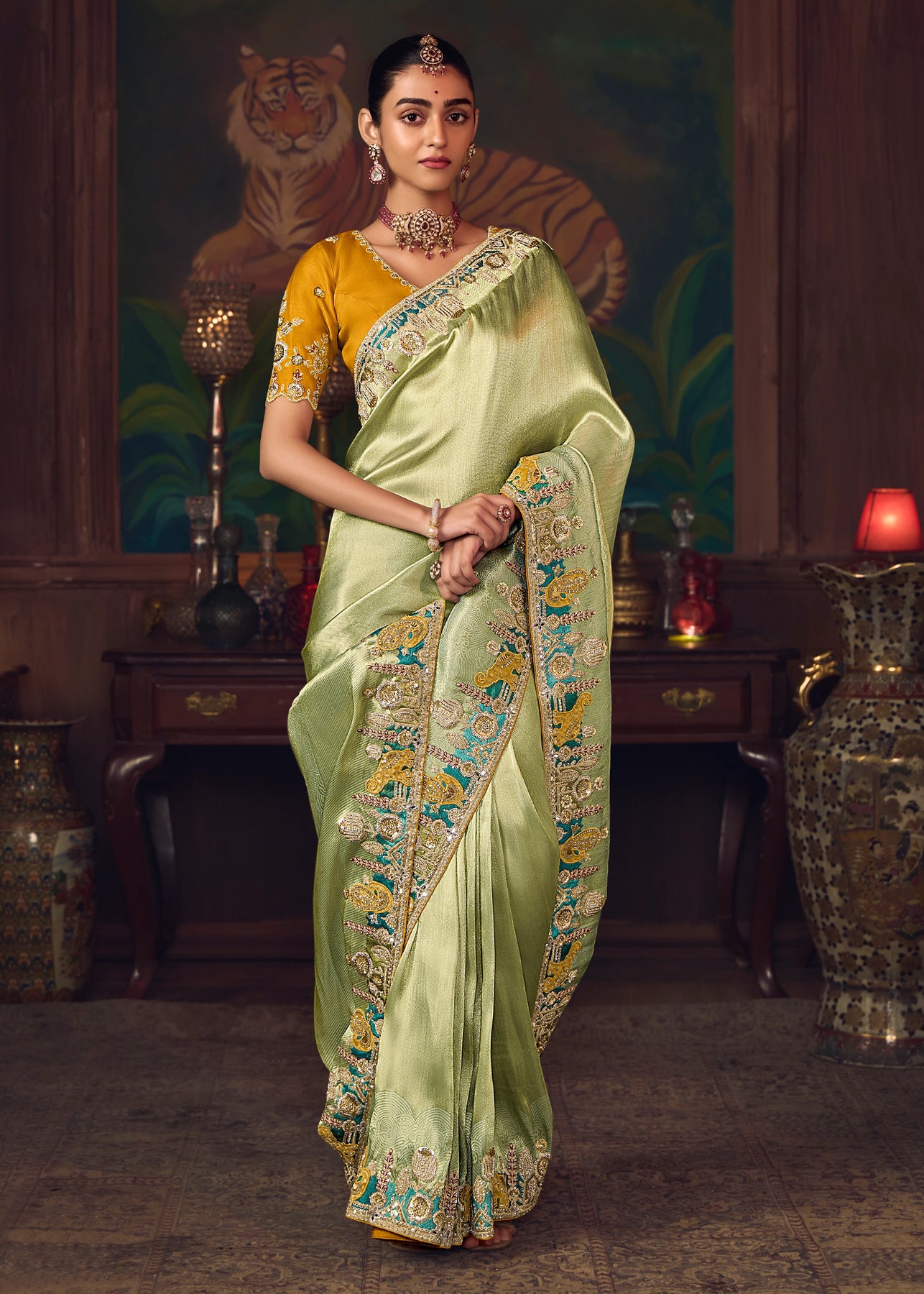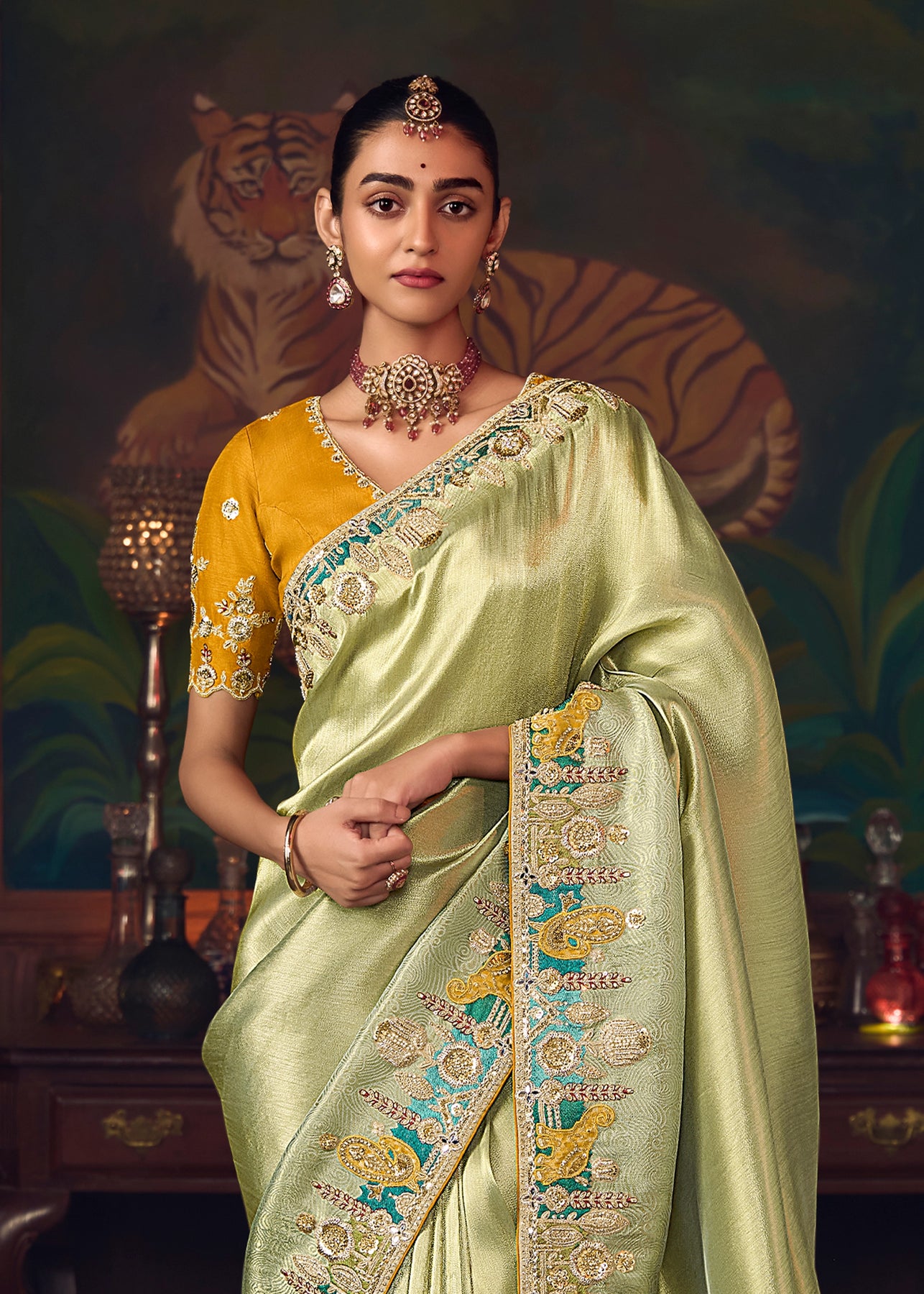 “Exclusive Offer” : Tropical Green Woven Embroidered Silk Saree