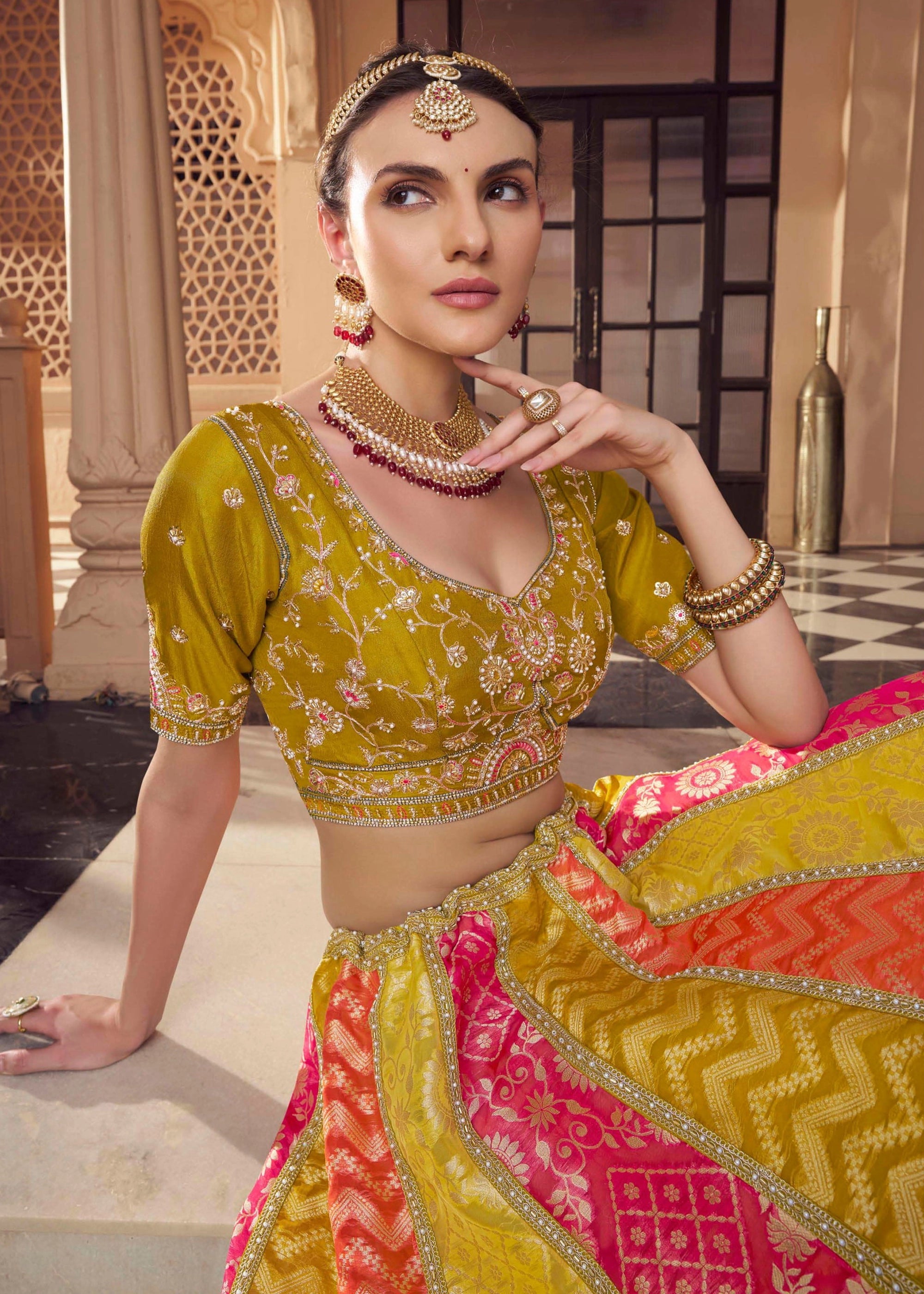 This stunning embroidered lehenga features intricate floral motifs and delicate beadwork, creating a mesmerizing visual spectacle. The flowing skirt and intricately designed blouse make it perfect for weddings and special occasions.