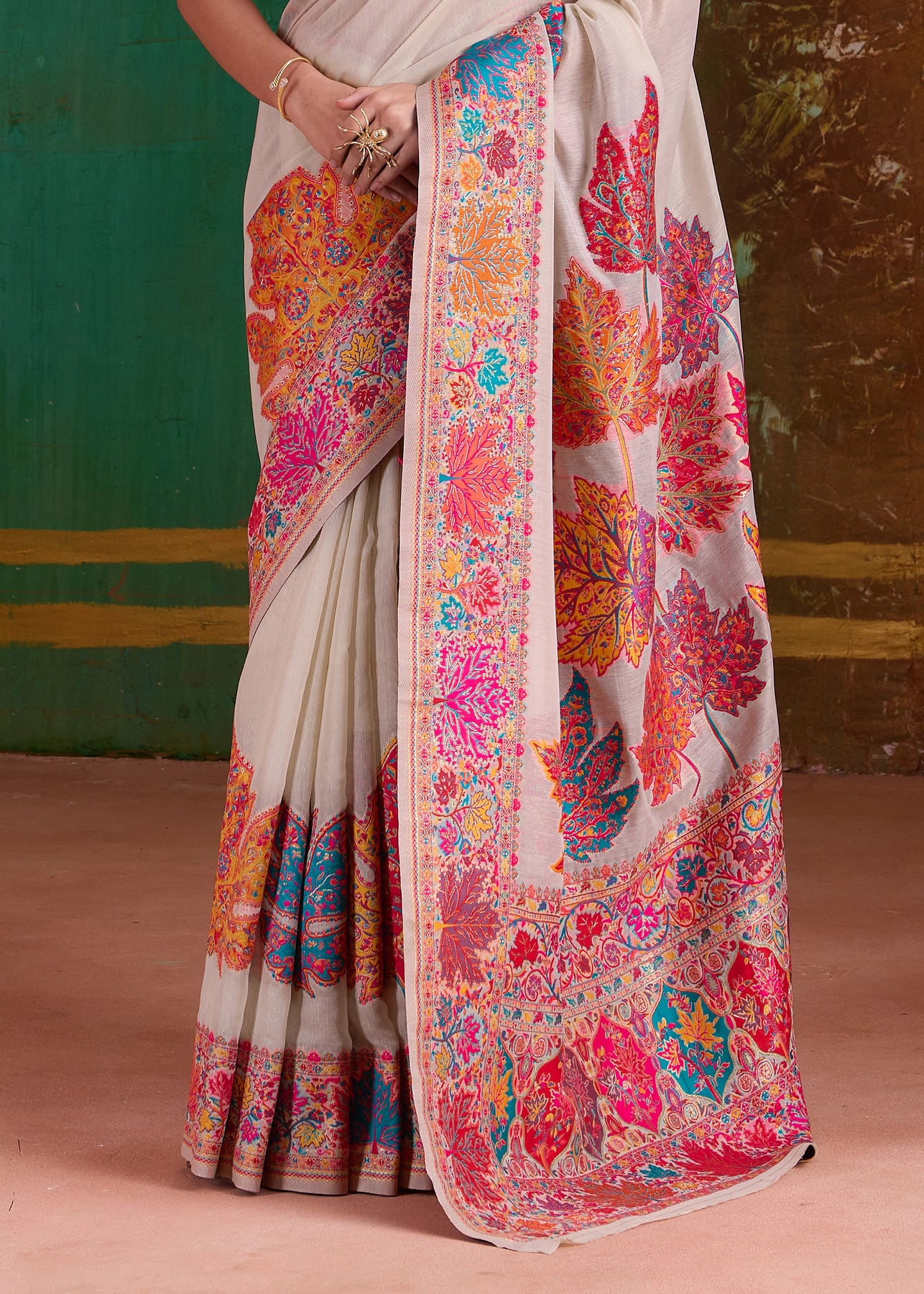 Pearl White Woven Cotton Jamewar Banarasi Saree