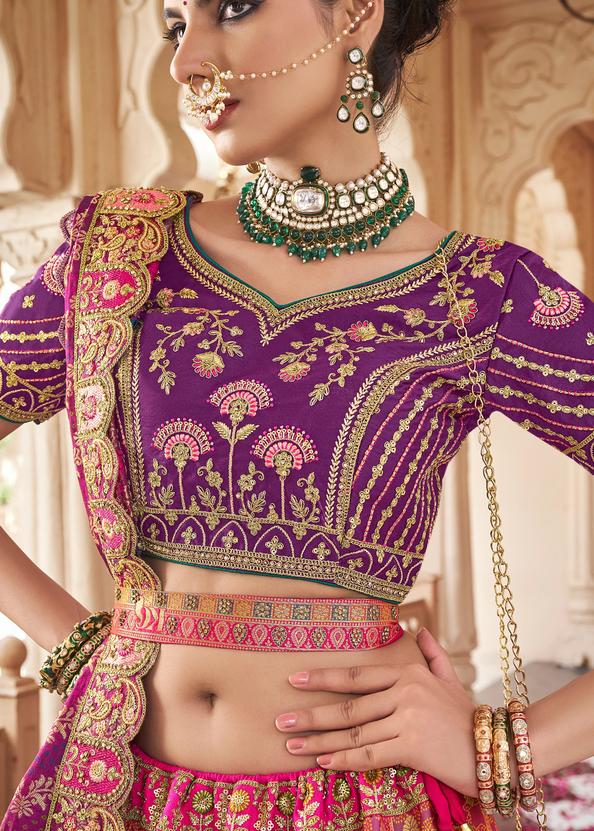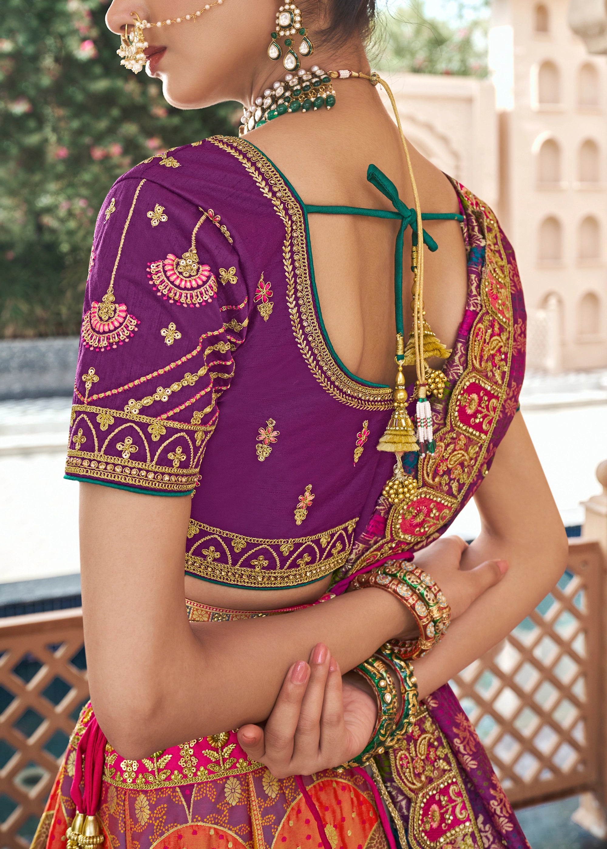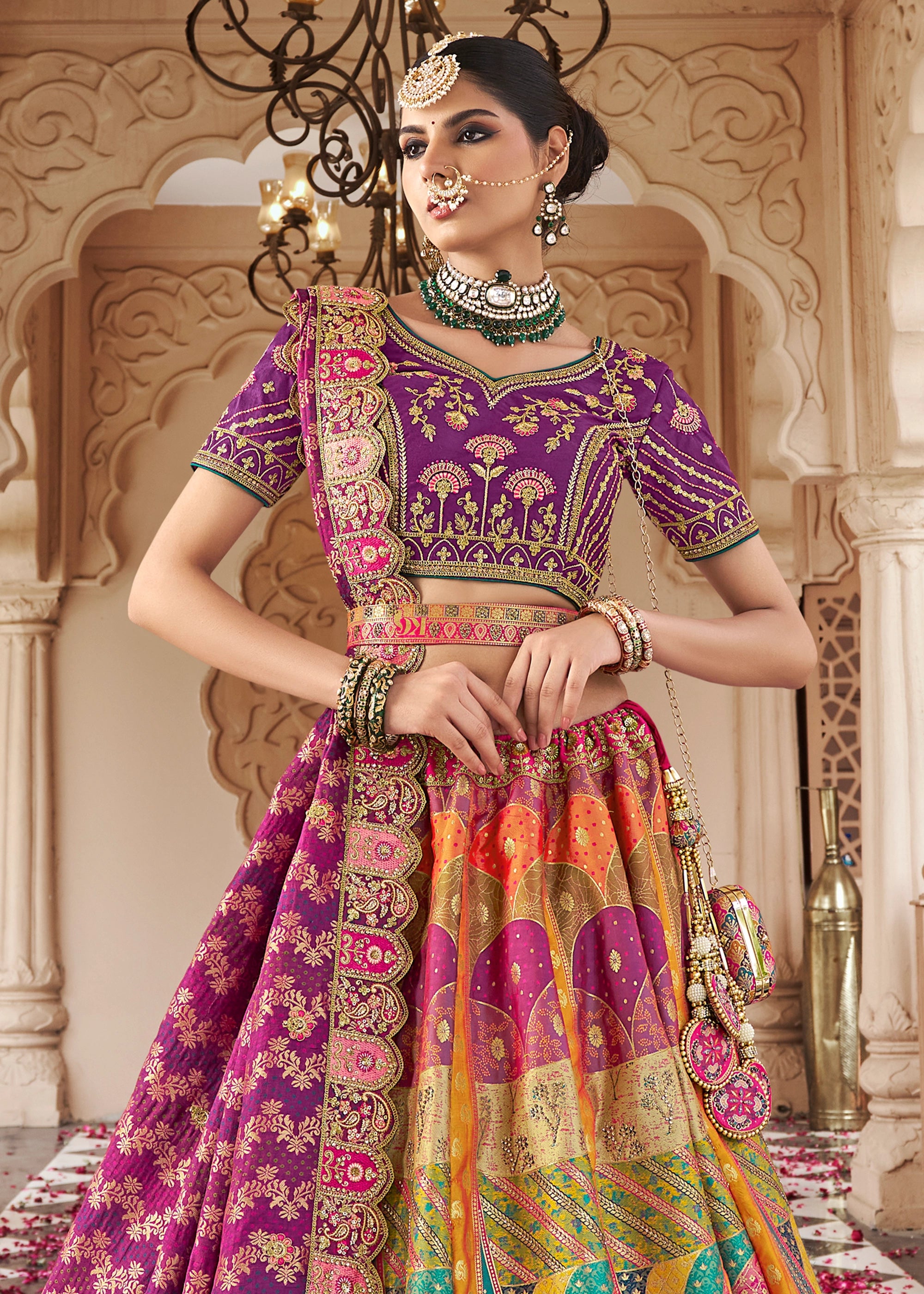 This stunning Banarasi silk leheng features intricate embroidery and vibrant traditional motifs in a beautiful multicolor palette.It is a perfect choice for weddings and festive occasions