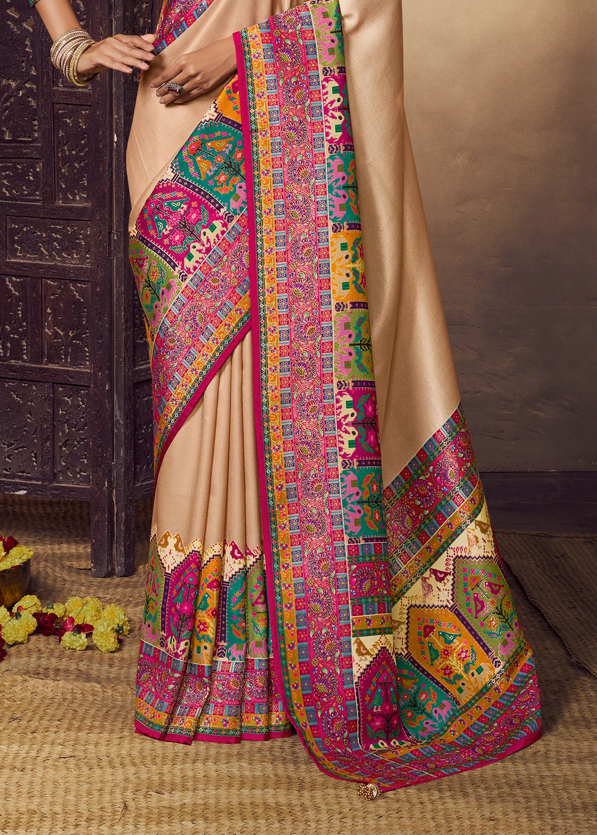 Beige And Pink Woven Soft Silk Saree
