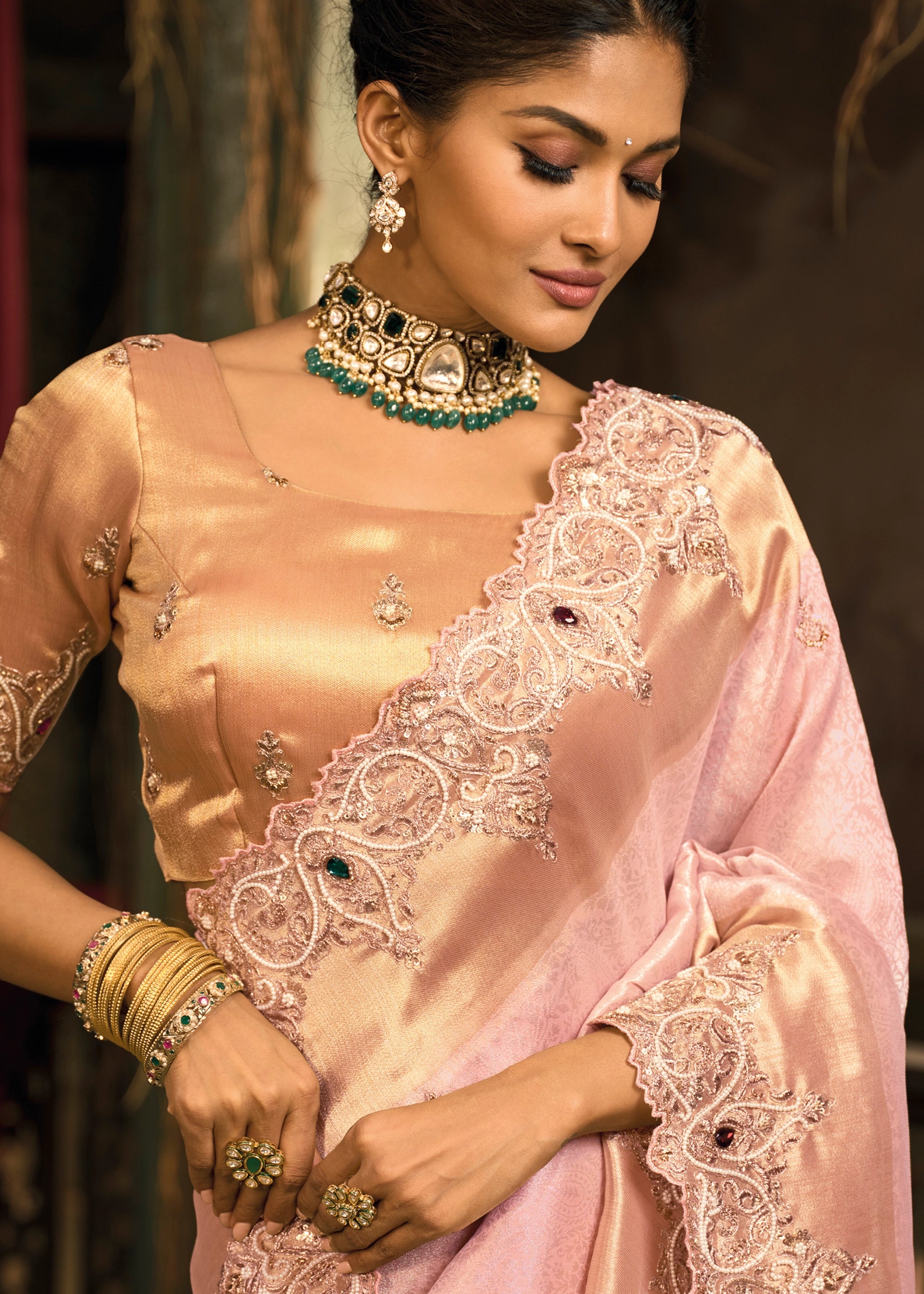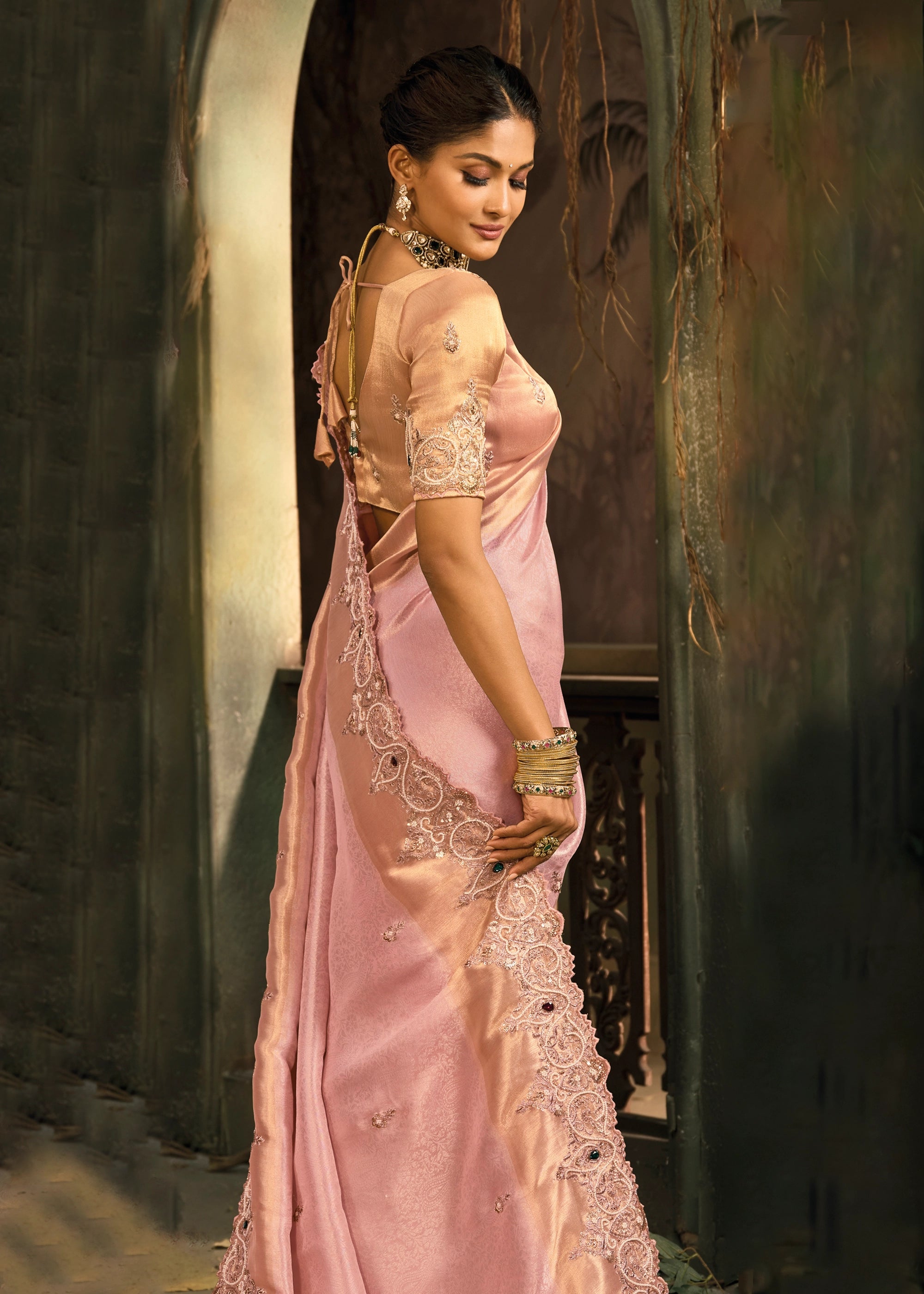 Blossom Pink Designer Embroidered Silk Saree