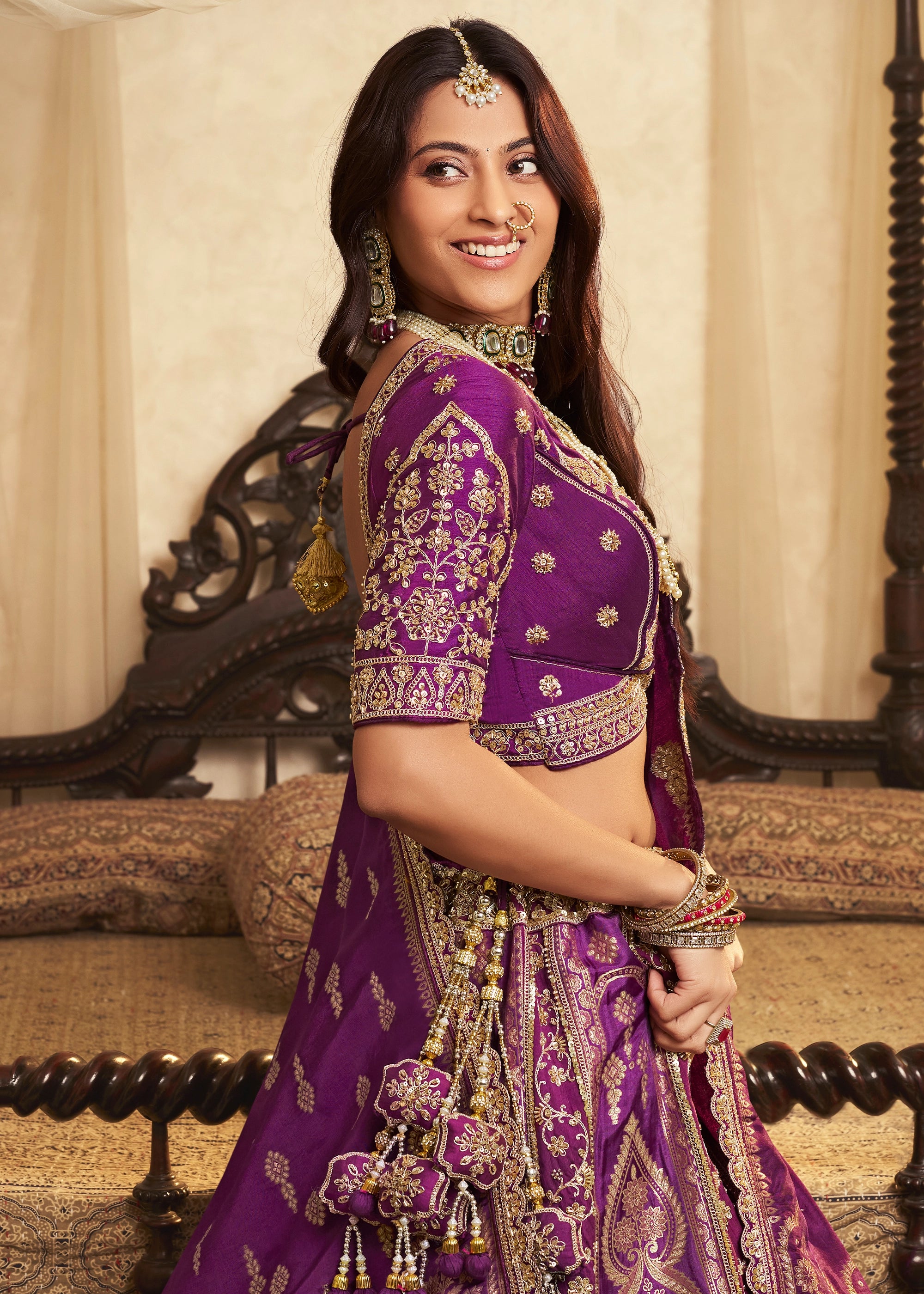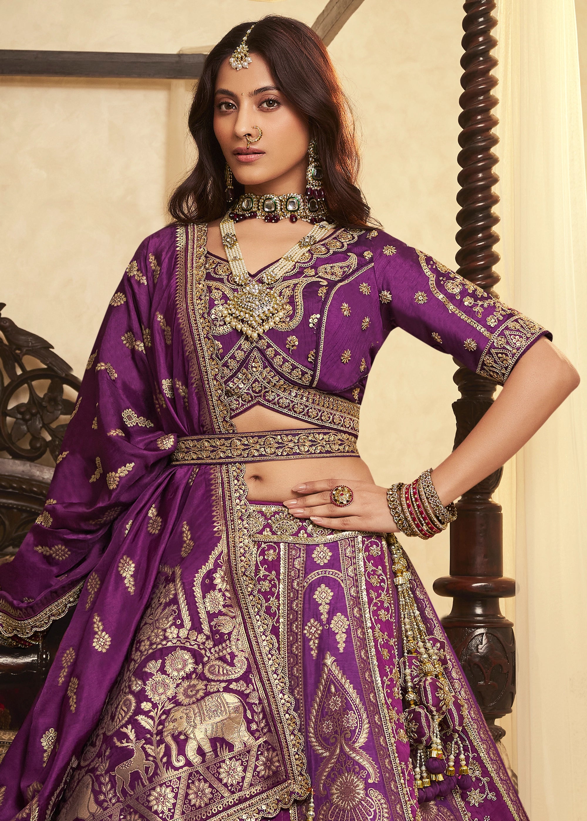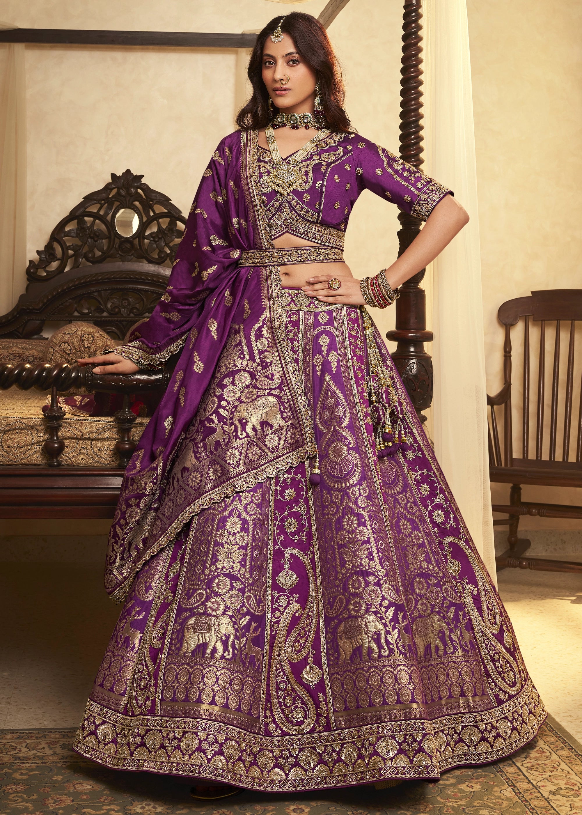 This stunning Banarasi silk leheng features intricate embroidery and vibrant traditional motifs in a beautiful multicolor palette.It is a perfect choice for weddings and festive occasions