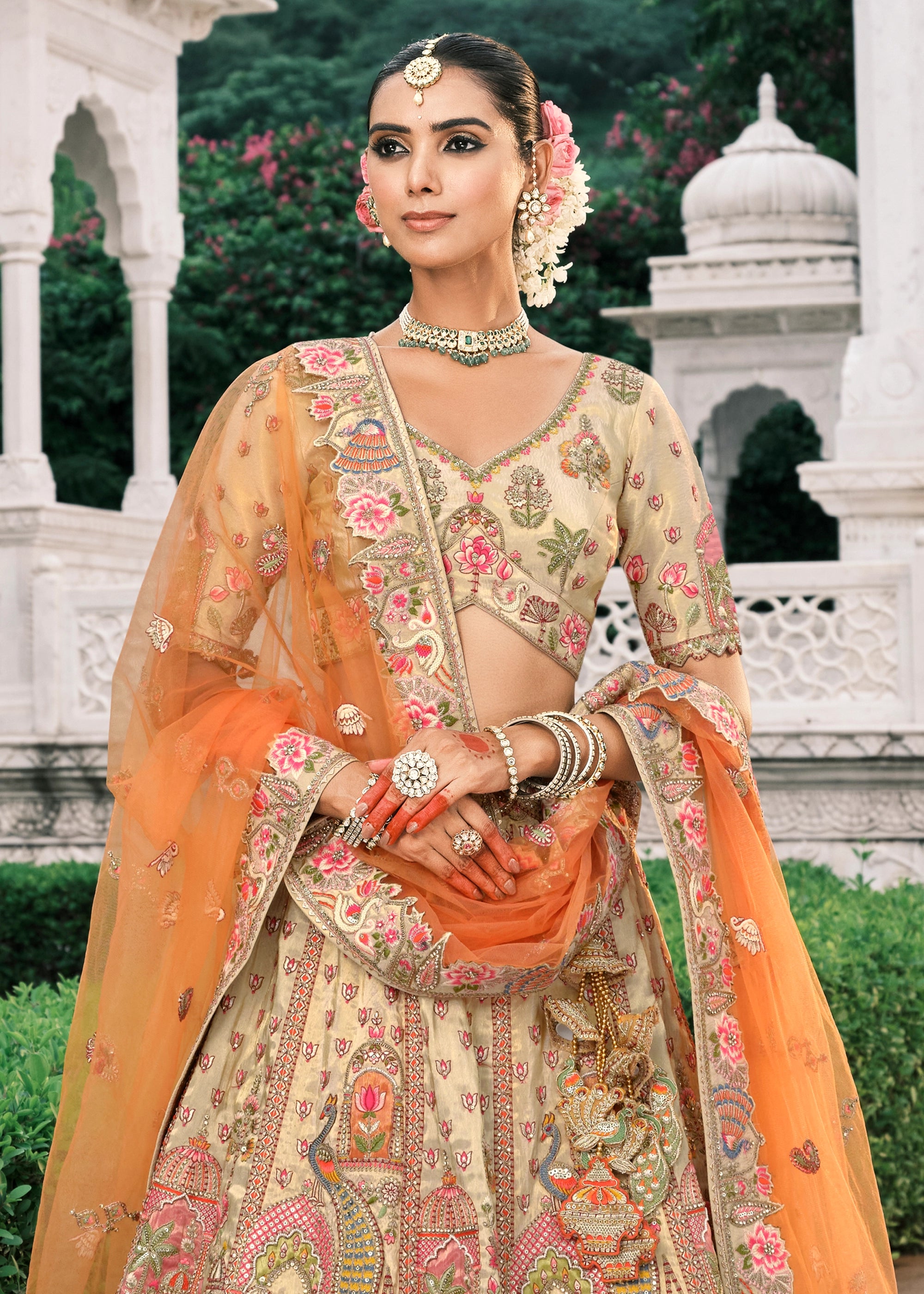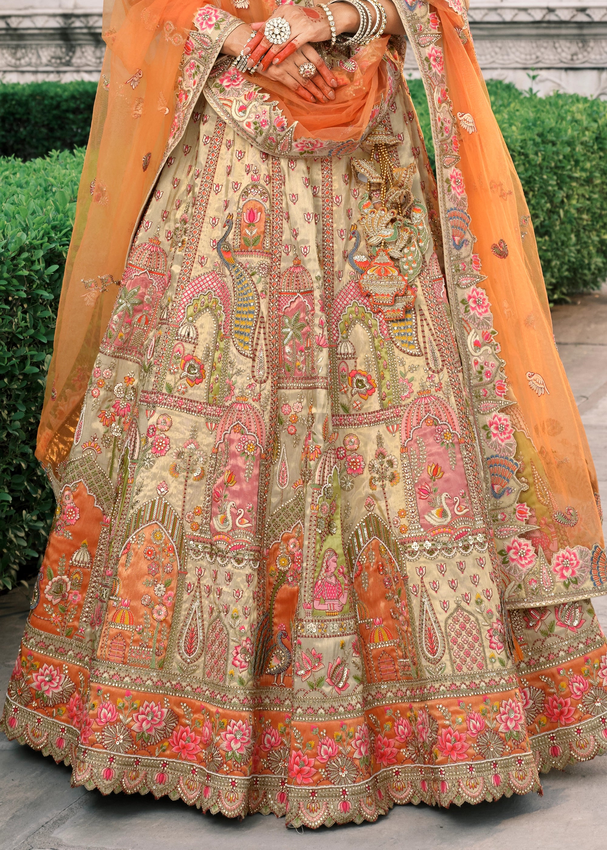 Beige & Orange Heavy Embroidered Designer Lehenga