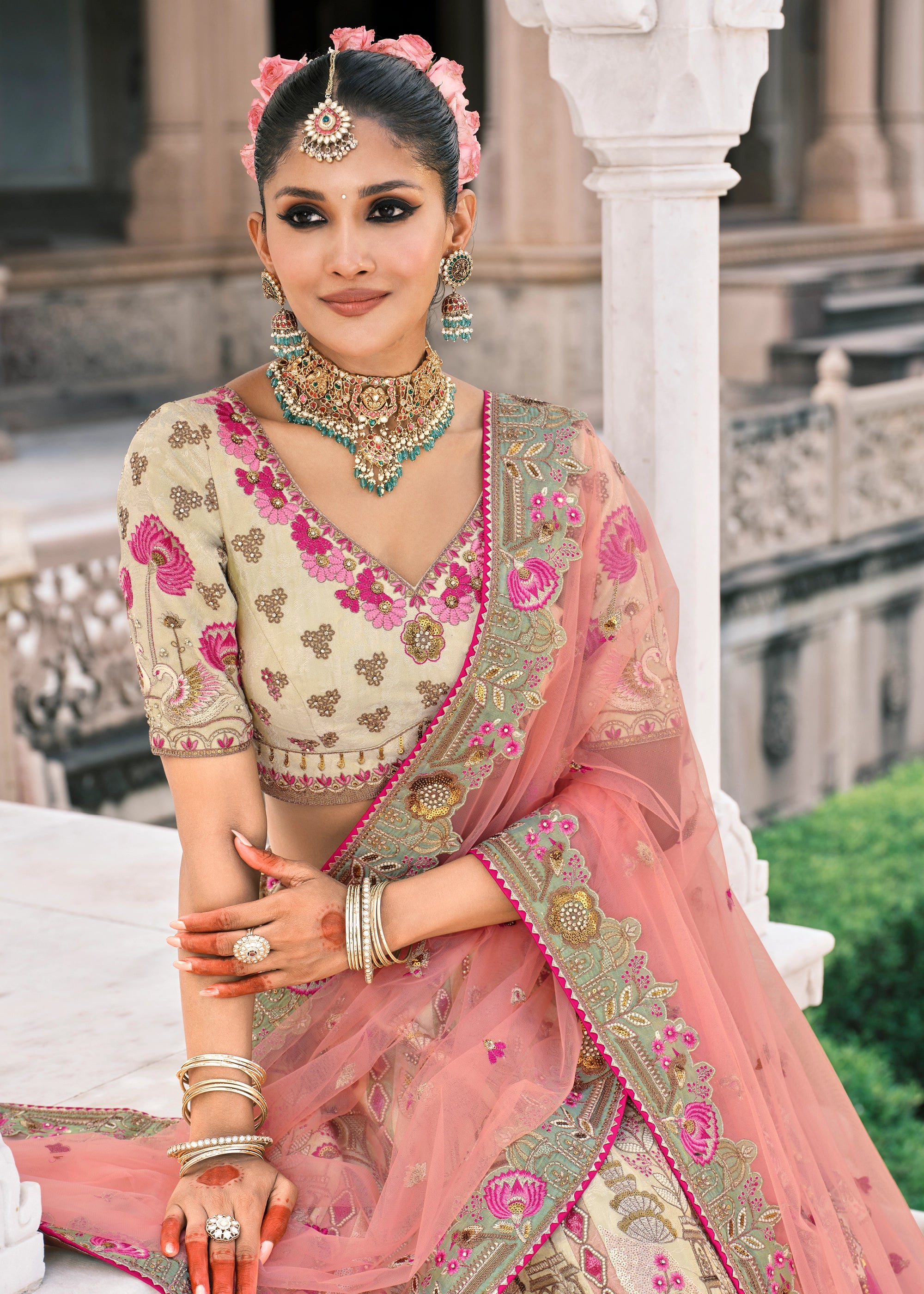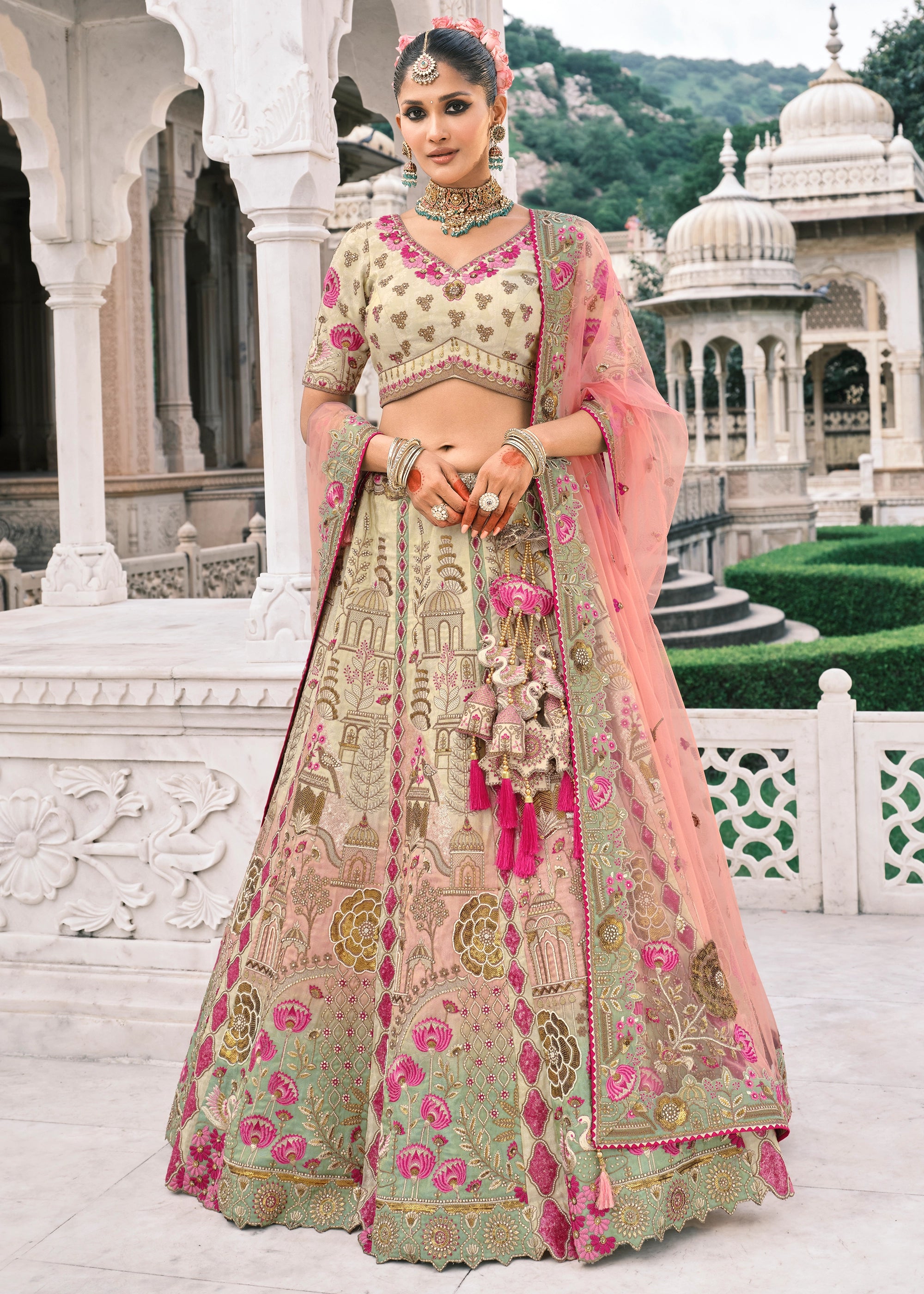Adorn yourself in this gorgeous Fancy Silk Lehenga, featuring all-over designer embroidery, intricate Cut Work border, stone, sequence, and mirror...