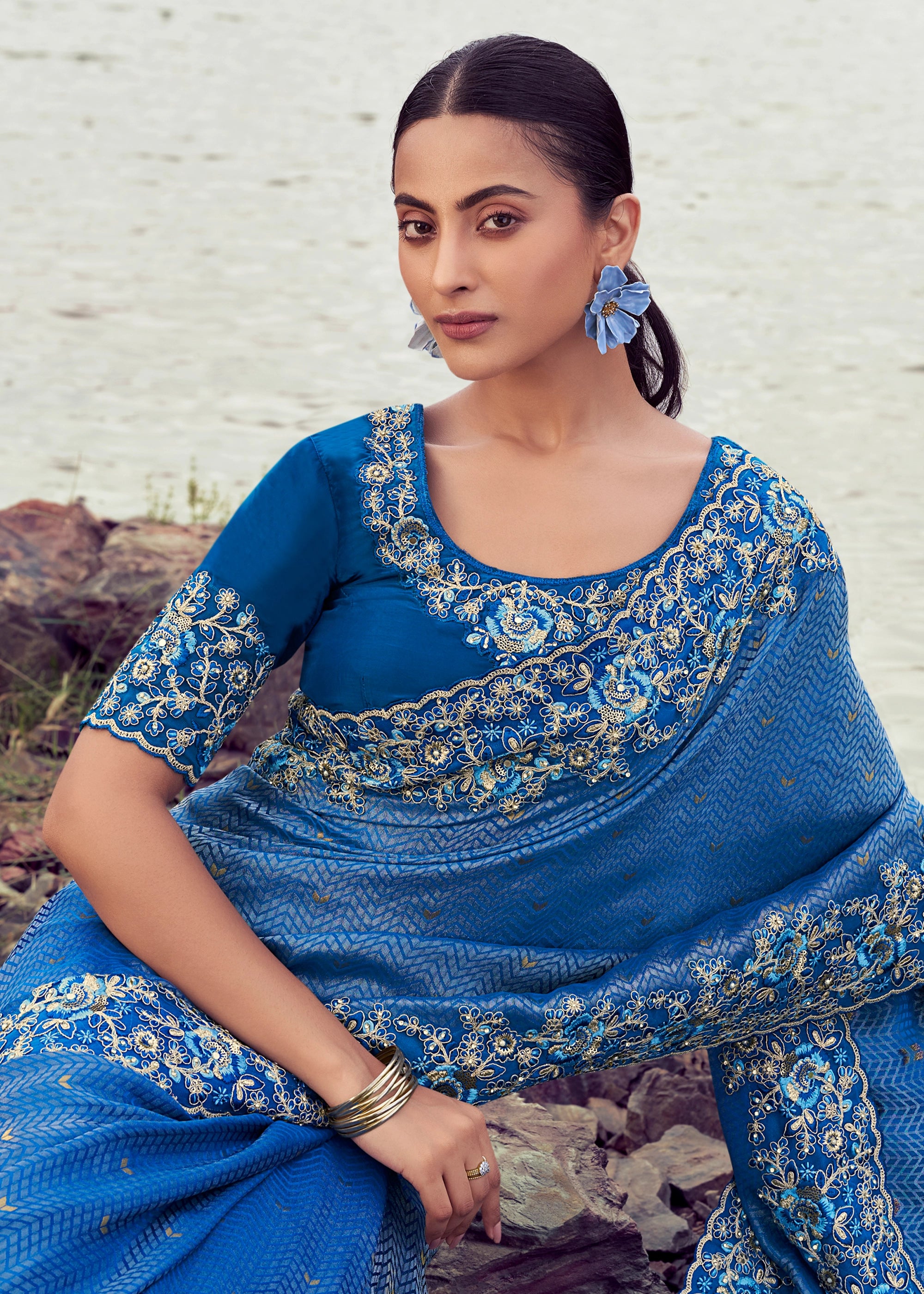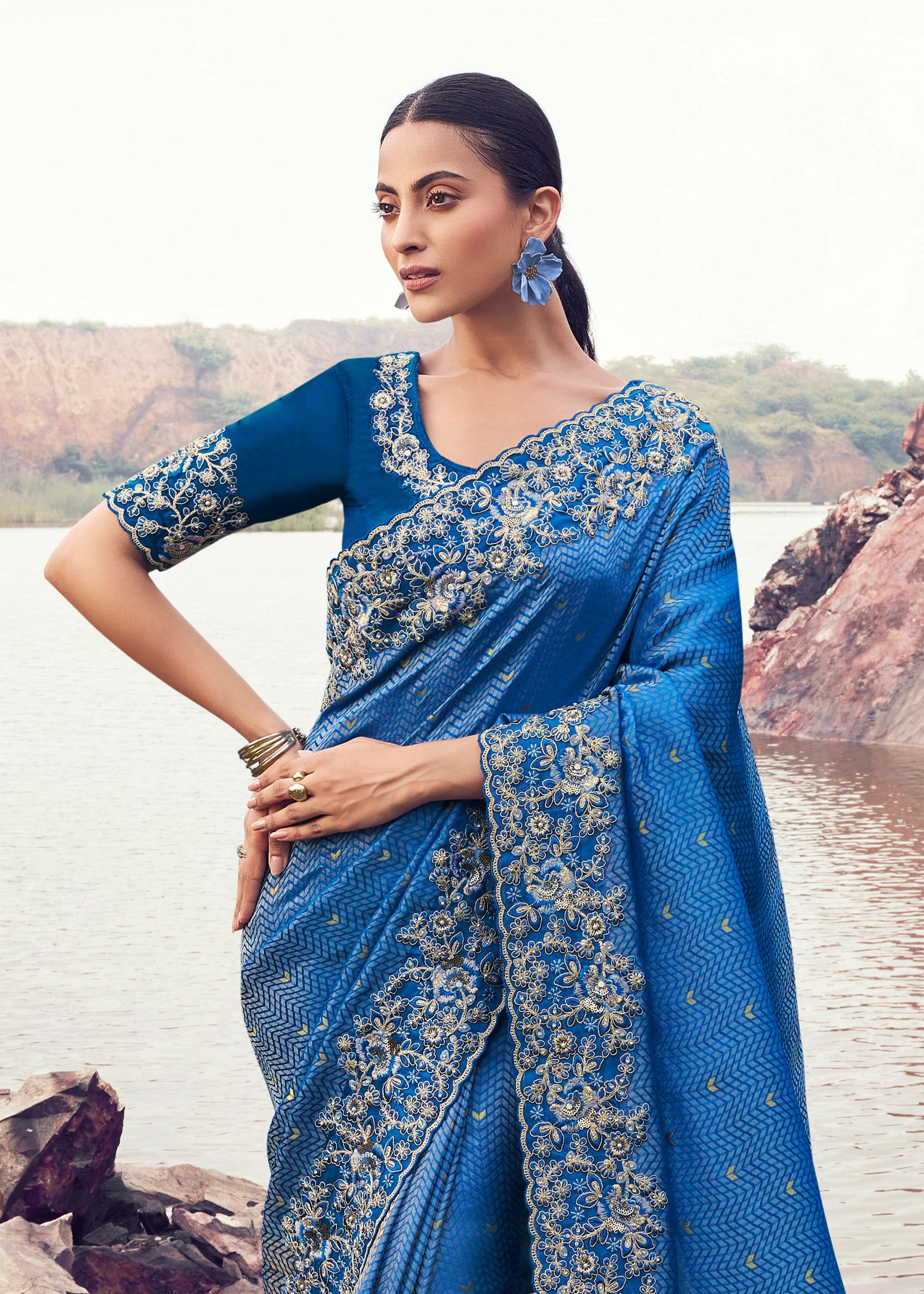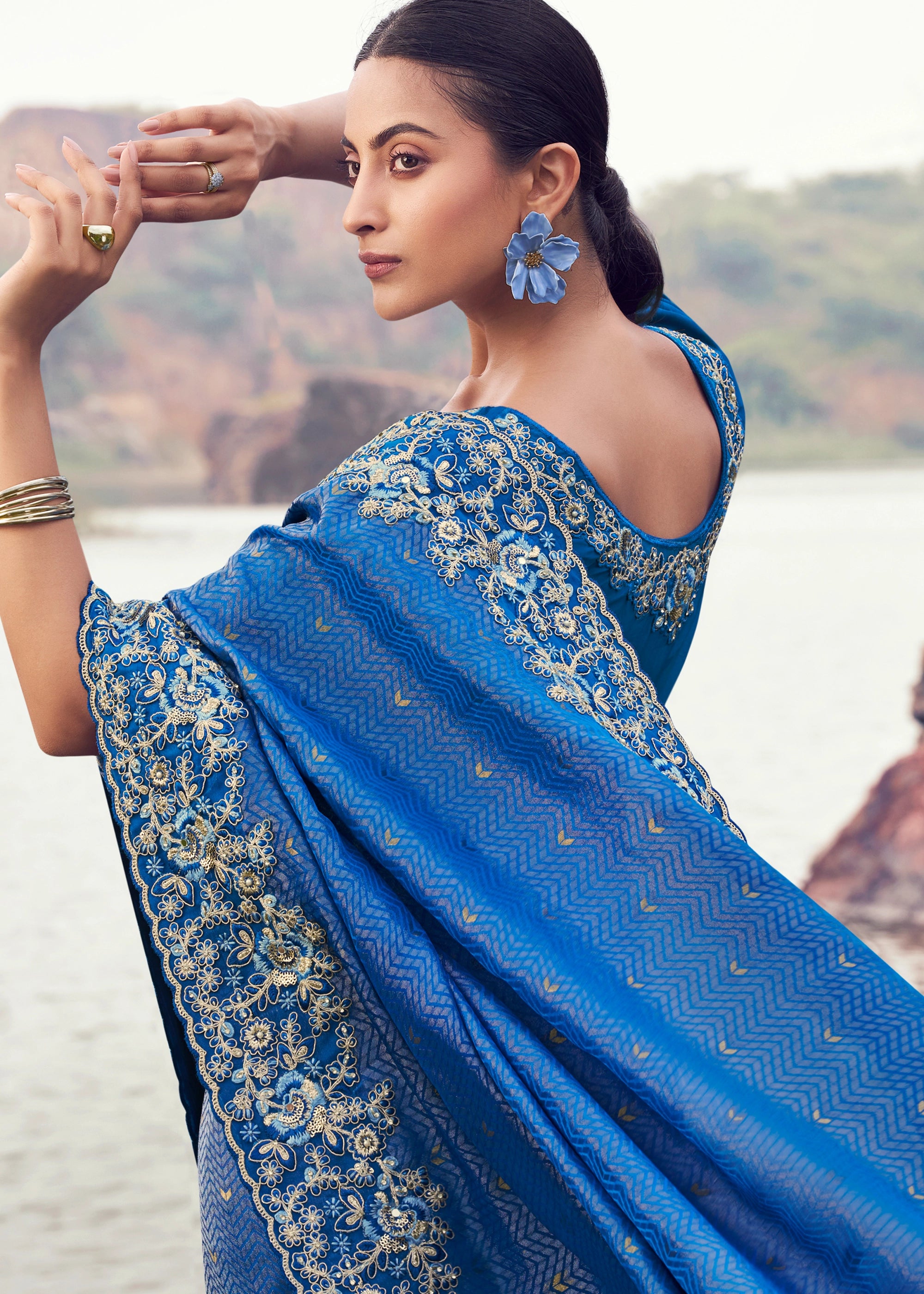 Sapphire Blue Woven Embroidered Satin Silk Saree