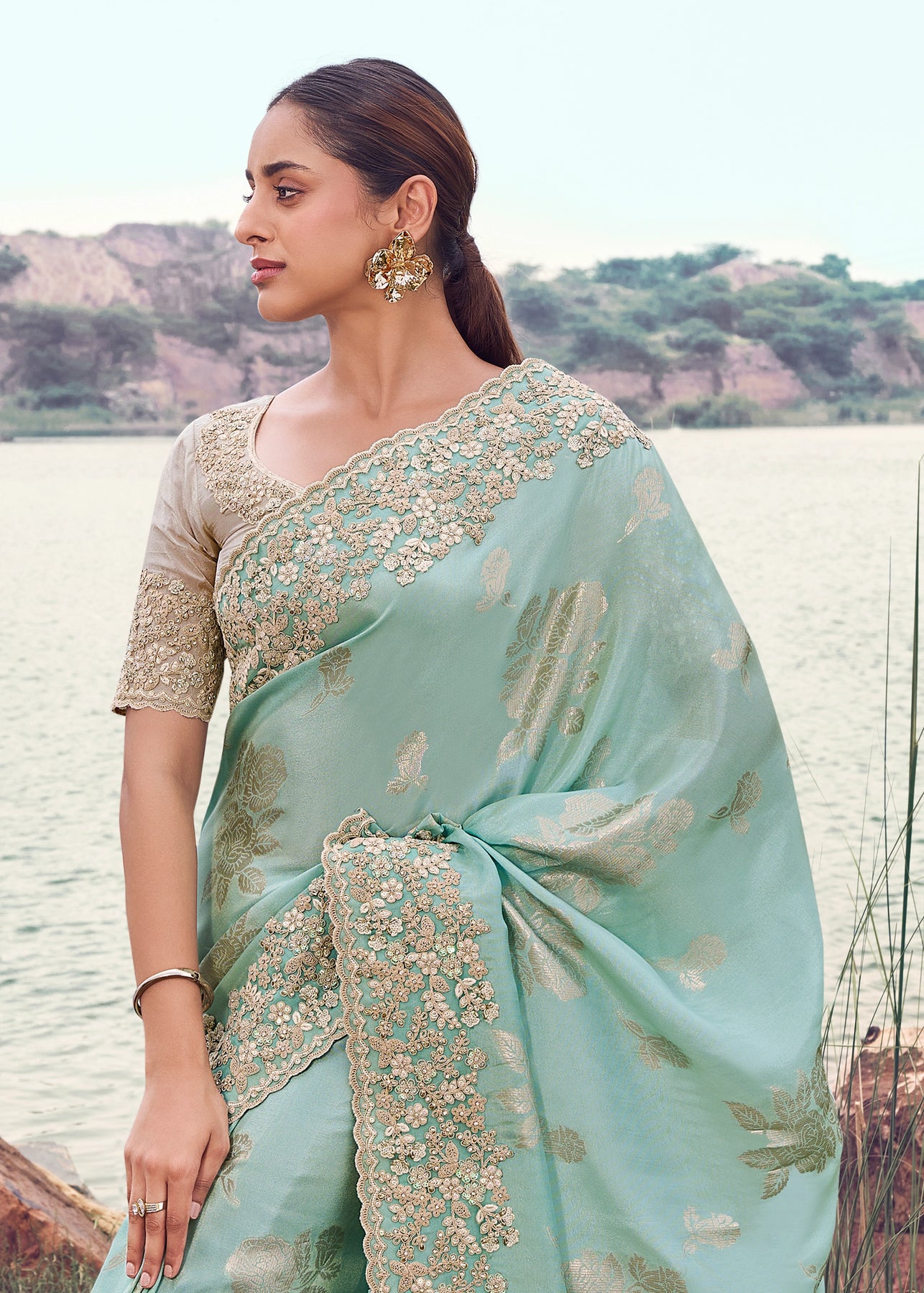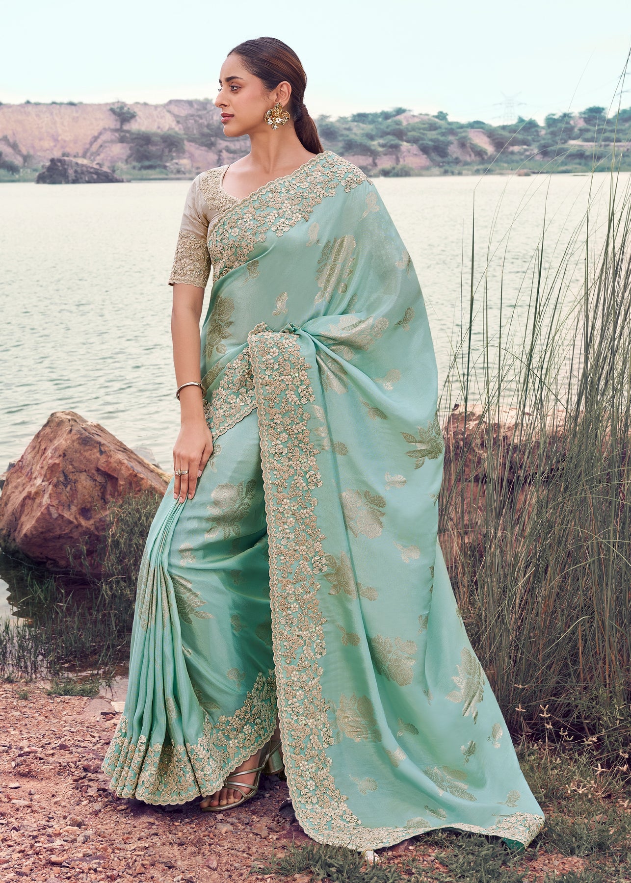 This elegant mint green saree, crafted from a smooth, lustrous fabric, features intricate woven motifs and a dense, heavy embroidered border, perfect for a sophisticated look.