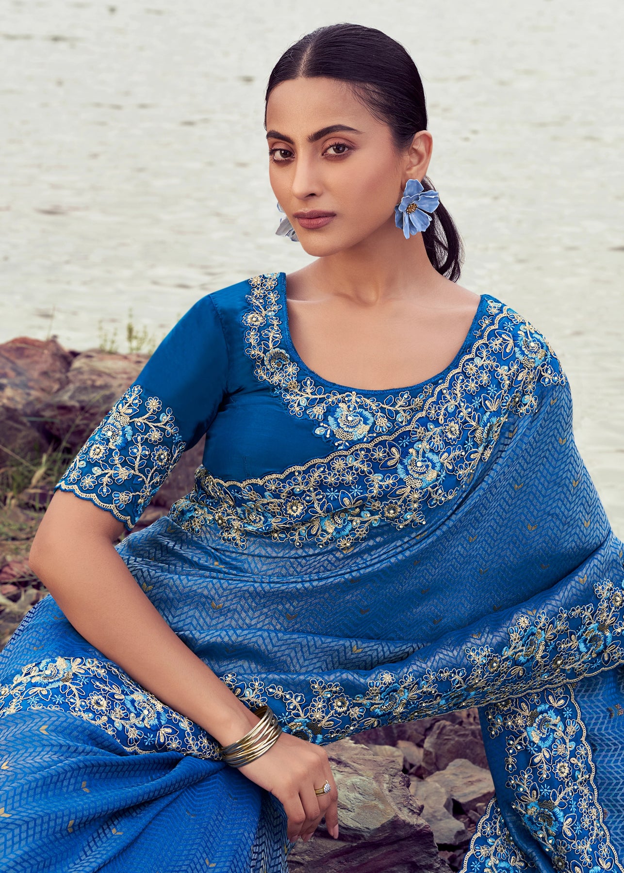 Aruba Blue Woven Embroidered Satin Silk Saree