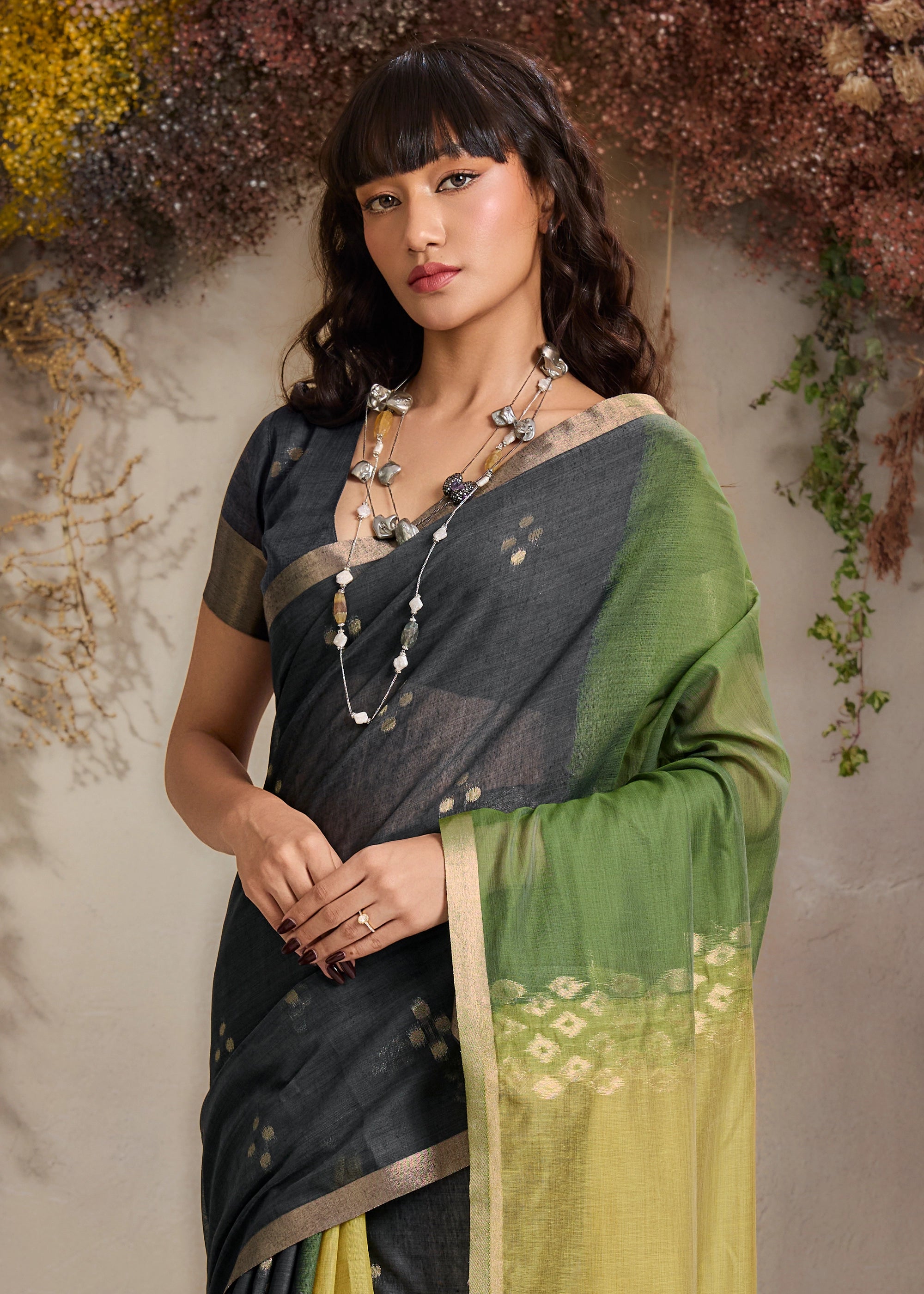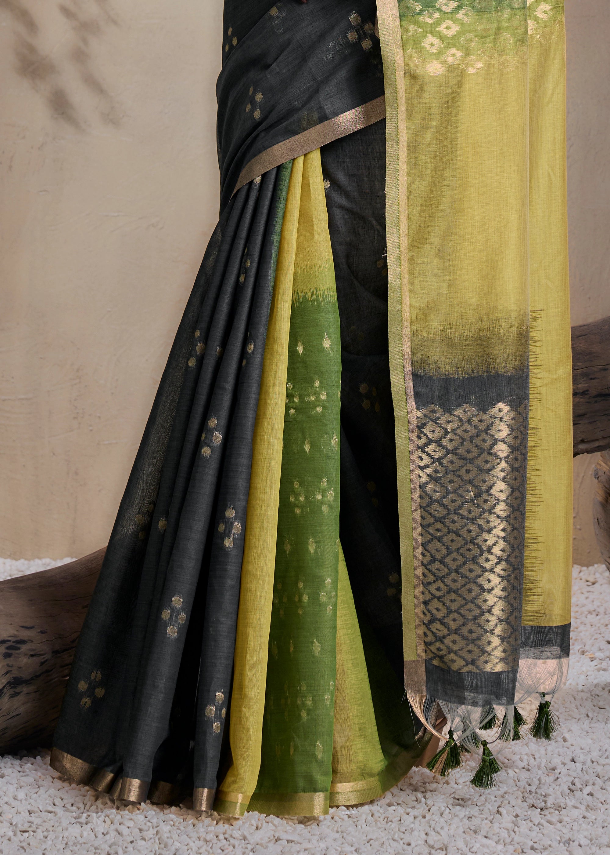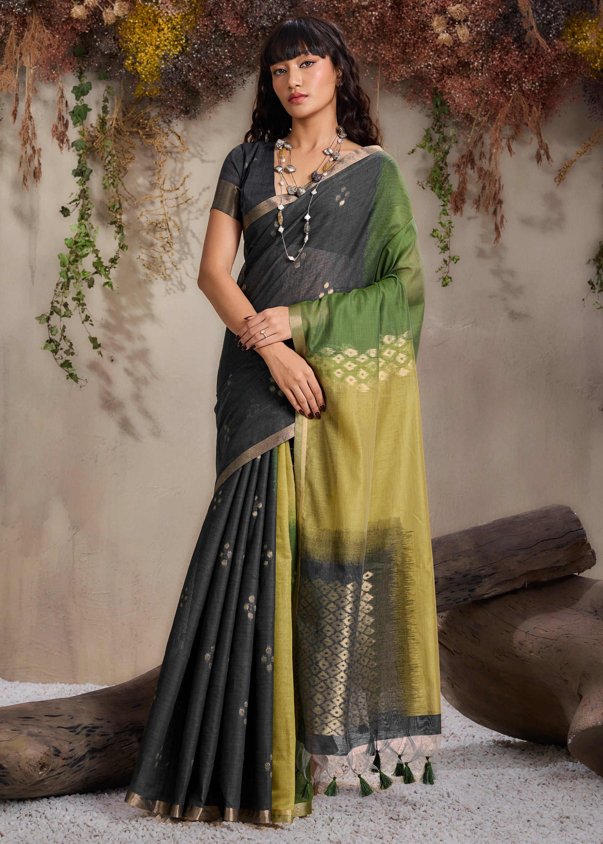 Black And Green Woven Cotton Silk Saree