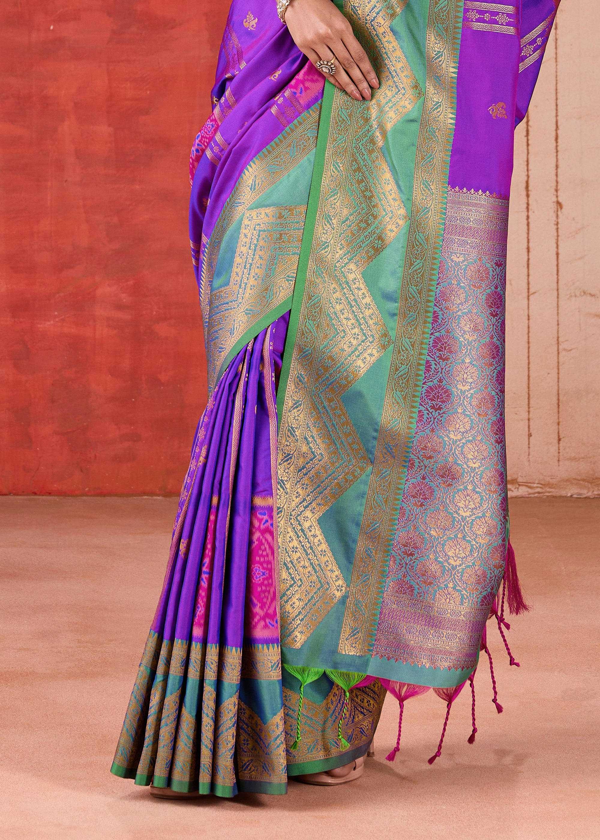 Experience the artistry of a handcrafted Banarasi saree. This pure silk masterpiece boasts meticulous zari weaving and traditional patterns, embodying centuries of Indian textile excellence.