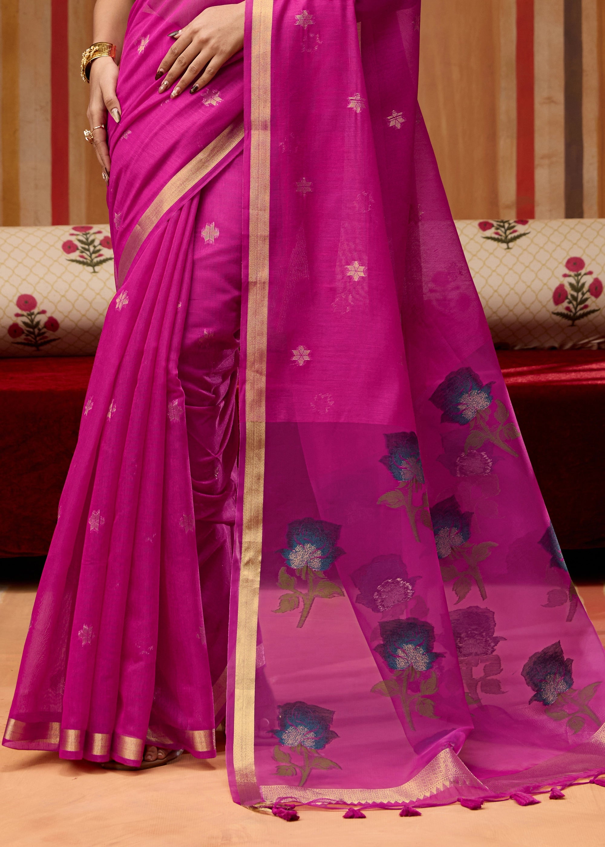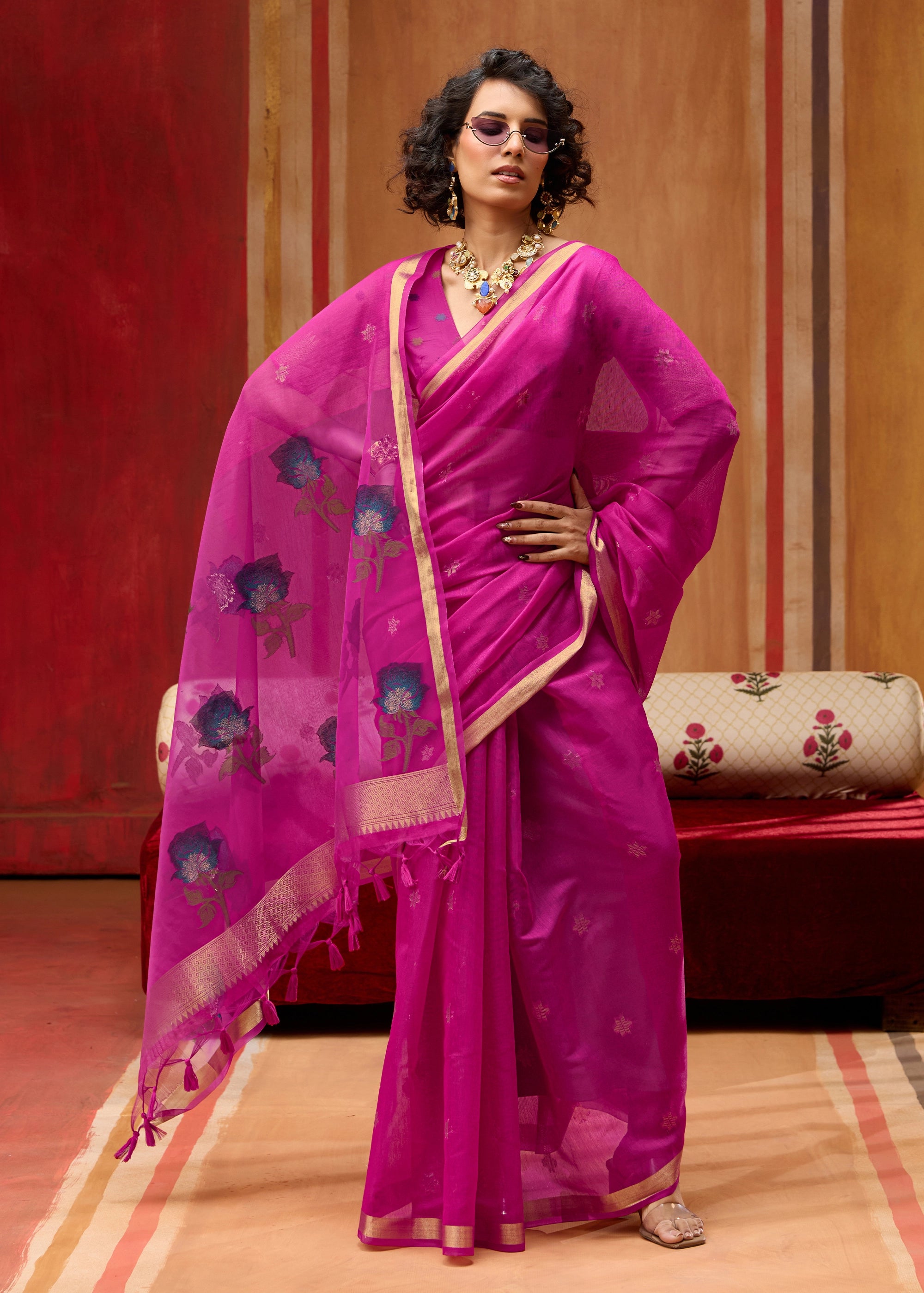 This exquisite saree features a beautiful blend of cotton and silk threads, expertly woven together to create a fabric that is both soft and lustrous. The cotton provides a comfortable drape, while the silk adds a subtle sheen and texture, giving the saree a regal and sophisticated appearance.
