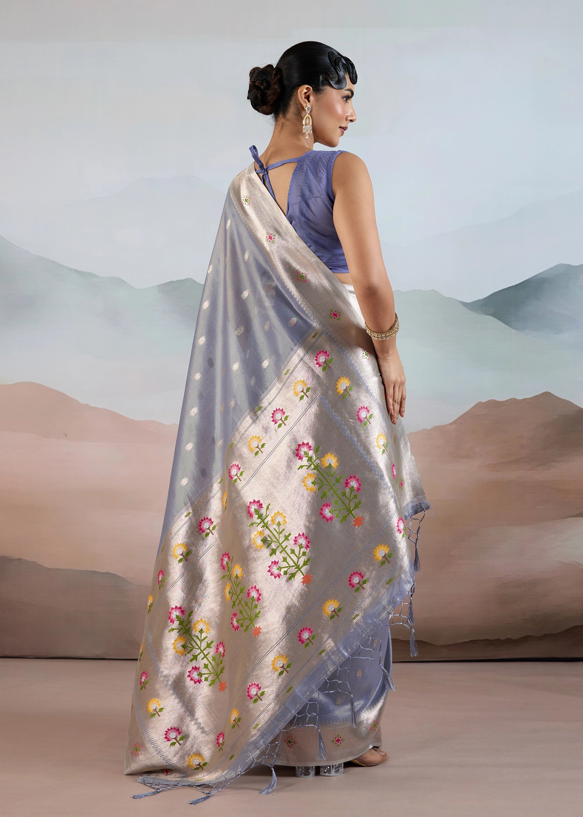 Bluish Grey Woven Banarasi Tissue Silk Saree