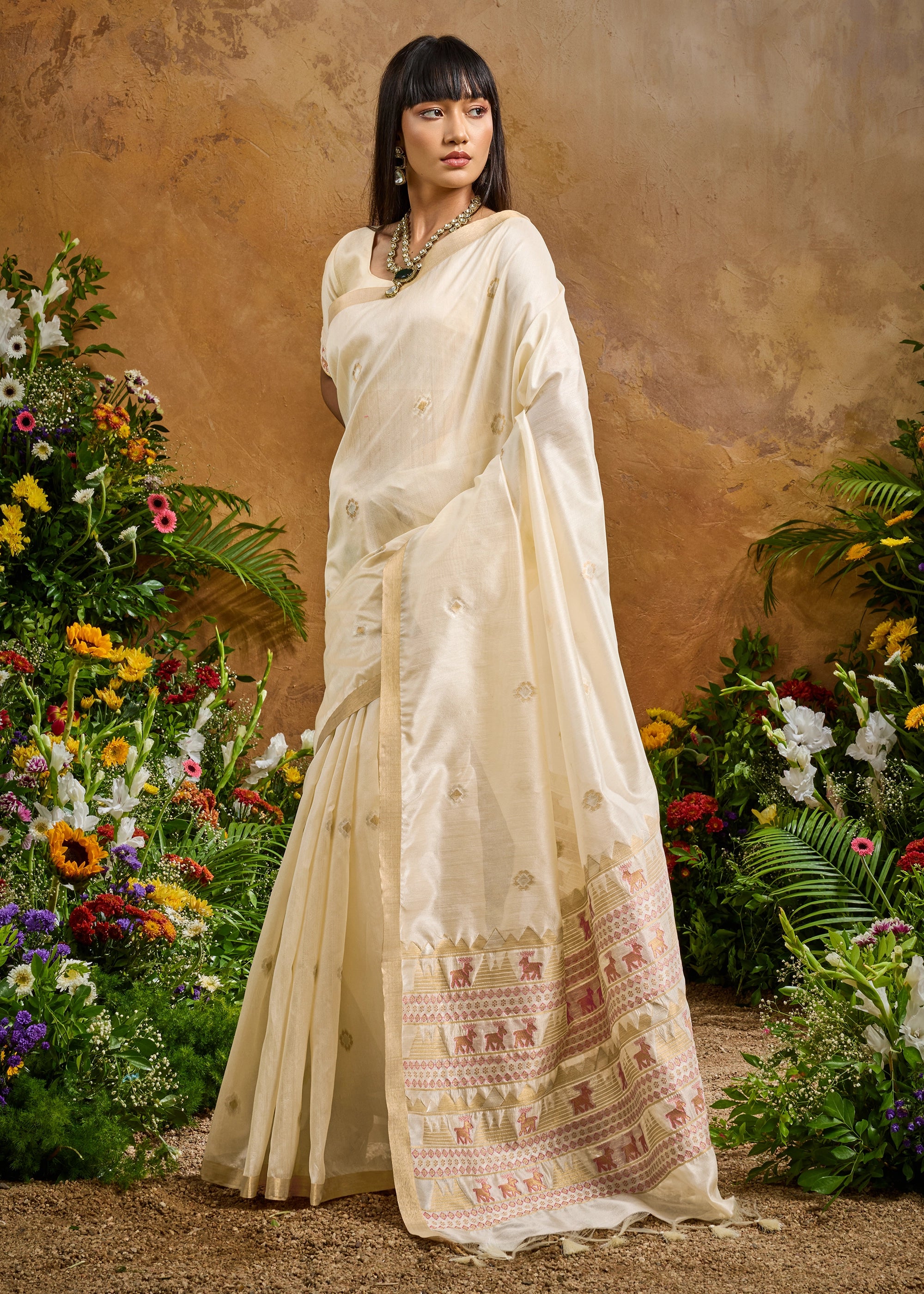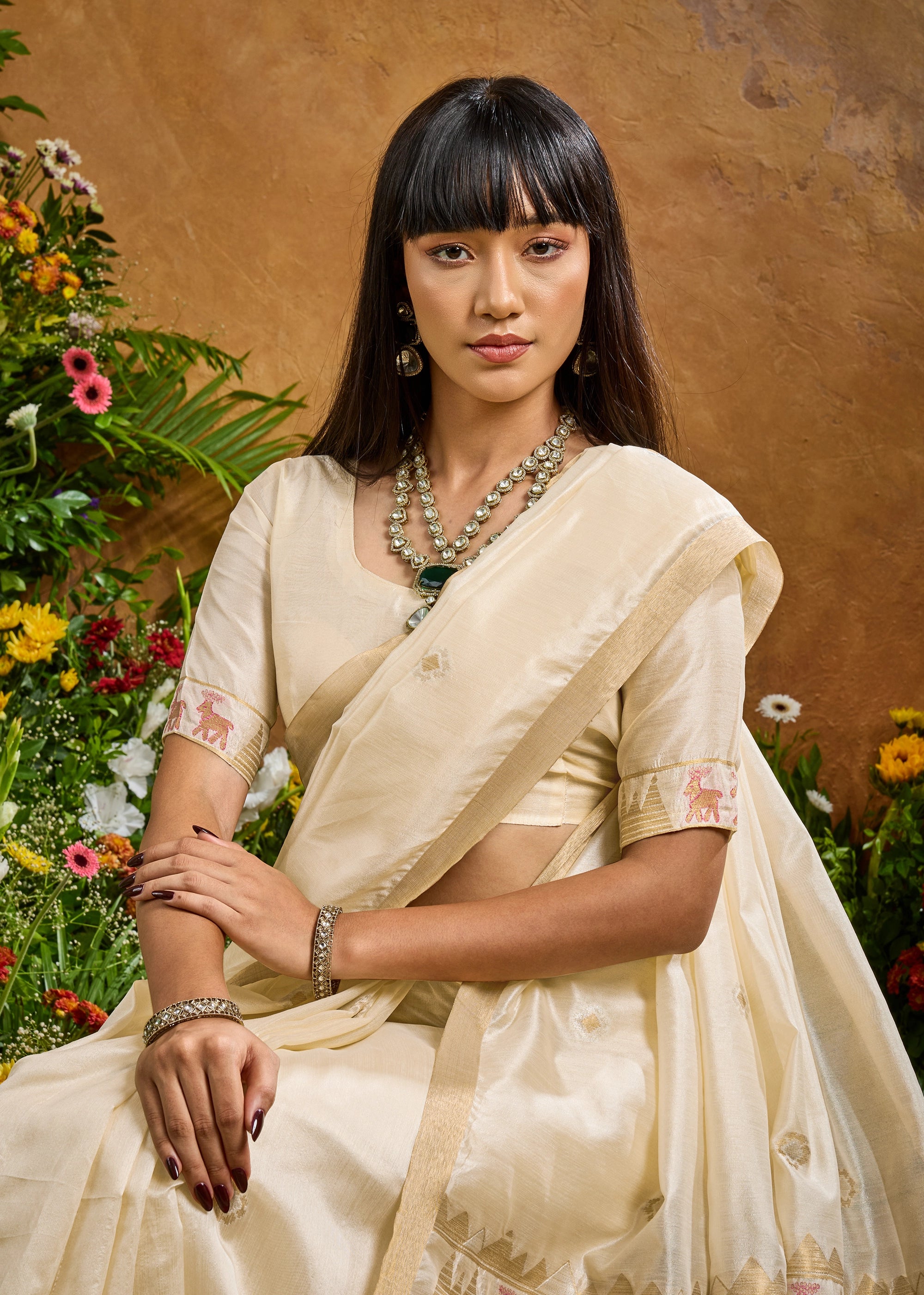 Elevate your wardrobe with this masterpiece of light and luster. Crafted in a serene hue, this saree features a delicate interplay of silk and fine zari, making it a versatile choice for morning festivities or sophisticated evening saree.