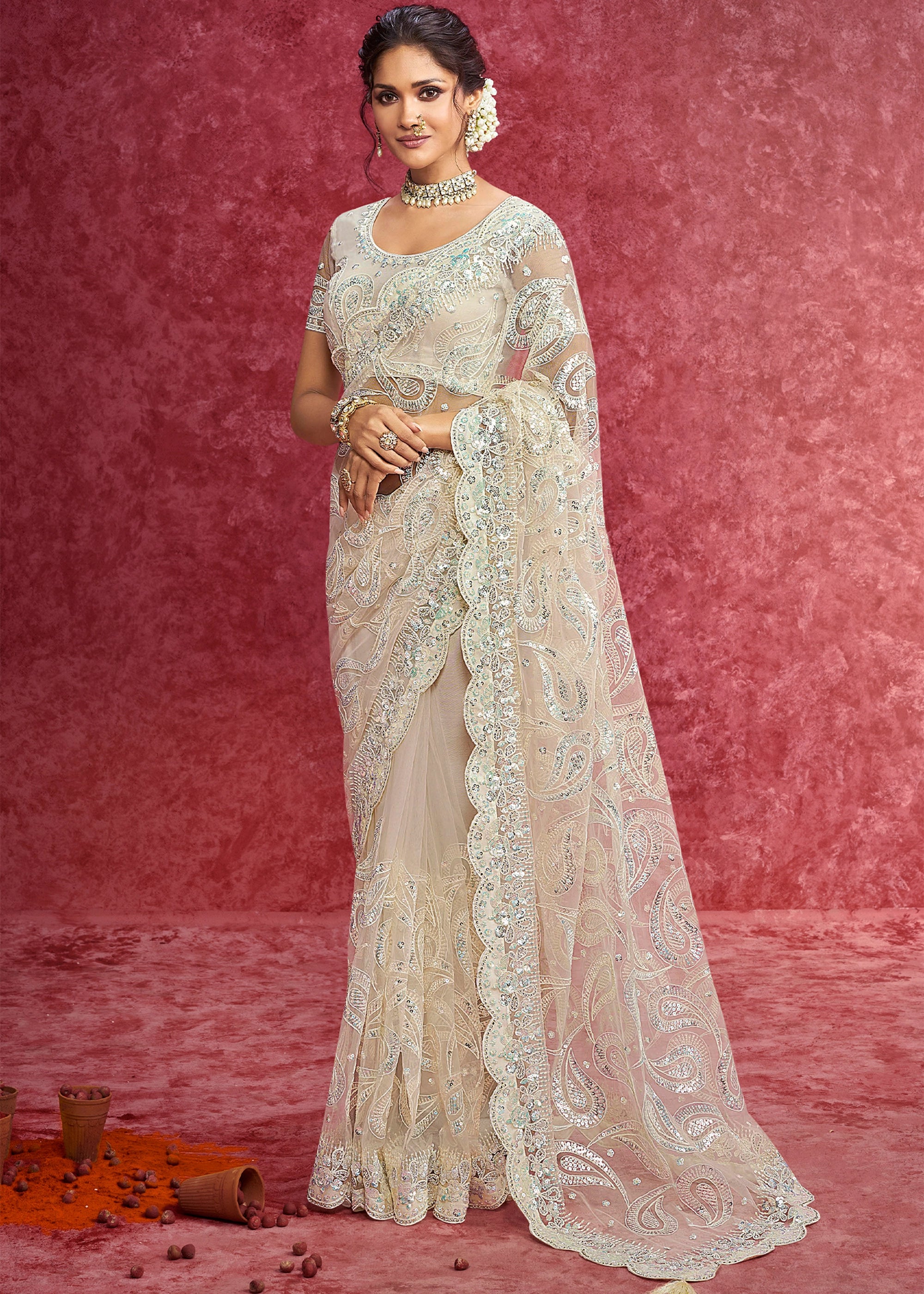 This elegant designer saree is crafted from premium fabric, featuring intricate heavy zari, resham, and sequin embroidery.The delicate stonework and lace border make it a perfect choice for weddings and special occasions.