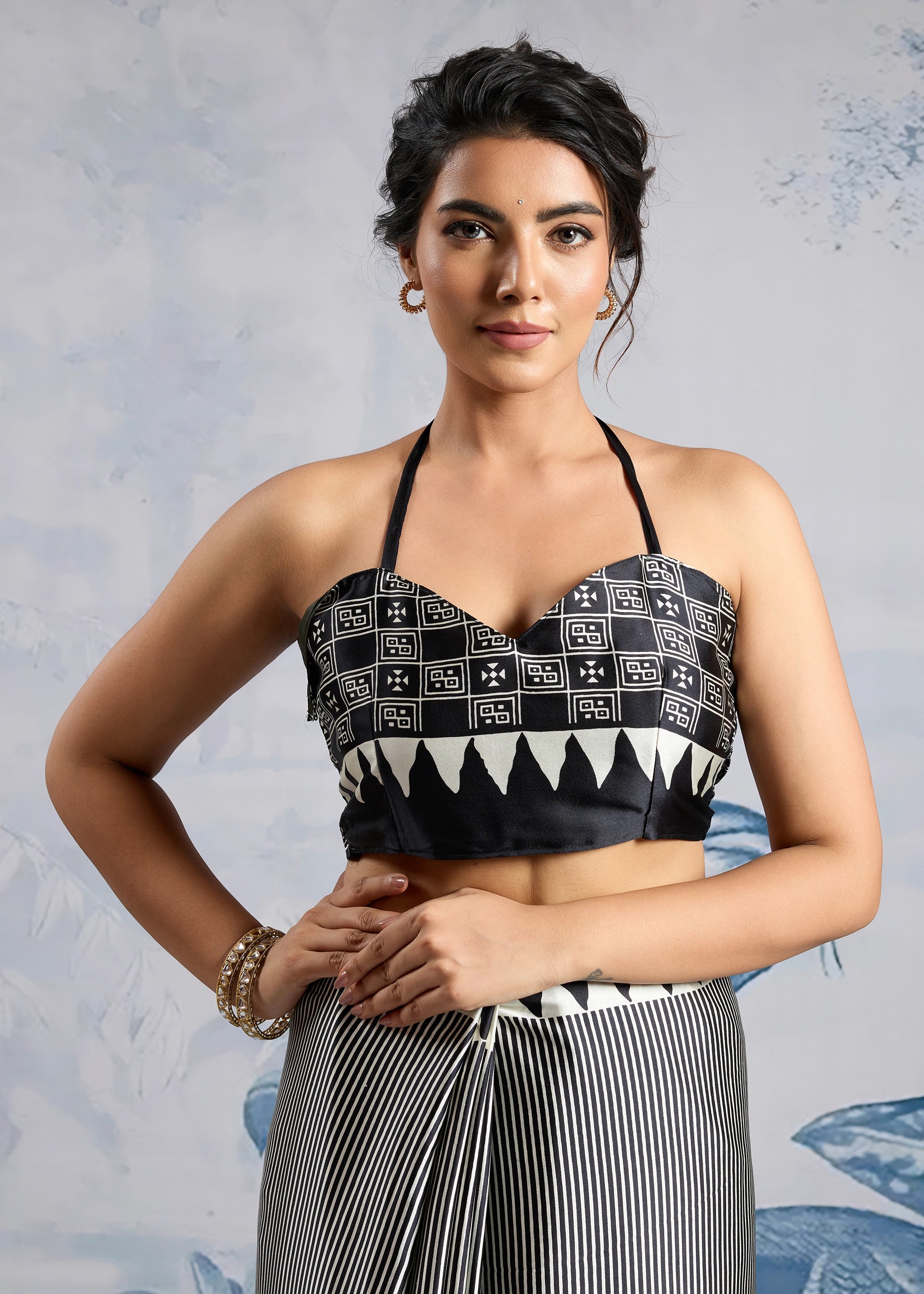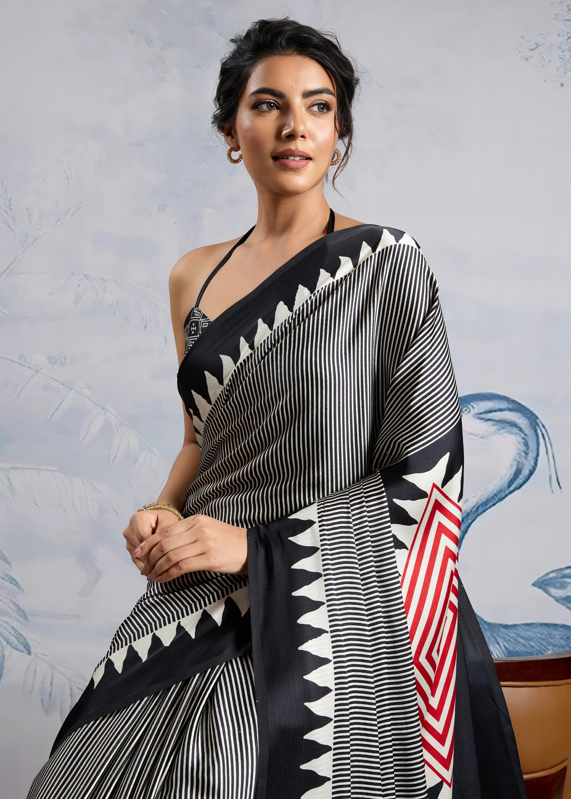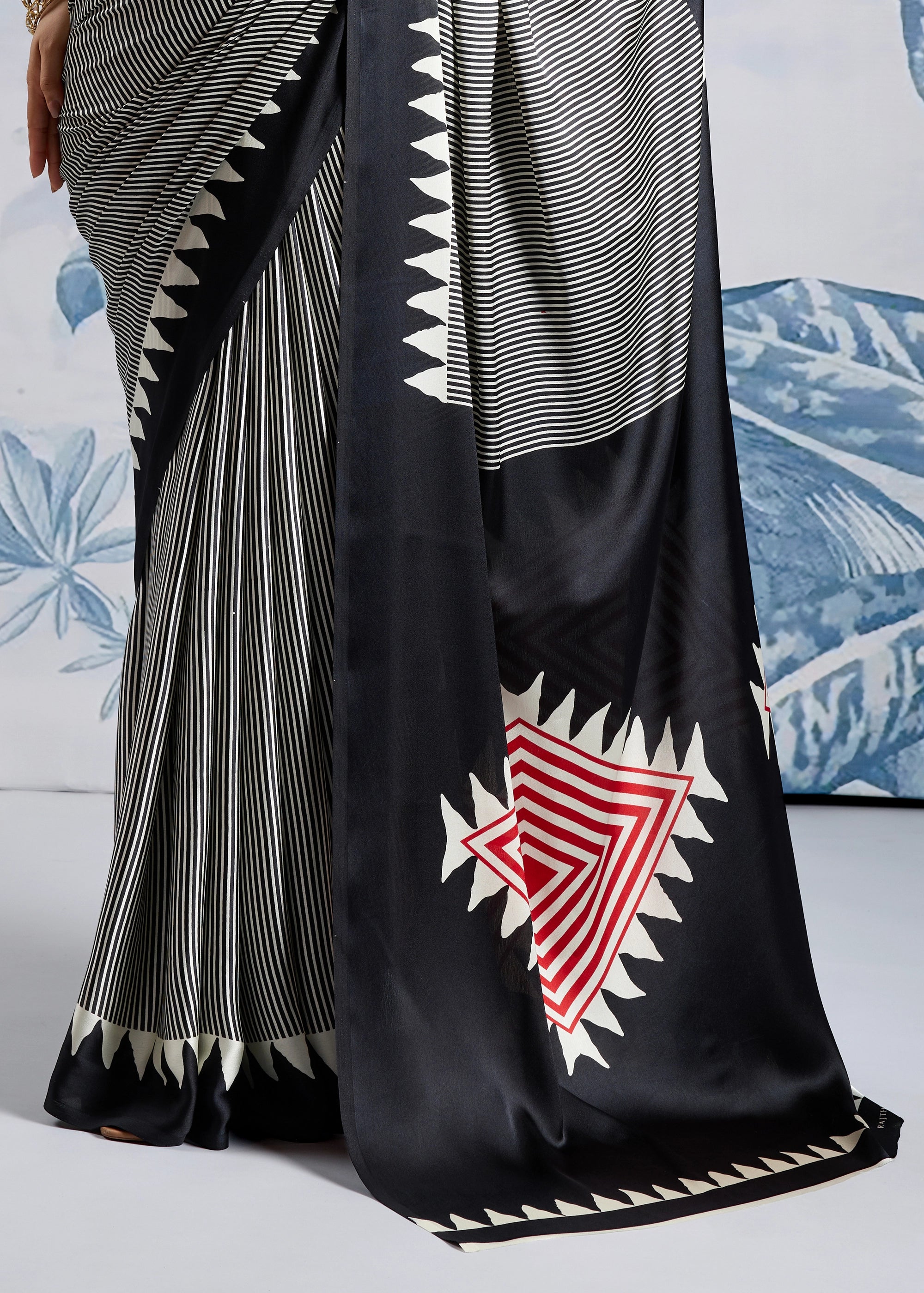 Black And White Printed Satin Silk Saree