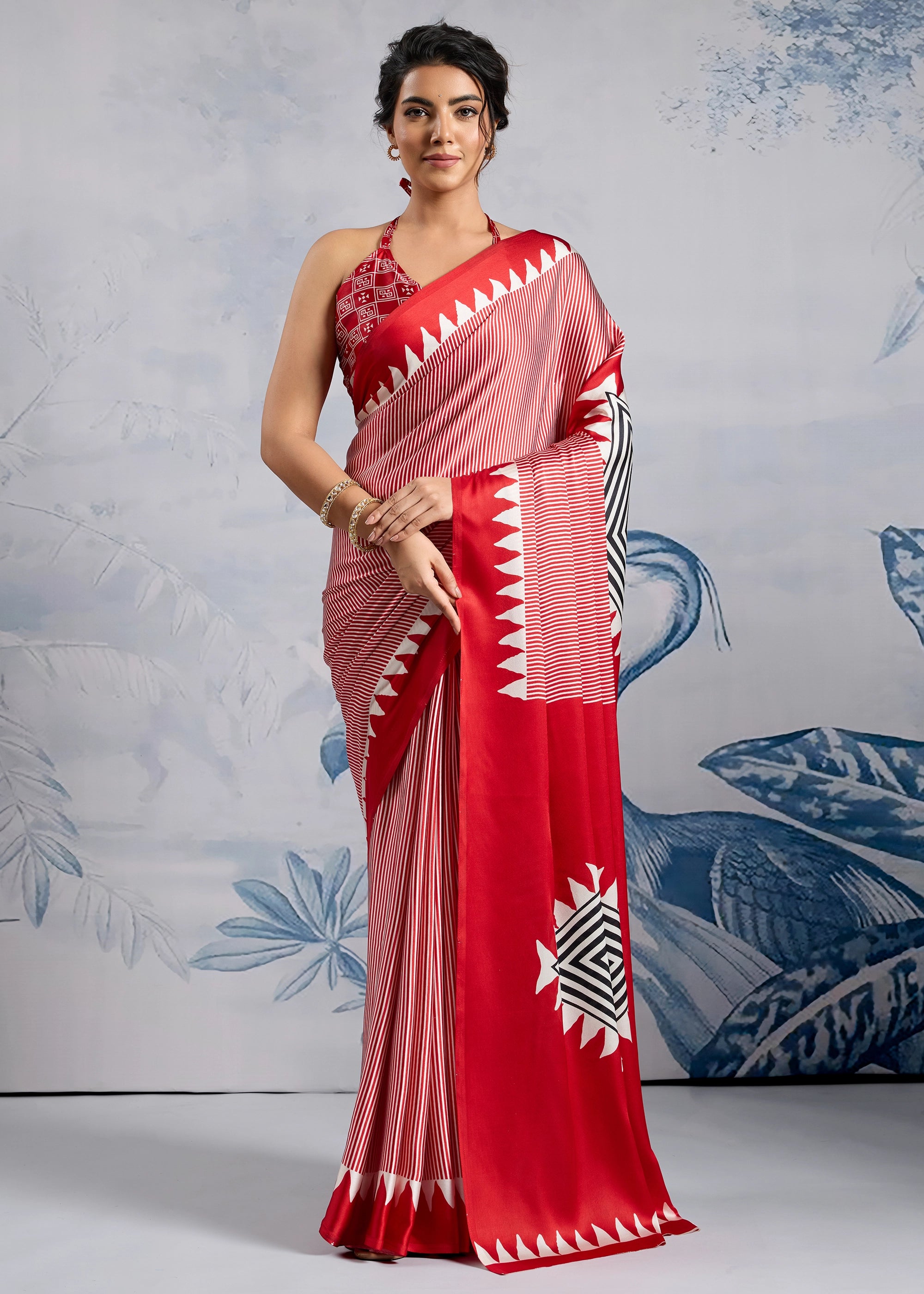 Make a lasting impression with our stunning Satin Silk Saree. Its sleek, opulent fabric provides a sophisticated base for the captivating Ajrakh printed pallu and blouse, infusing traditional charm into a modern design. Whether it's a festive gathering, a formal event, or a special evening out, this saree is designed to make you feel effortlessly elegant and uniquely beautiful.