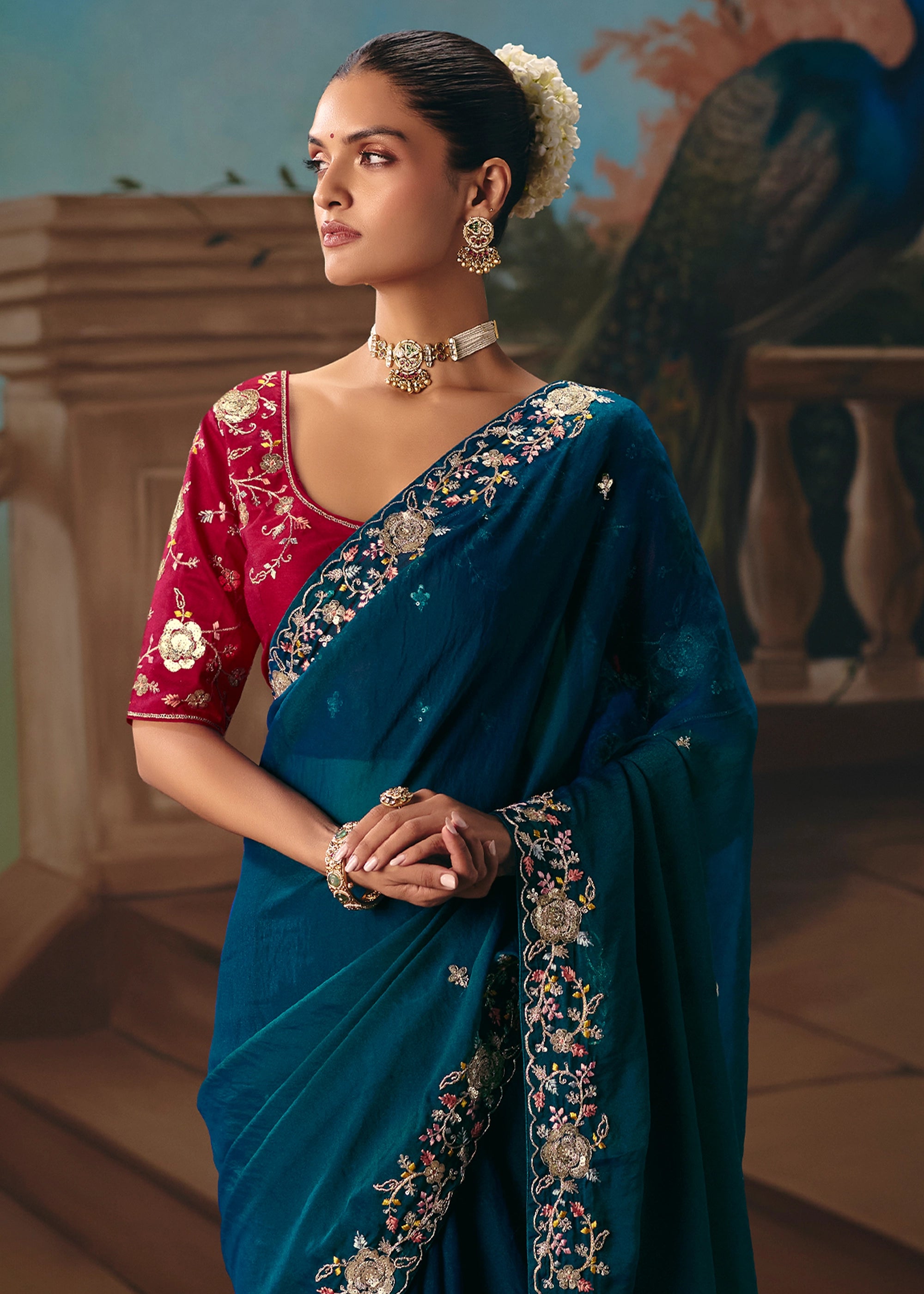 Coral Blue Embroidered Designer Saree