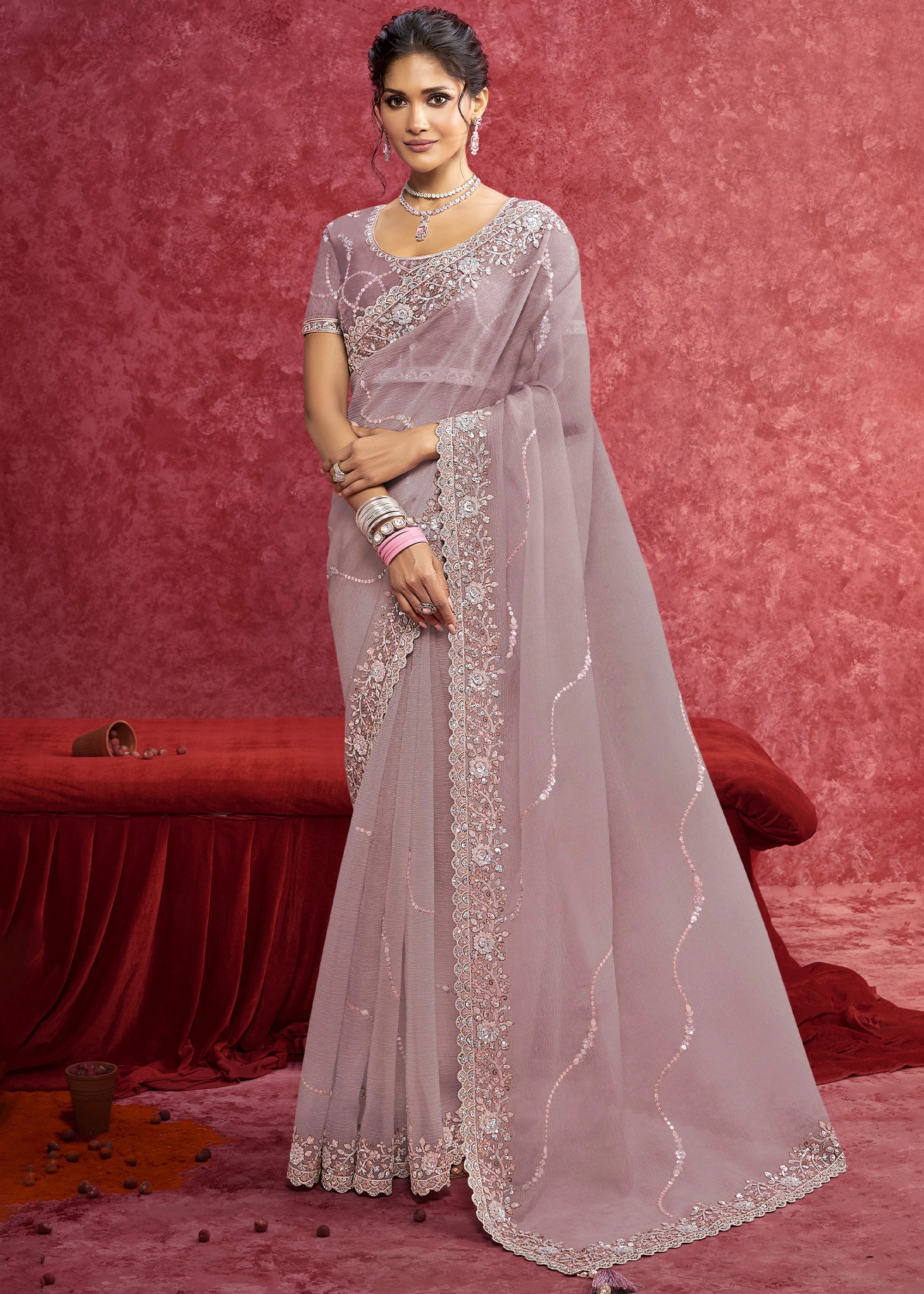 This elegant designer saree is crafted from premium fabric, featuring intricate heavy zari, resham, and sequin embroidery. The delicate stonework and lace border make it a perfect choice for weddings and special occasions.