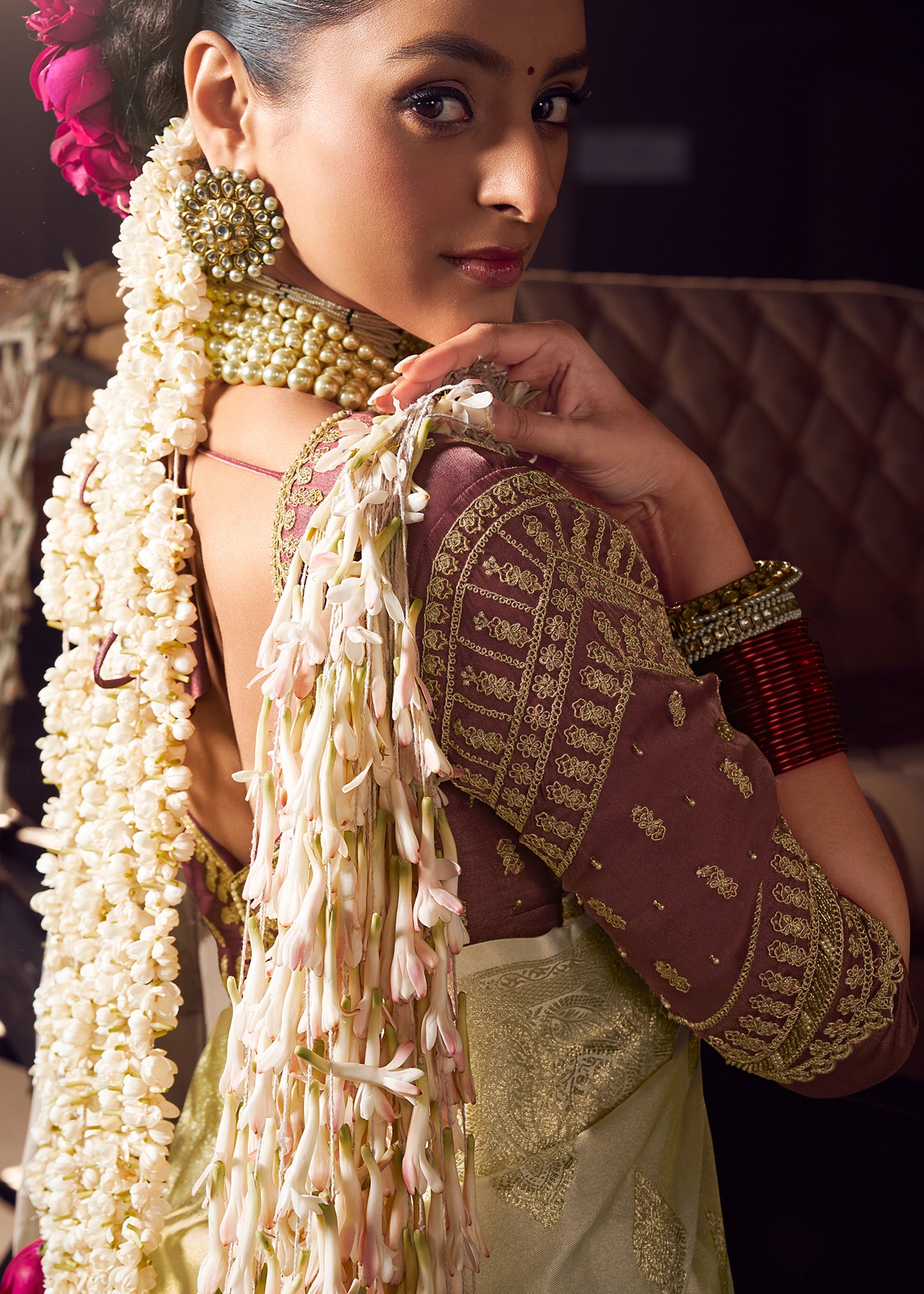 Enhance with a beautiful pattern, the vintage design enhances the royal look of the saree. Made with an intricate technique, this is a heritage of its own kind. With a rich border enveloping the saree, it is a stellar style statement.