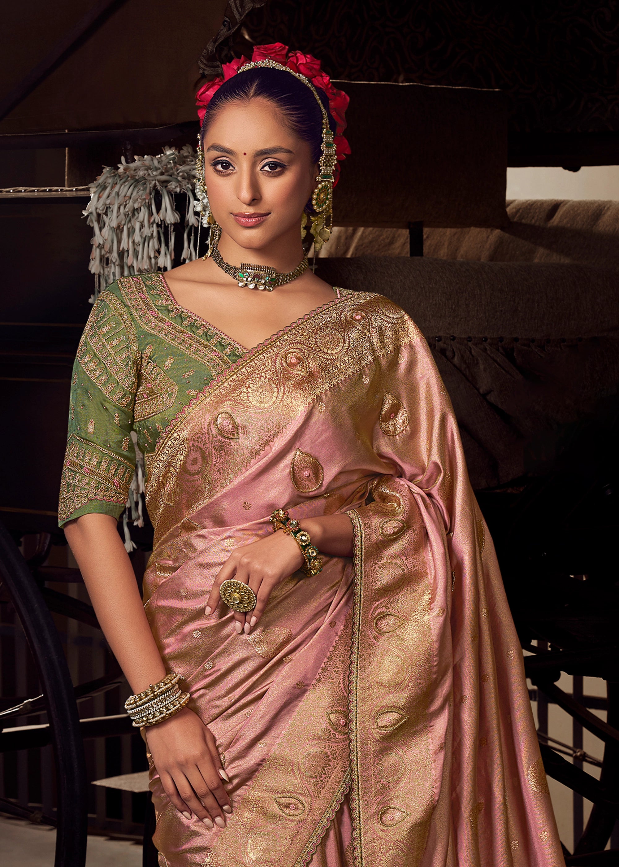 “Exclusive Offer” : Polignac Pink Woven Banarasi Satin Silk Saree