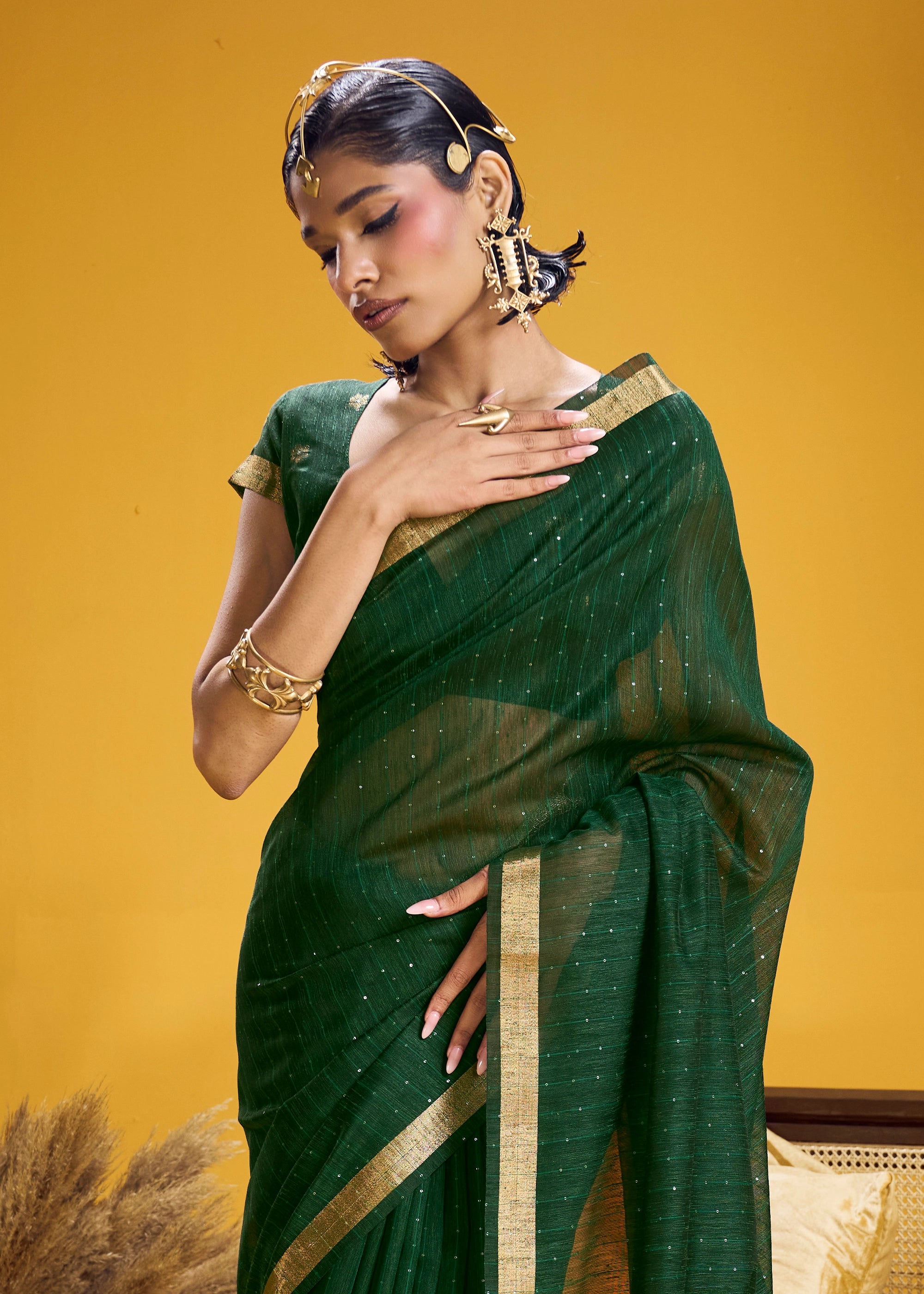 Forest Green Woven Cotton Silk Saree