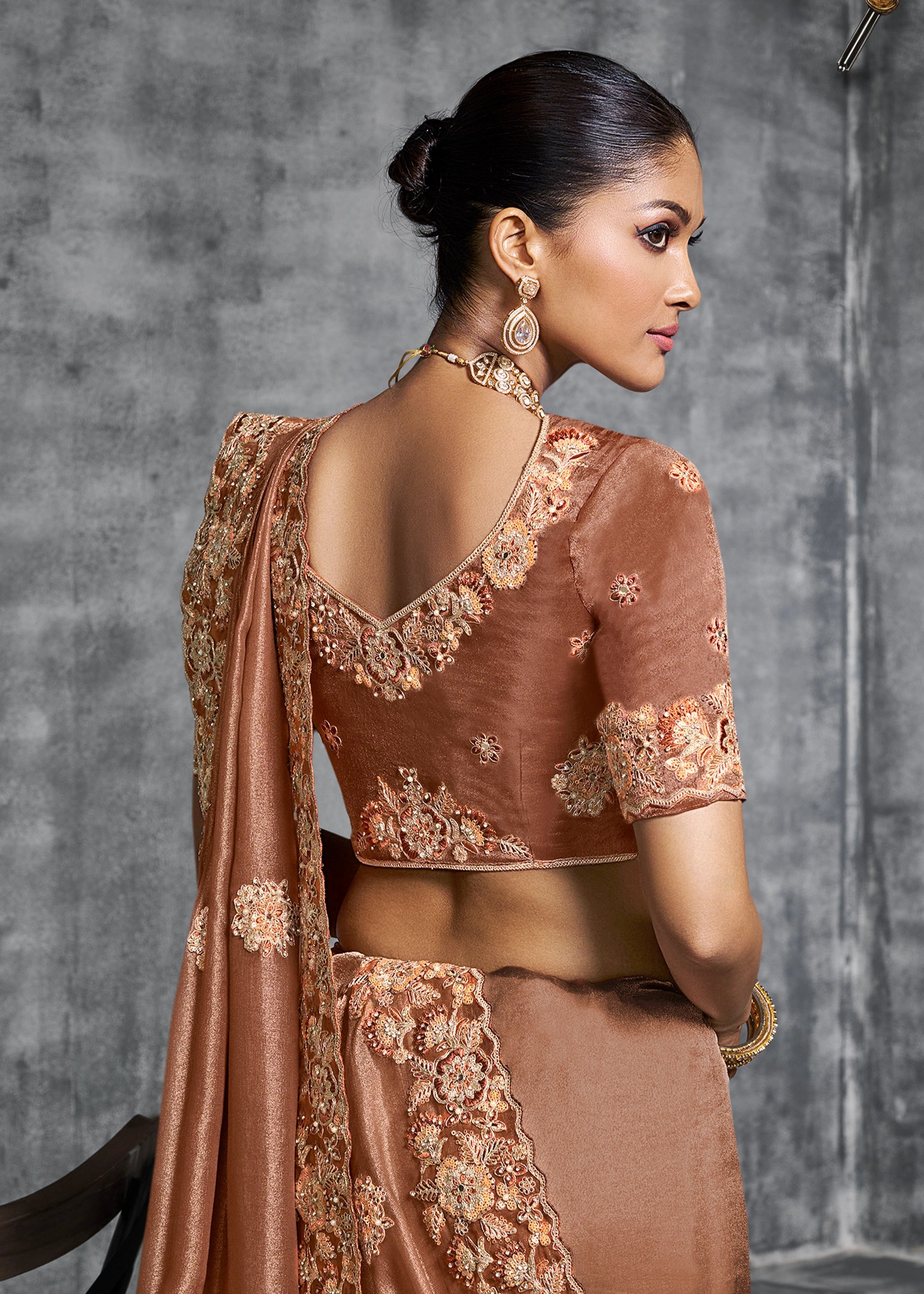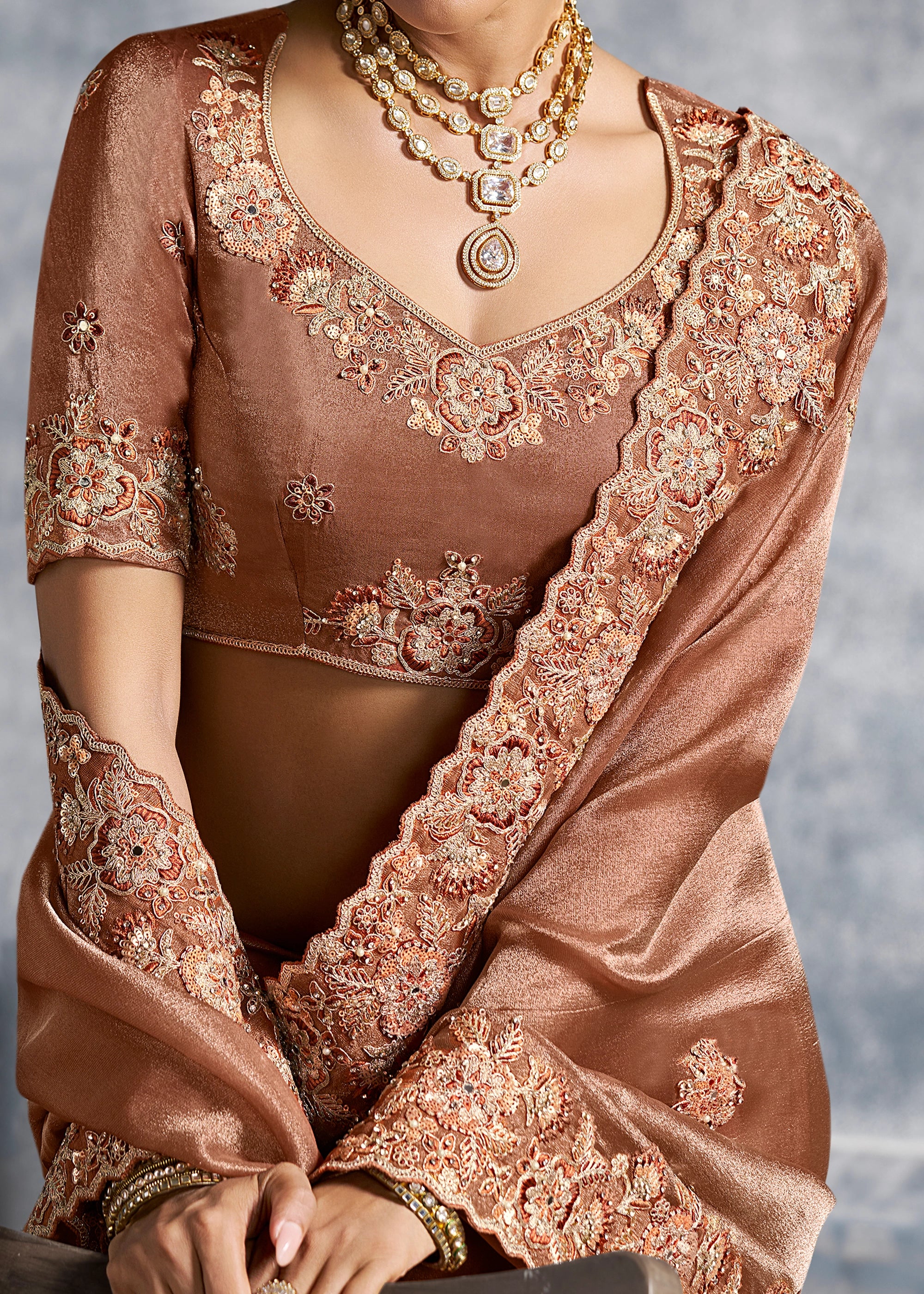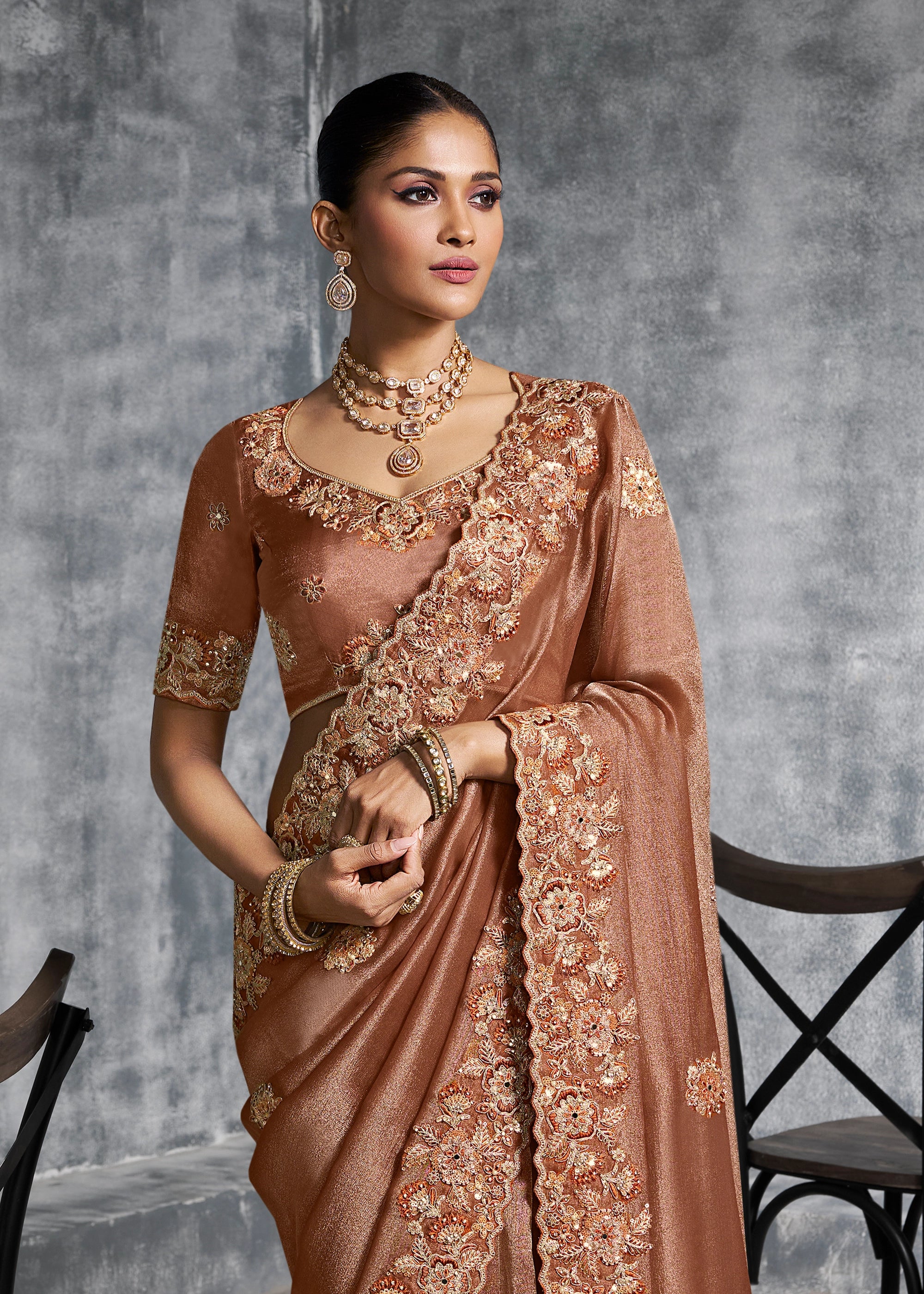 This luxurious Tissue Zari saree features intricate resham thread embroidery with floral motifs. It is heavily embellished with sequins, pearls, mirror work, and stonework, complemented by a heavy-work silk blouse.