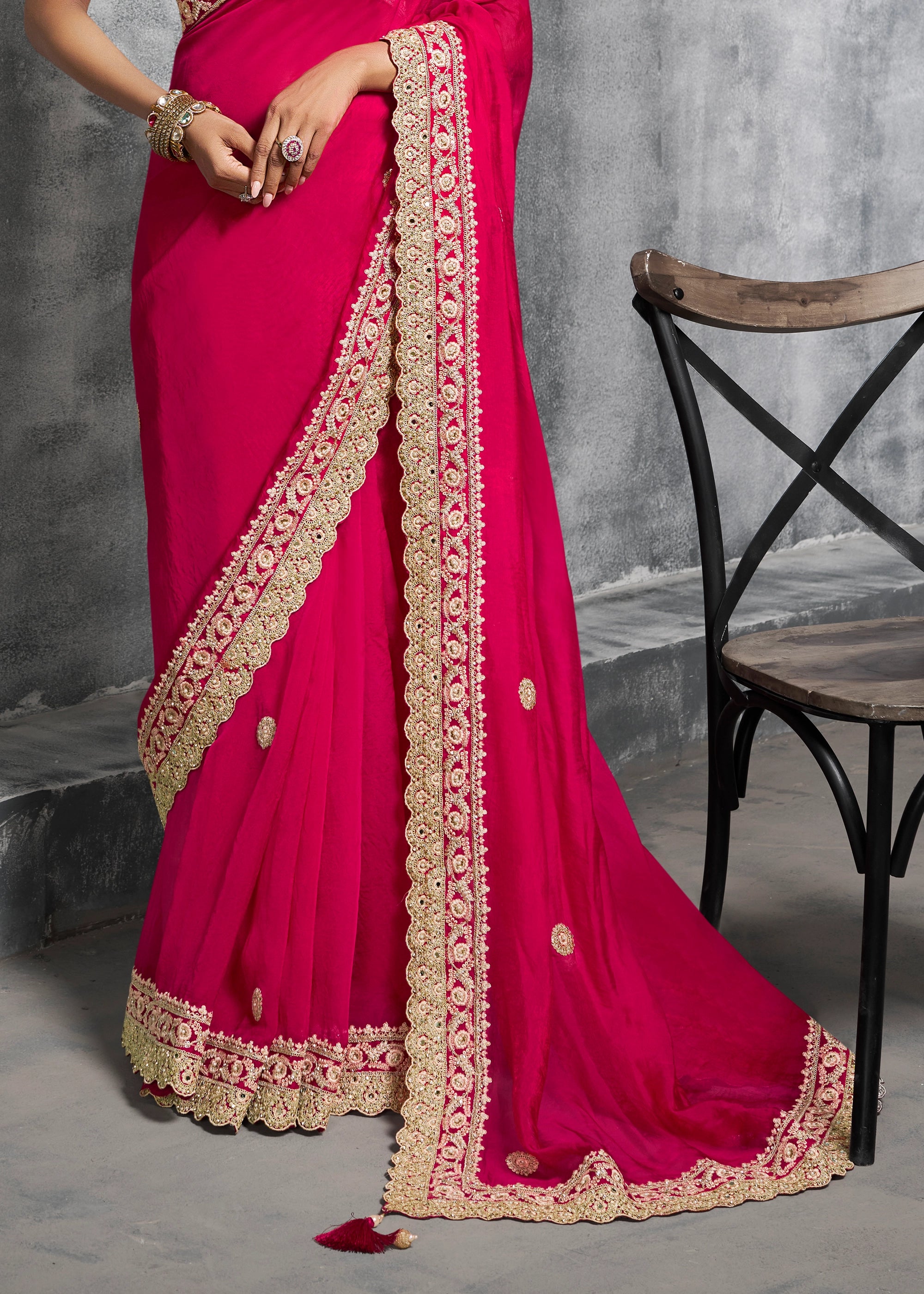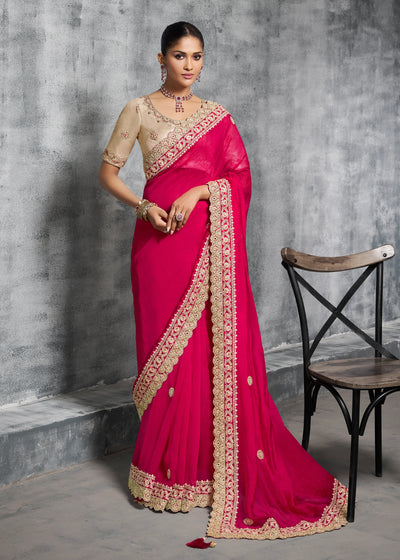 Hot Pink Embroidered Satin Silk Saree