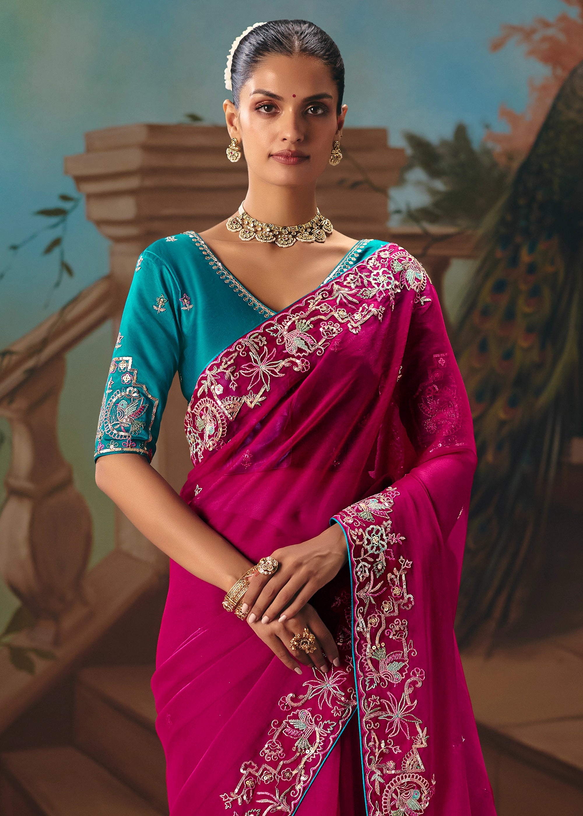 Magenta Pink Embroidered Designer Saree