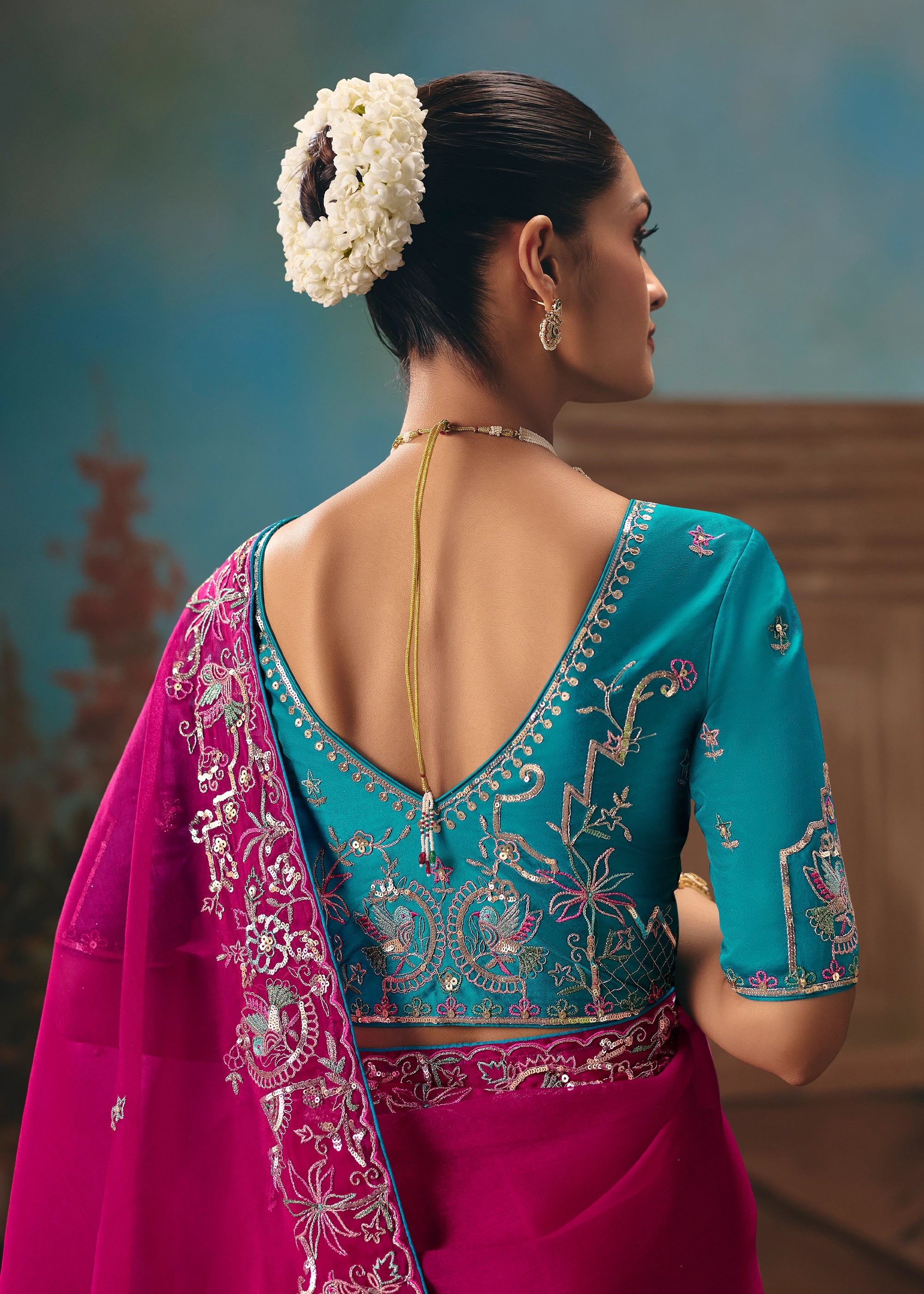 This saree exudes soft luxury and refined elegance. The highlight of the saree is its delicately embroidered blouse, adorned with intricate floral motifs, fine threadwork, and subtle embellishments that add depth and sophistication without overpowering the look.