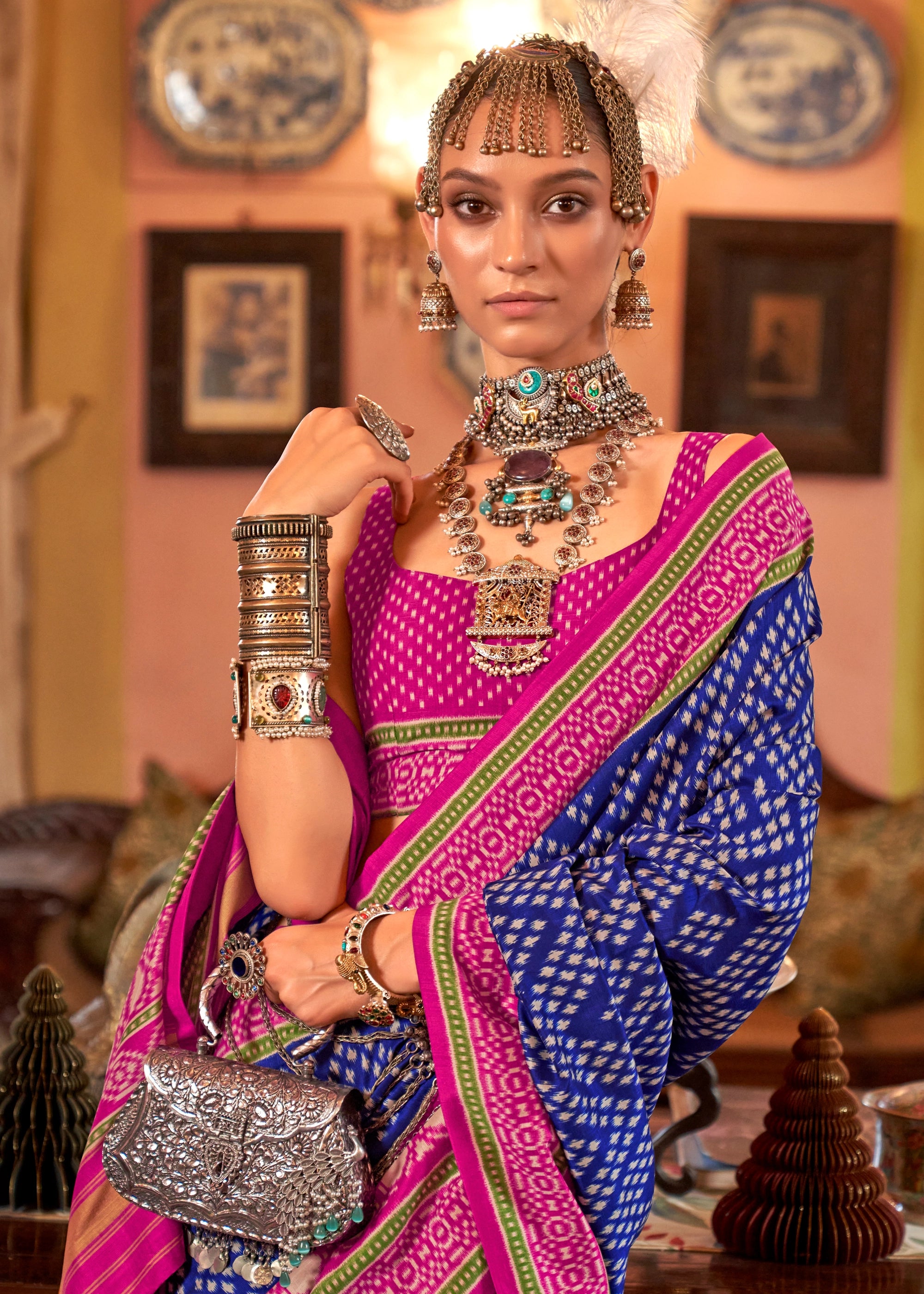 Experience the artistry of Patola in a modern form. This saree beautifully replicates the intricate double ikat weaving technique, resulting in mesmerizing patterns and a luxurious feel. The vibrant colors and elegant drape make it a truly special piece.