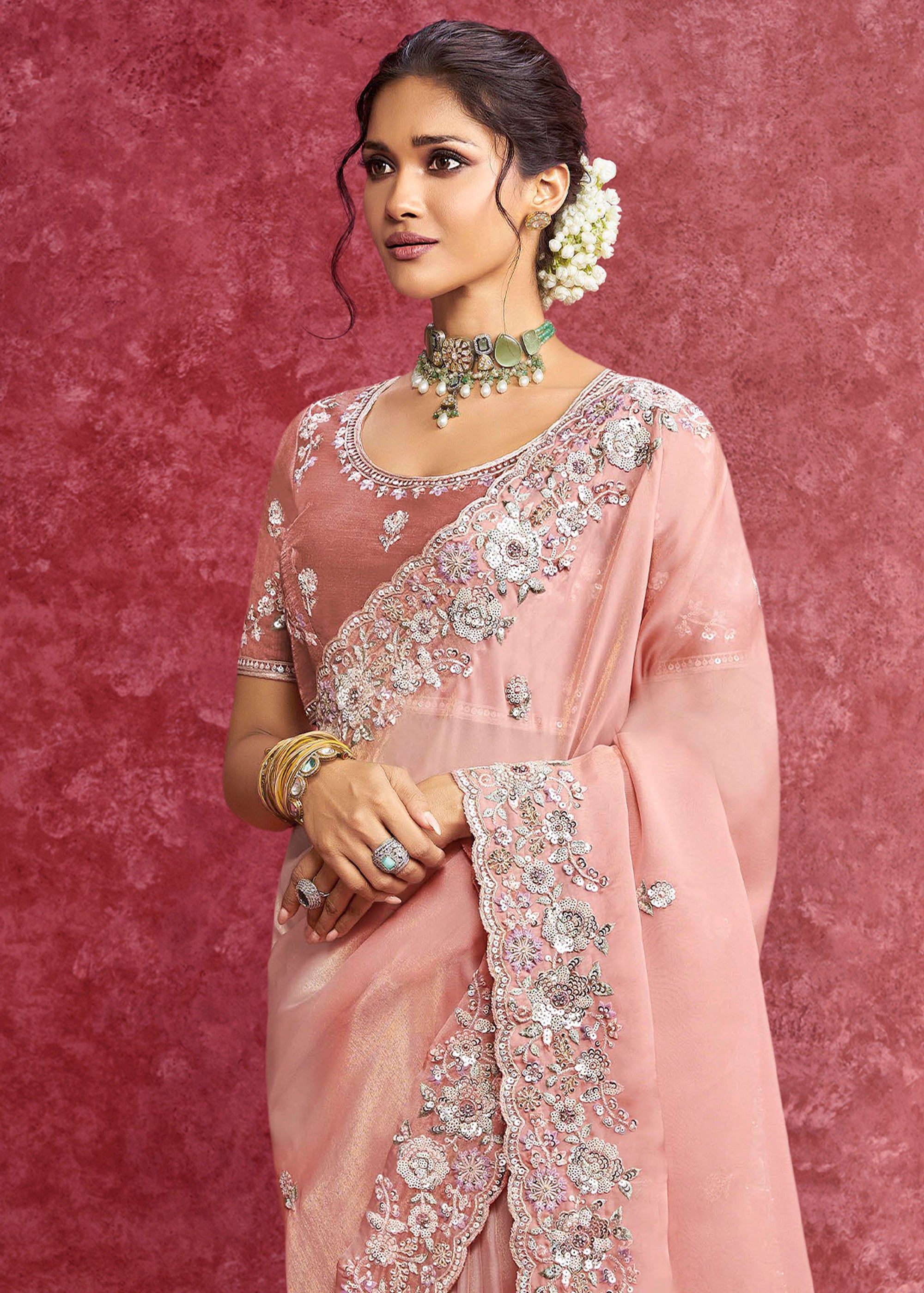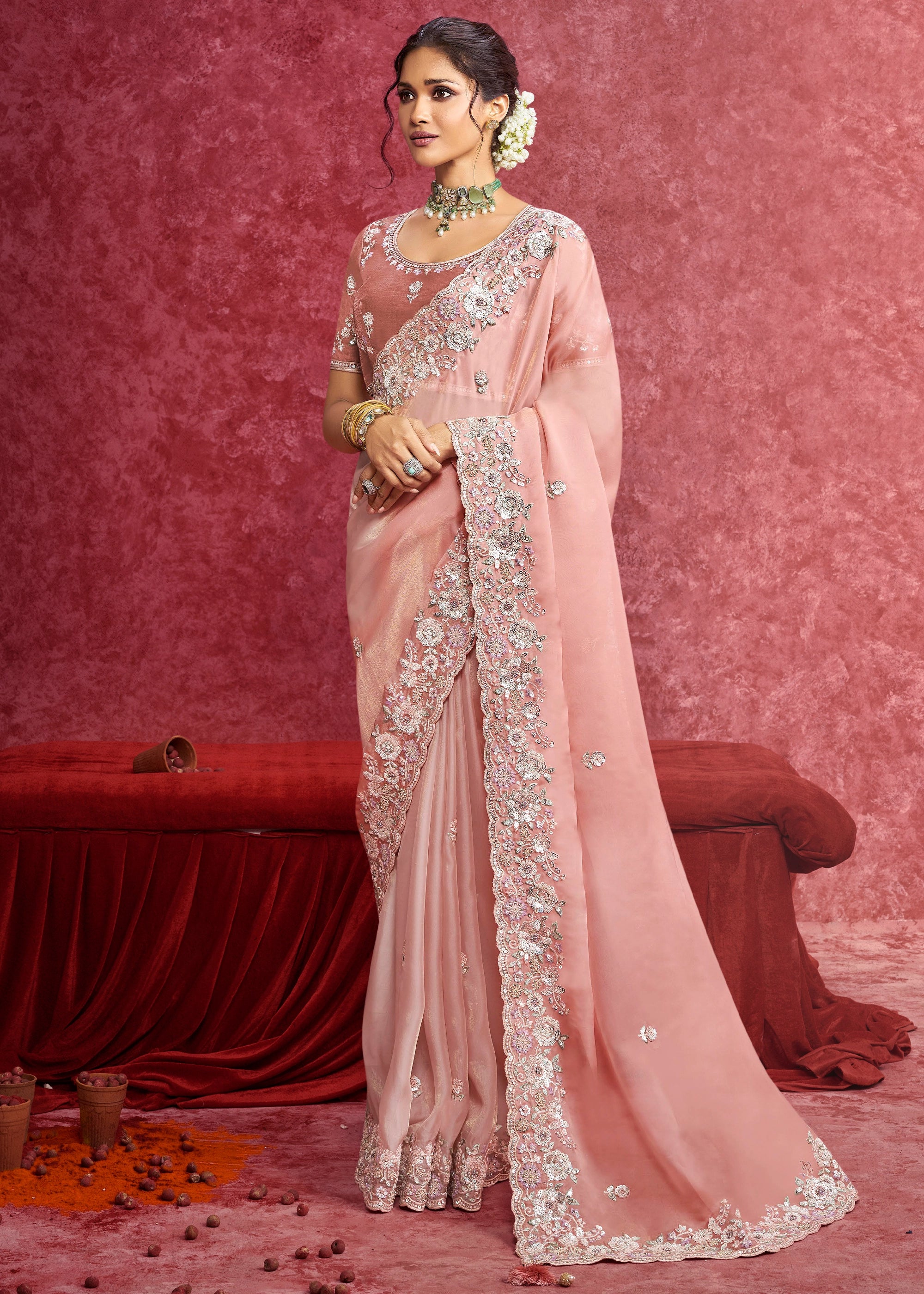 This elegant designer saree is crafted from premium fabric, featuring intricate heavy zari, resham, and sequin embroidery. The delicate stonework and lace border make it a perfect choice for weddings and special occasions.