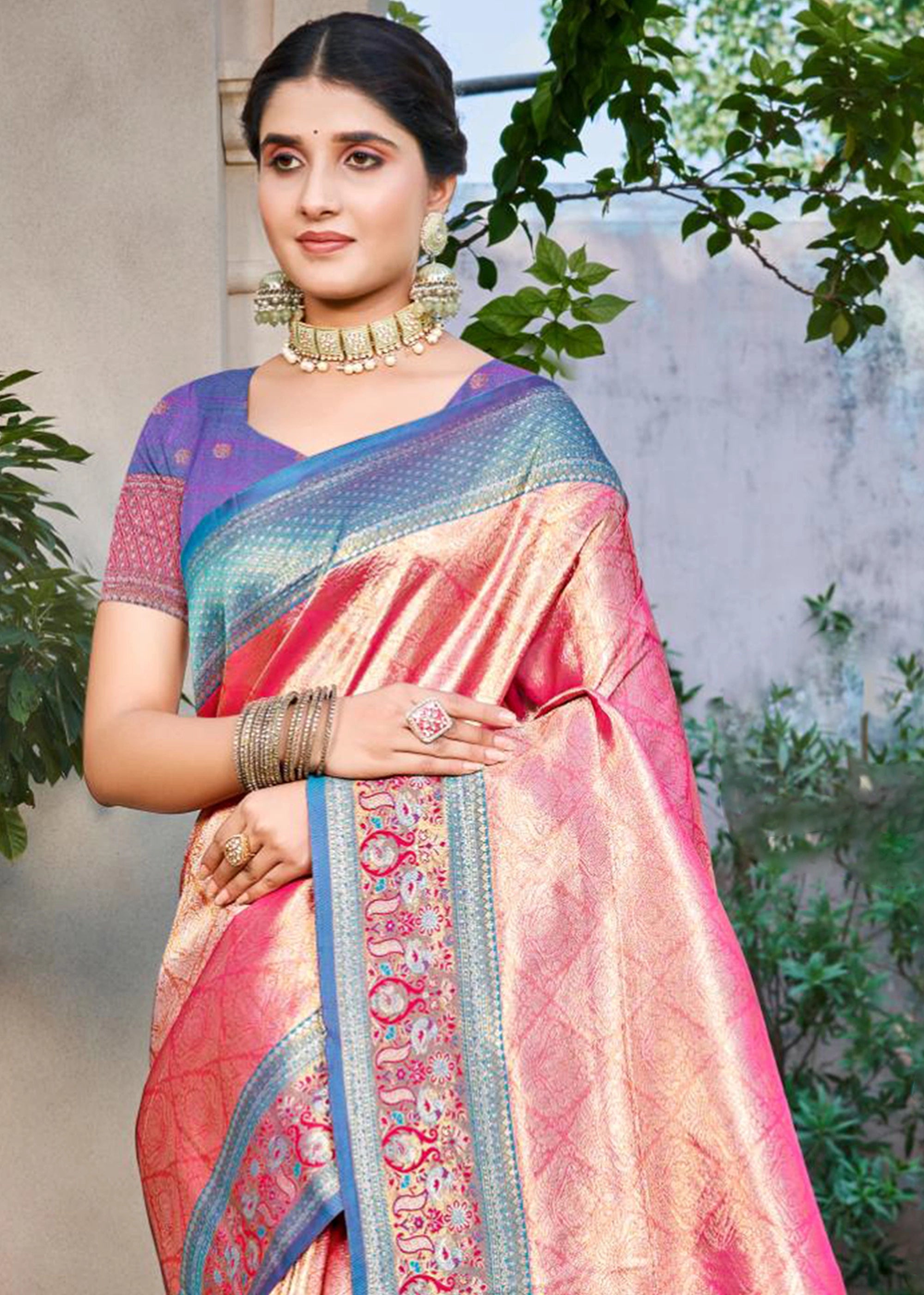 Elevate your wardrobe with this exquisite Kanjivaram silk saree, a radiant masterpiece of Indian textile artistry. Featuring intricate weaving work and a striking blue contrast border, it is perfect for weddings and festive occasions.