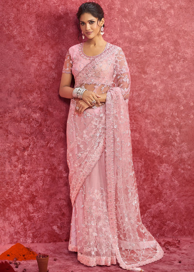 This elegant designer saree is crafted from premium fabric, featuring intricate heavy zari, resham, and sequin embroidery.The delicate stonework and lace border make it a perfect choice for weddings and special occasions.