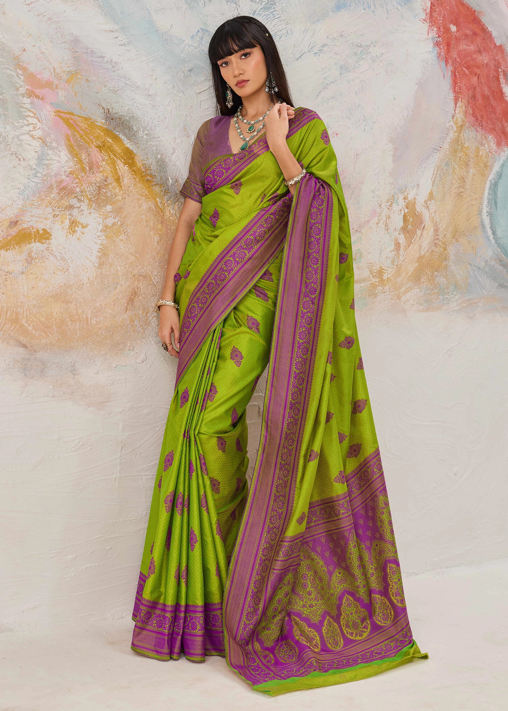 Saree Length : 5.5 meter Blouse Piece : 0.8 meter Fabric : Blended Kanjivaram silk Time to Ship : 7 to 8 working days