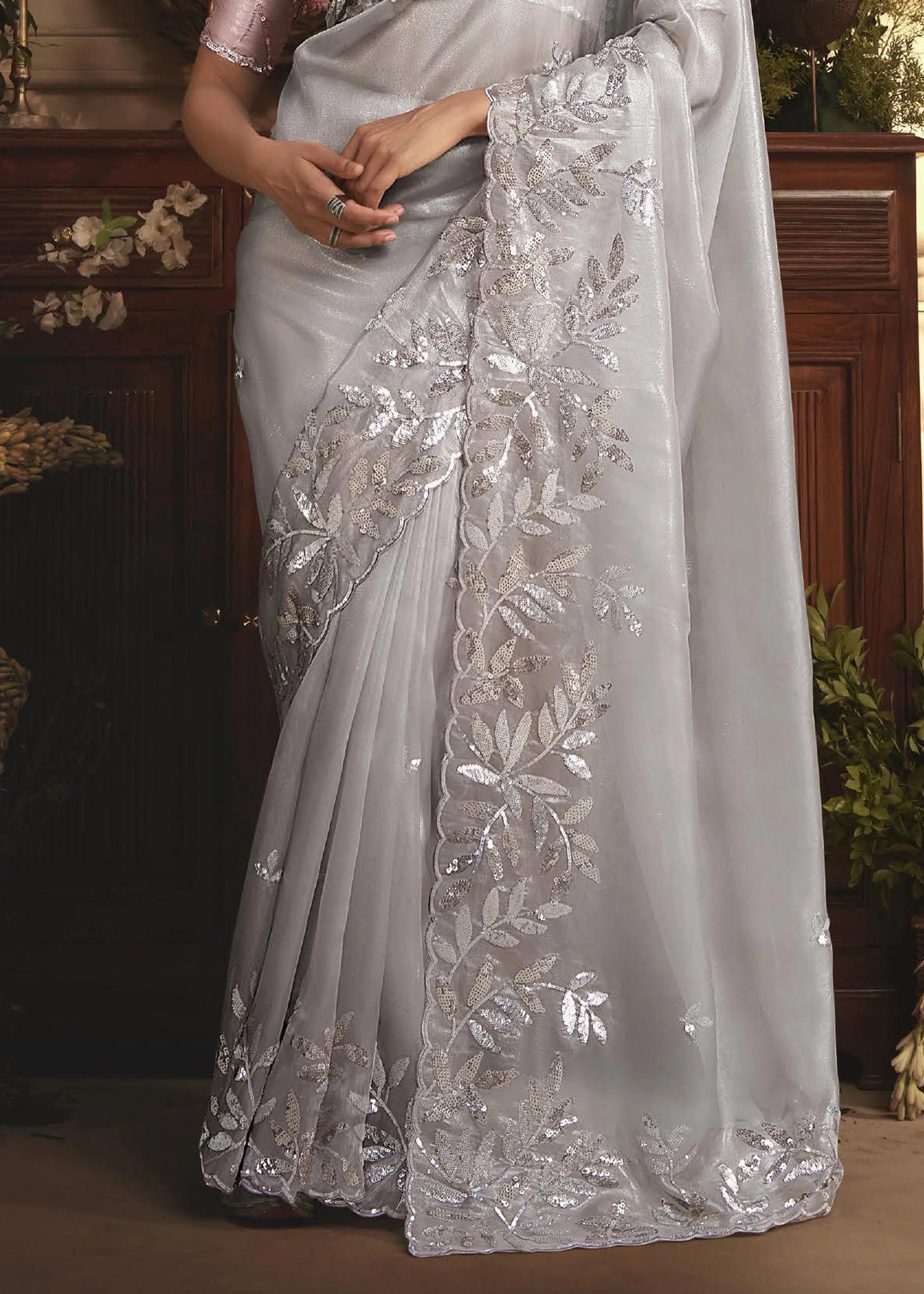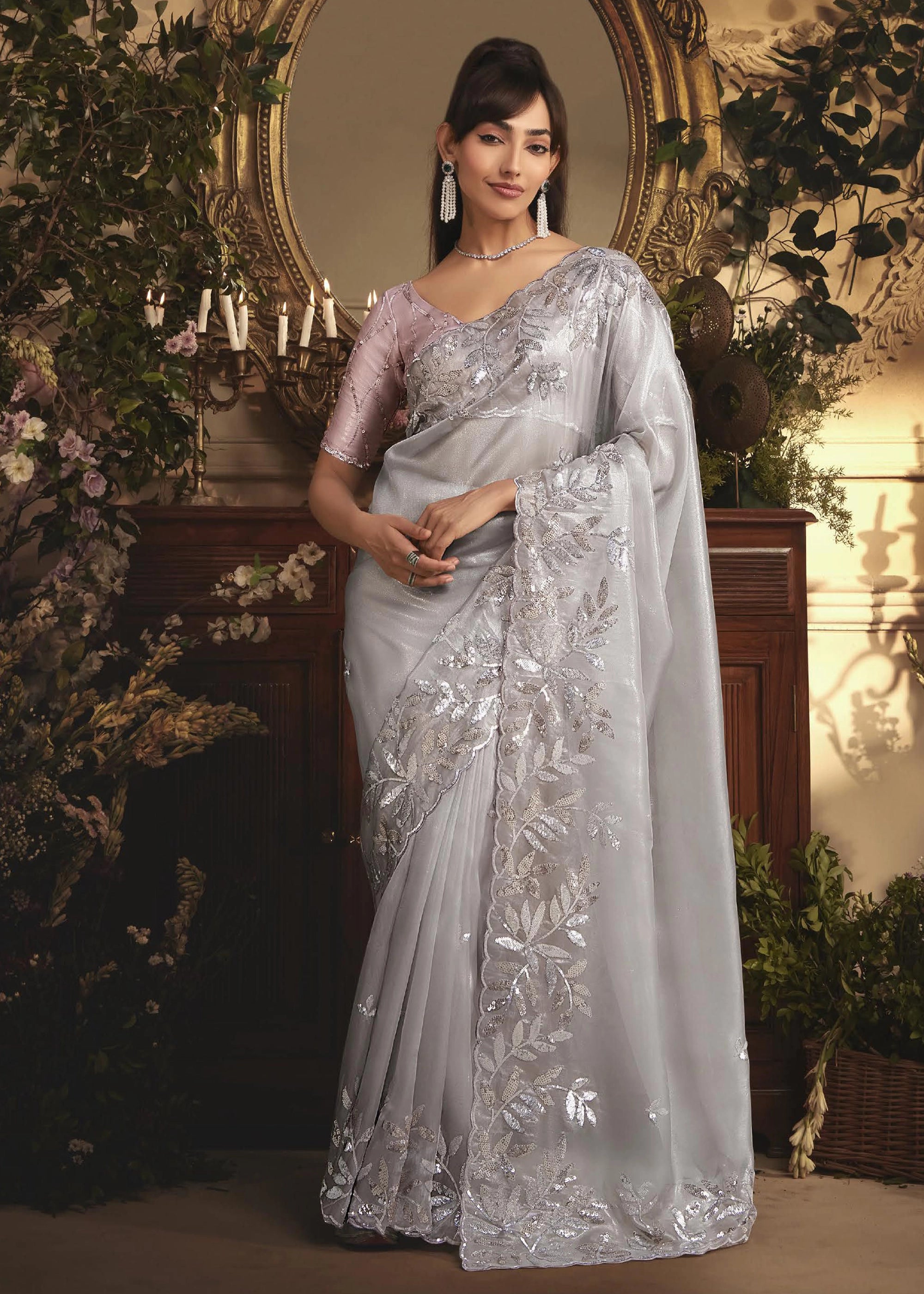 Redefine grace. This Tissue Organza saree's lightweight drape and heavy embroidered stone border offer unforgettable presence. The matching butta...