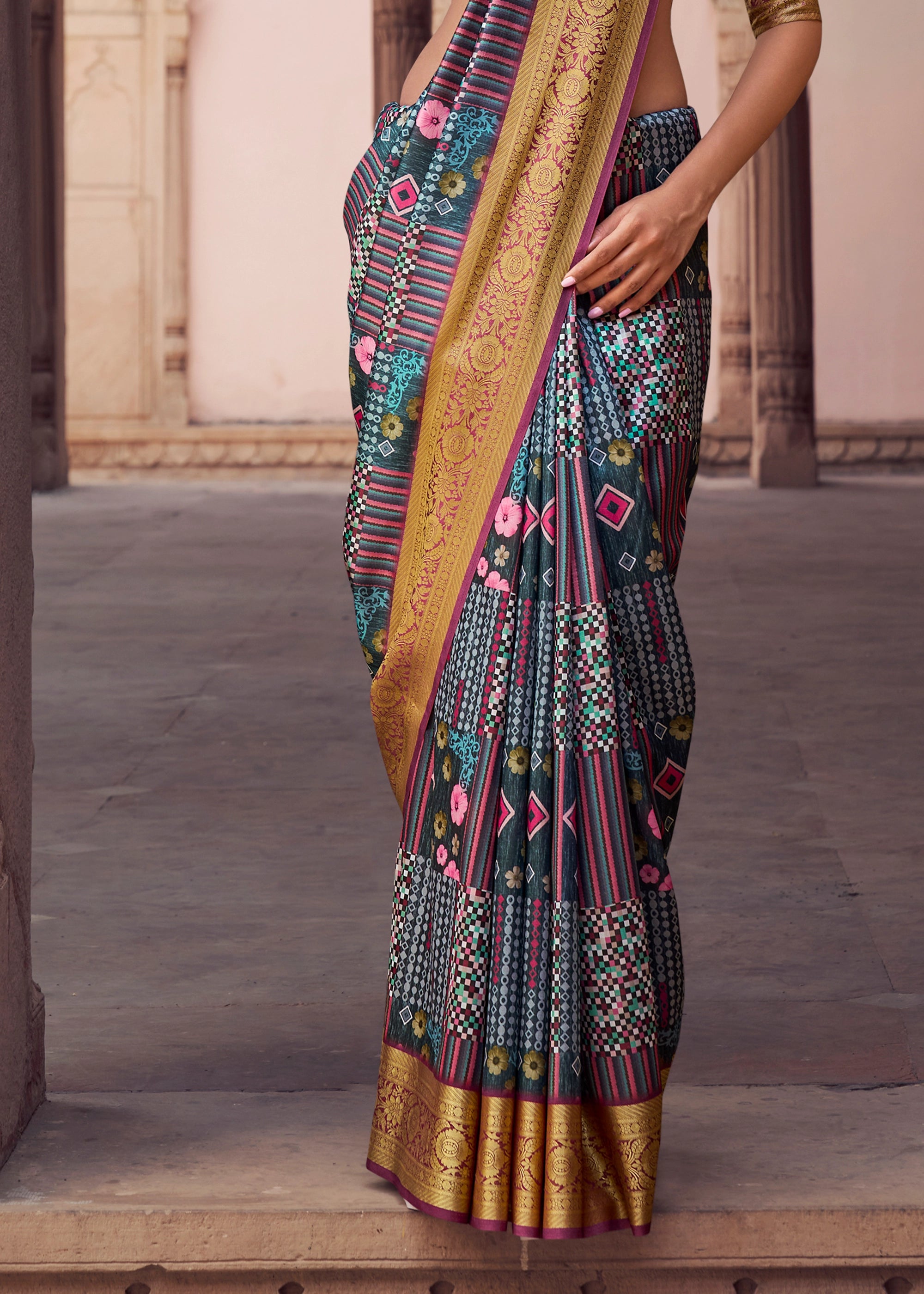 Purple And Blue Banarasi Digital Printed Silk Saree