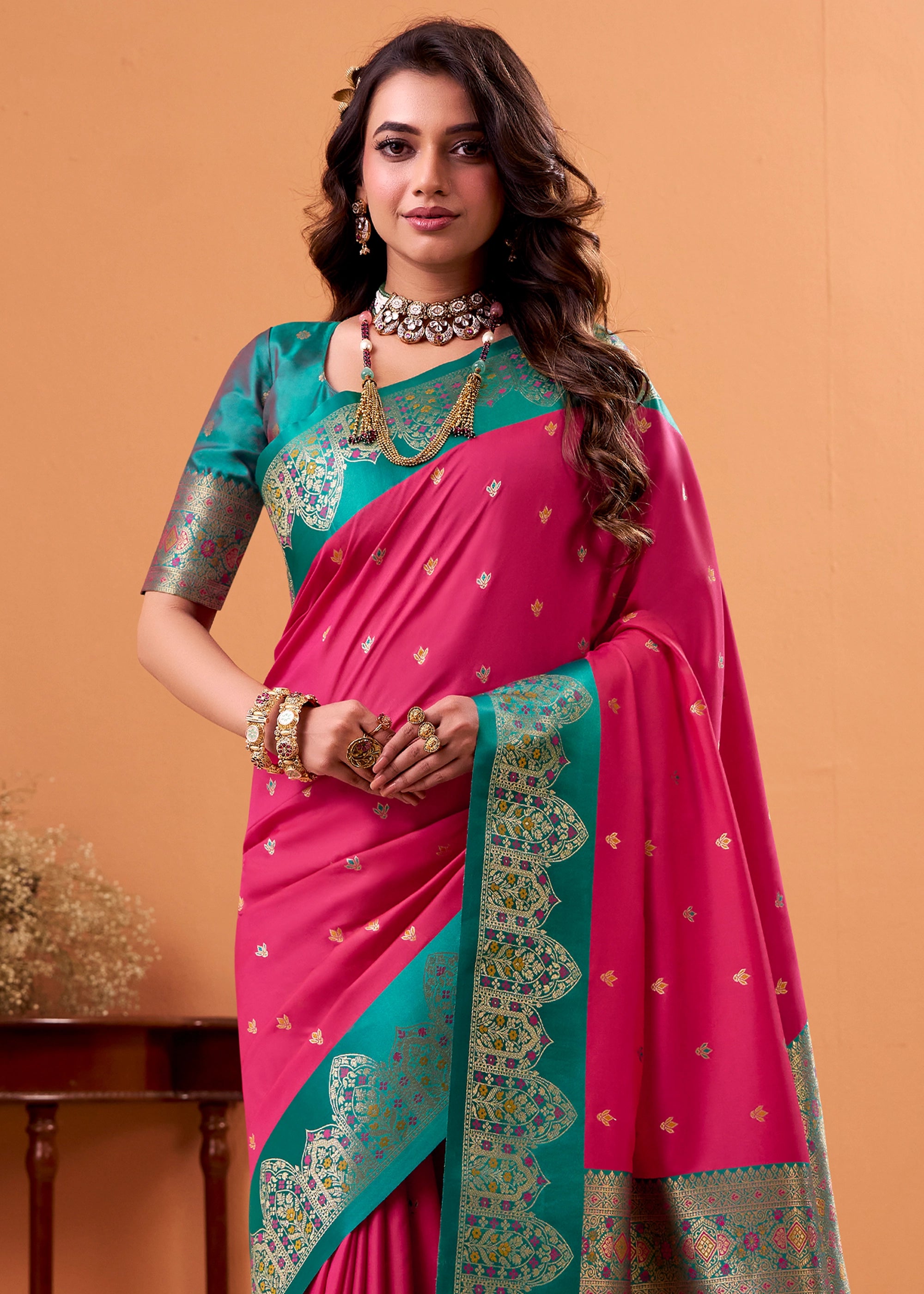 Radiate royal elegance with this luxurious Banarasi Satin Silk Saree, a perfect fusion of heritage and contemporary charm....