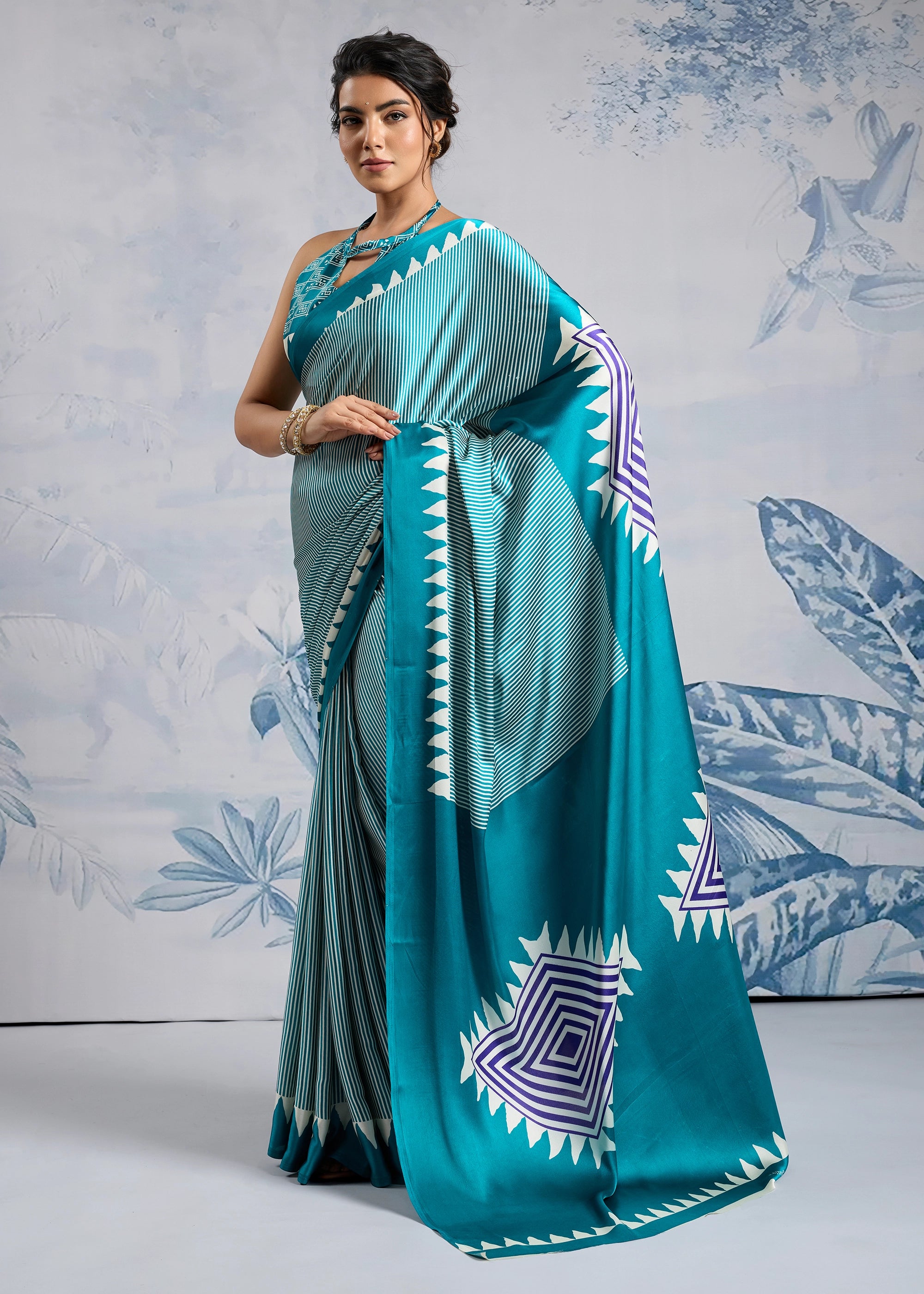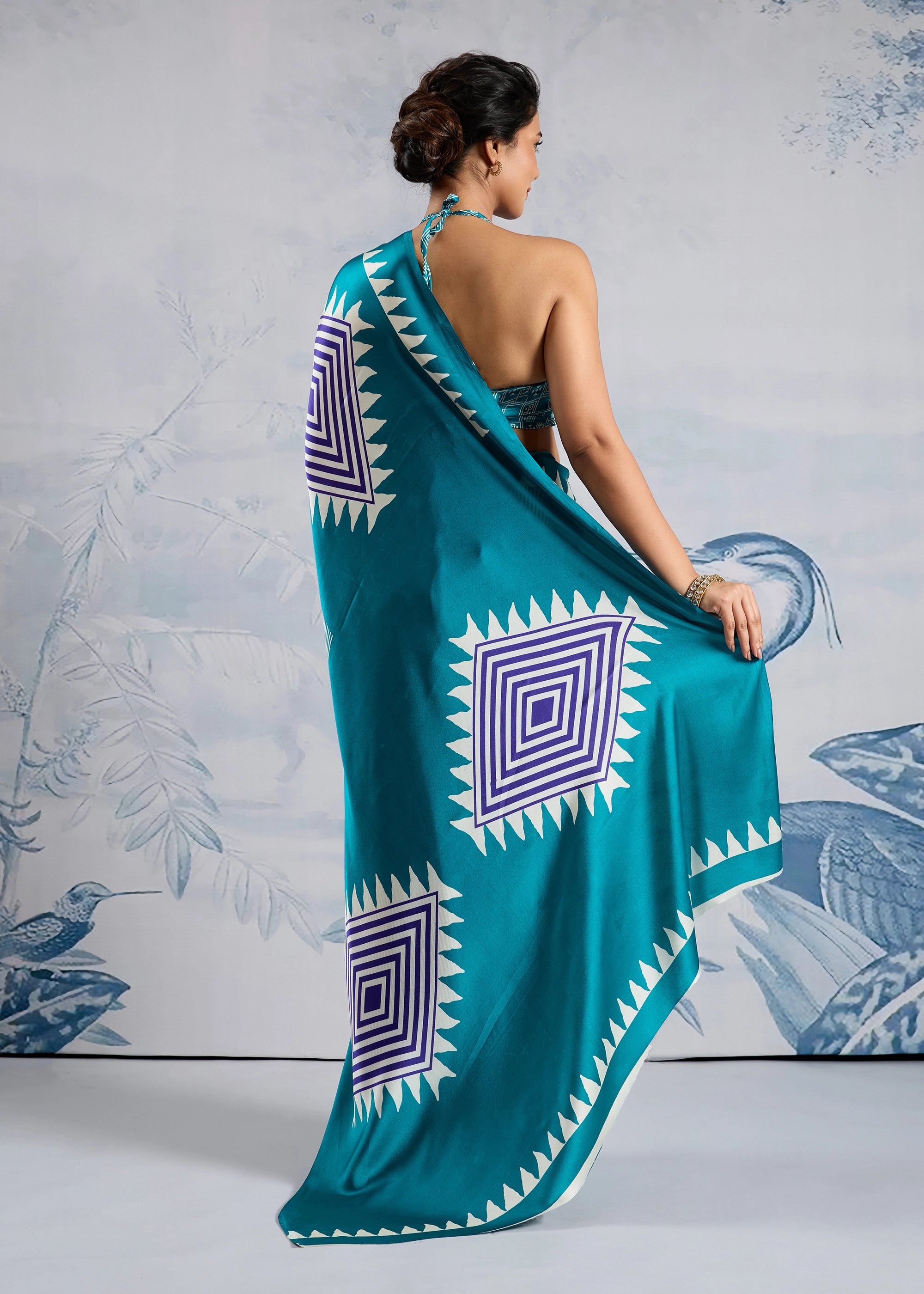 Make a lasting impression with our stunning Satin Silk Saree. Its sleek, opulent fabric provides a sophisticated base for the captivating Ajrakh printed pallu and blouse, infusing traditional charm into a modern design. Whether it's a festive gathering, a formal event, or a special evening out, this saree is designed to make you feel effortlessly elegant and uniquely beautiful.